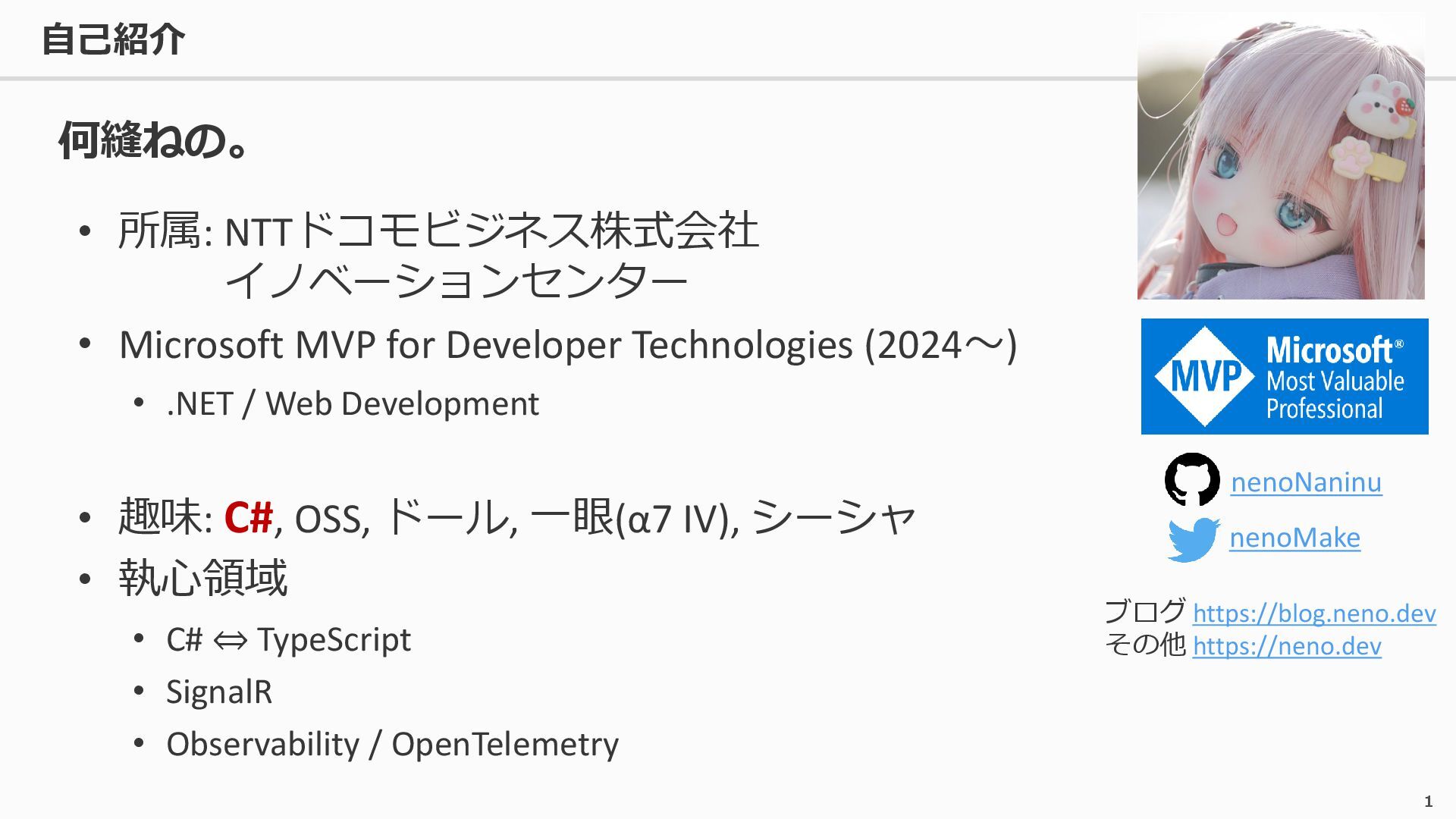 Developer Technologies (2024~) • .NET / Web Development • 趣味: C#, OSS, ドール, 一眼(α7 IV), シーシャ • 執心領域 • C# ⇔ TypeScript • SignalR • Observability / OpenTelemetry 何縫ねの。 nenoNaninu nenoMake ブログ https://blog.neno.dev その他 https://neno.dev