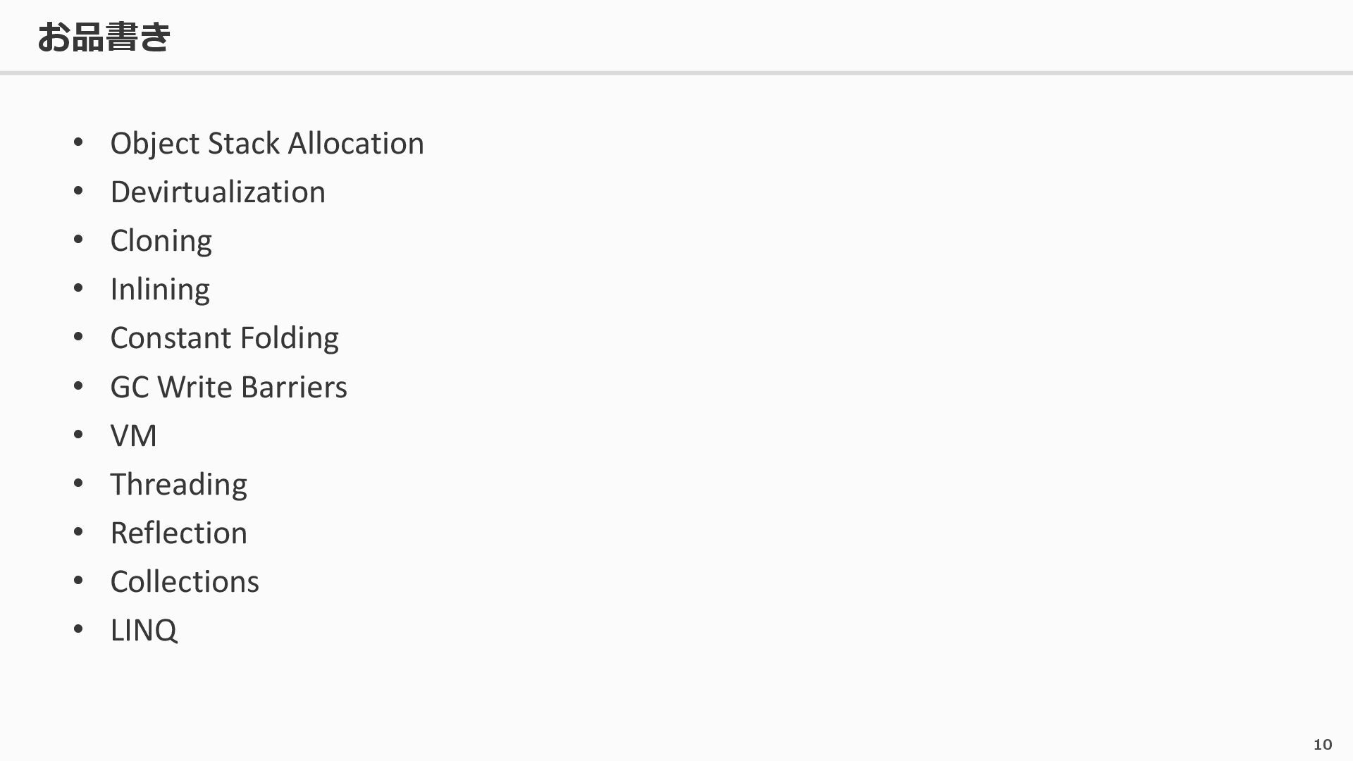• Inlining • Constant Folding • GC Write Barriers • VM • Threading • Reflection • Collections • LINQ