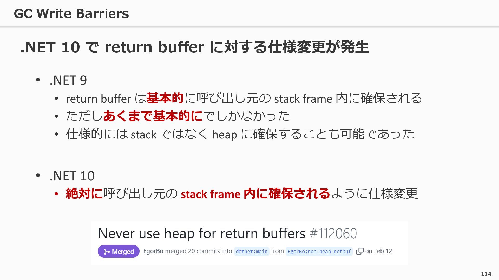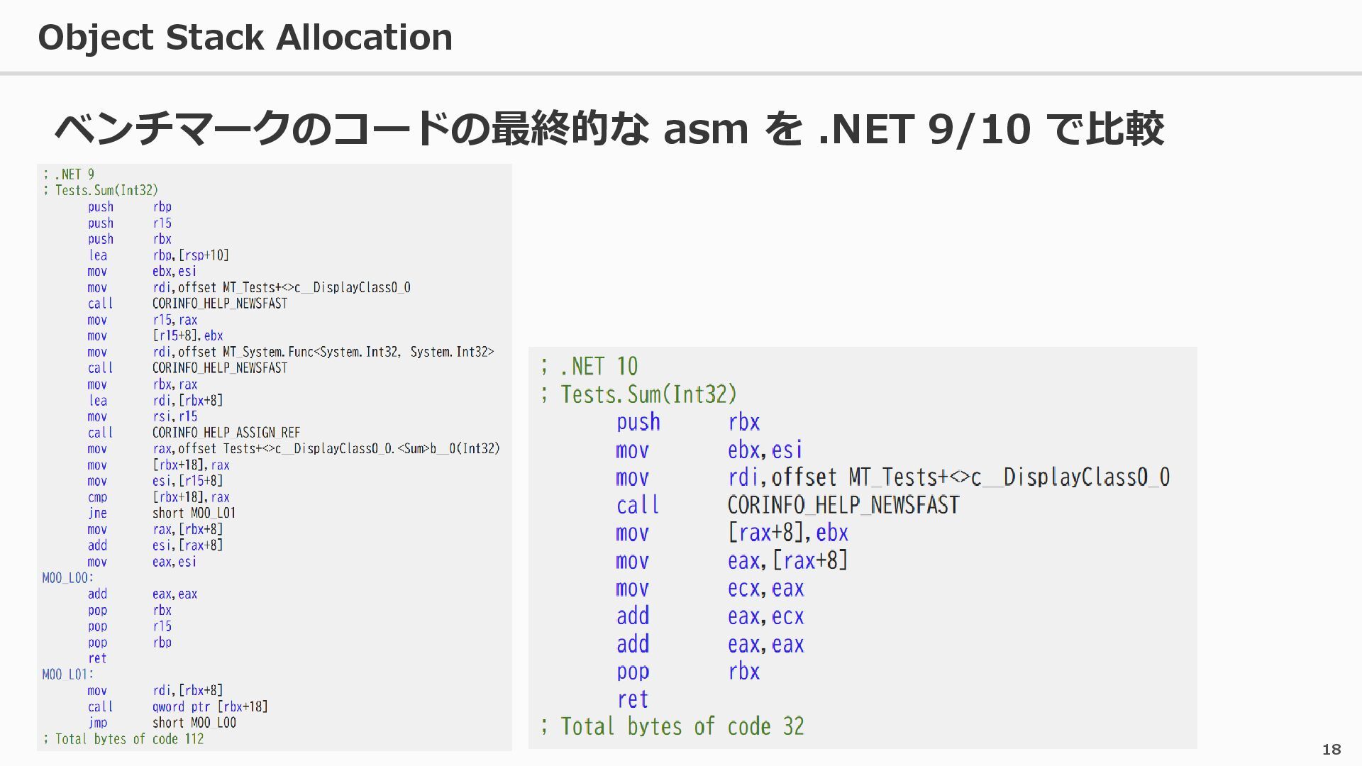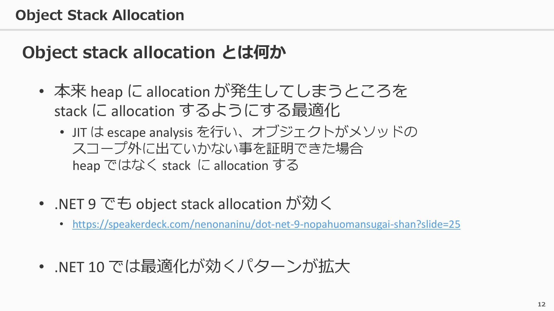heap に allocation が発生してしまうところを stack に allocation するようにする最適化 • JIT は escape analysis を行い、オブジェクトがメソッドの スコープ外に出ていかない事を証明できた場合 heap ではなく stack に allocation する • .NET 9 でも object stack allocation が効く • https://speakerdeck.com/nenonaninu/dot-net-9-nopahuomansugai-shan?slide=25 • .NET 10 では最適化が効くパターンが拡大