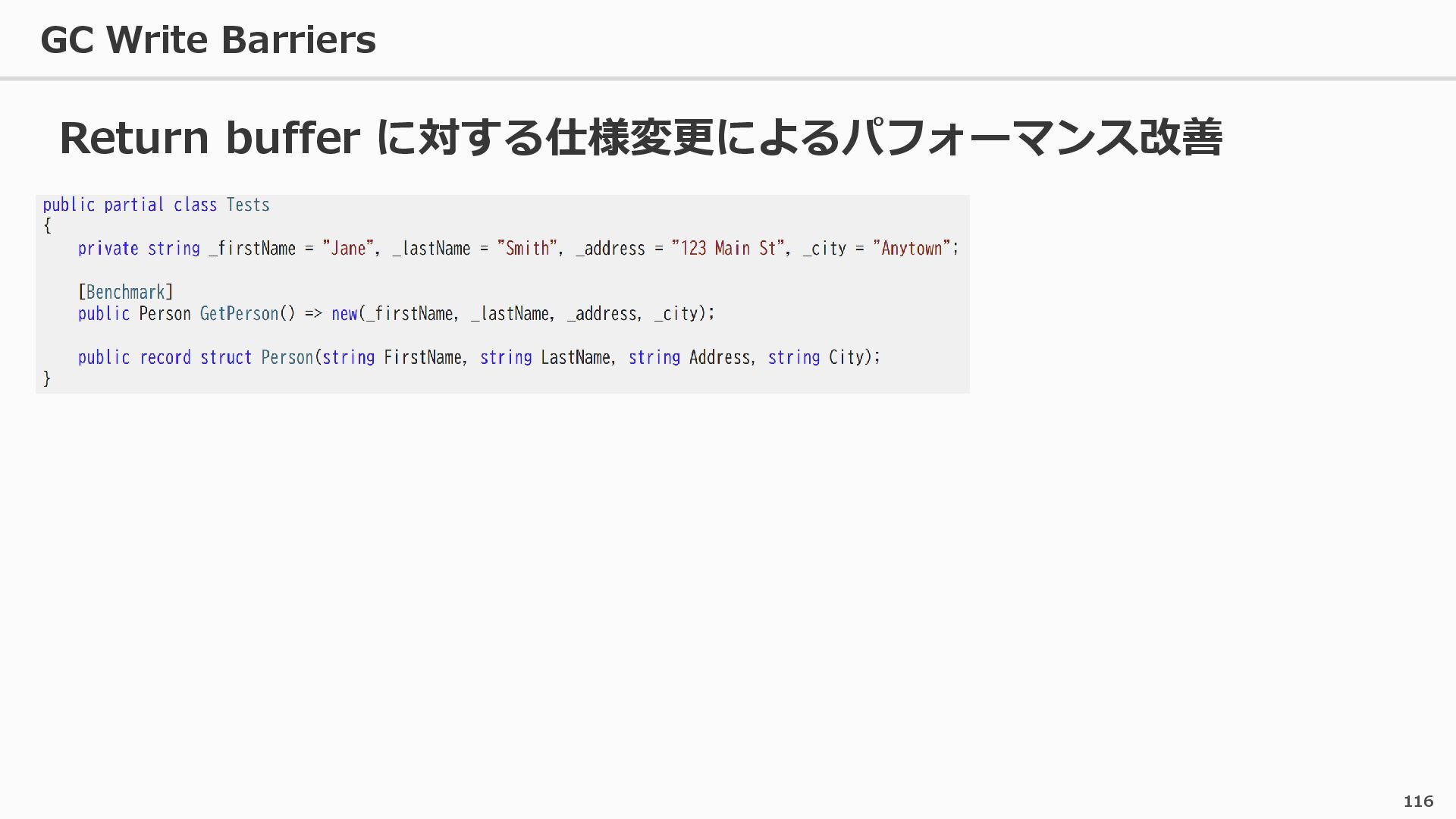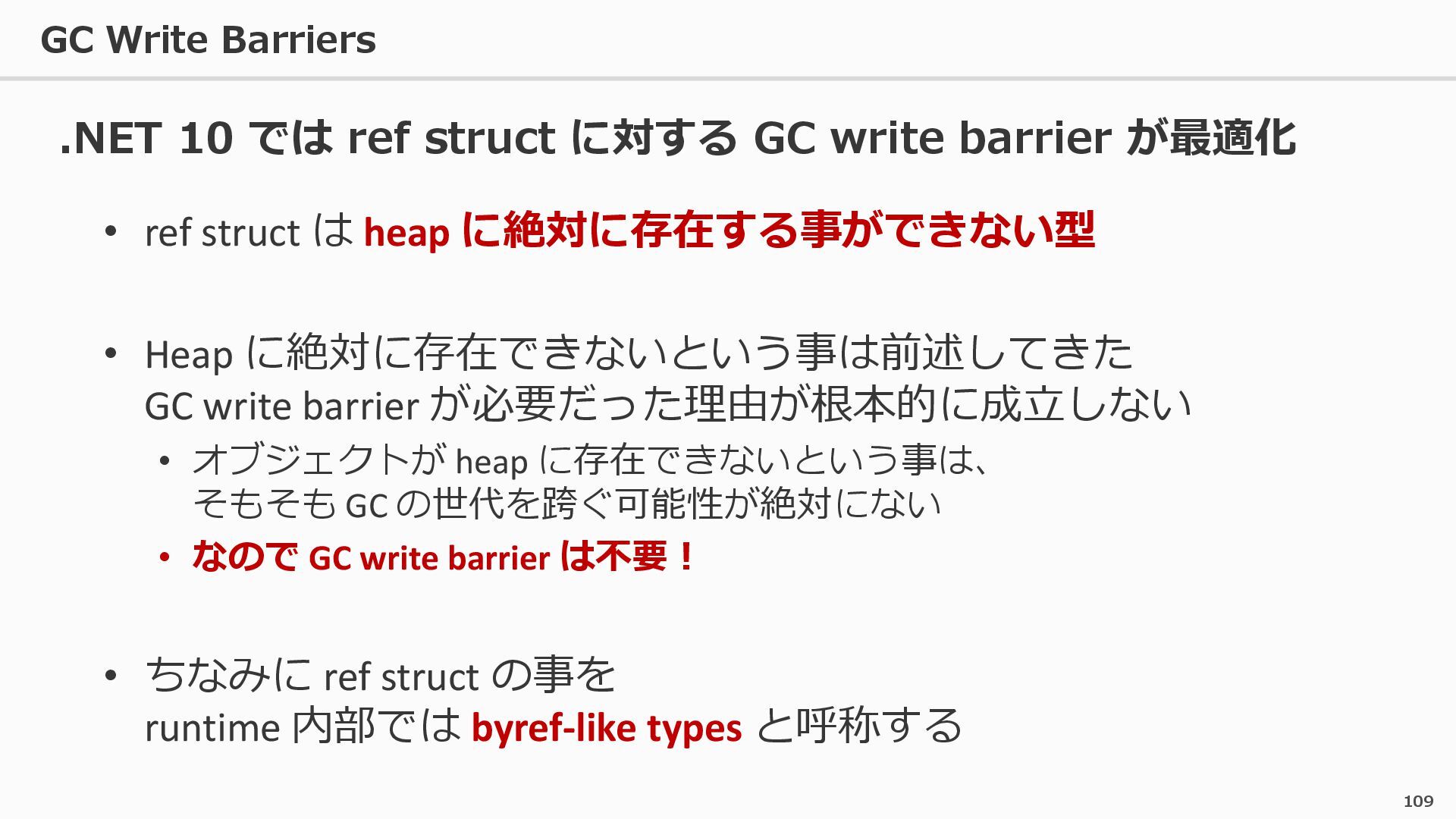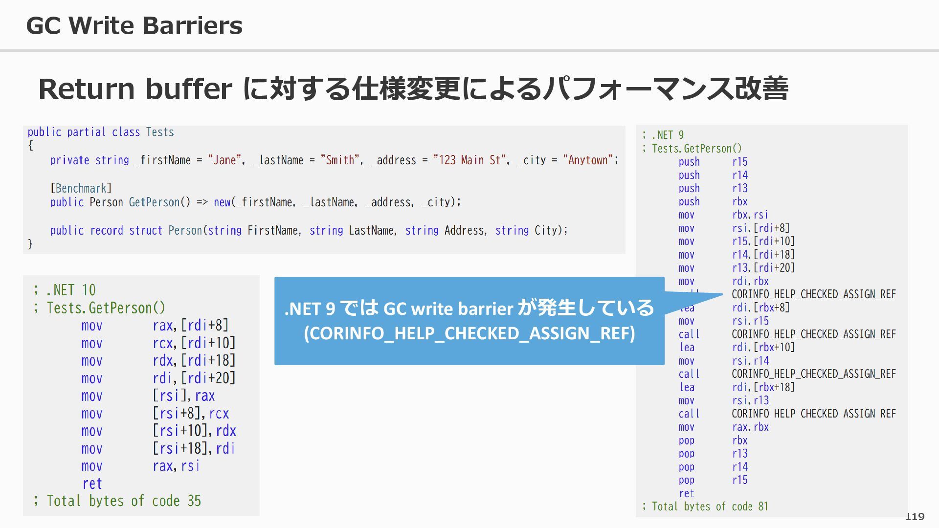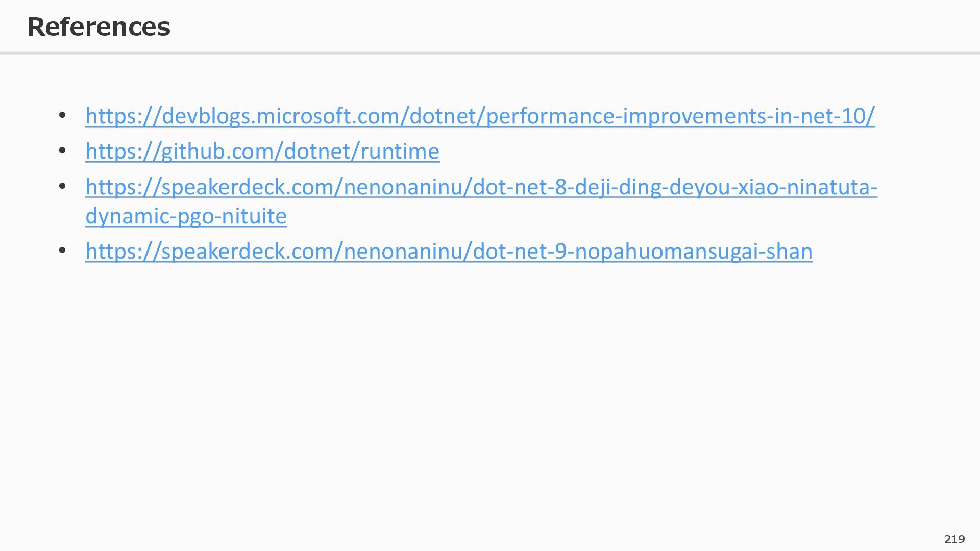 heap に allocation が発生してしまうところを stack に allocation するようにする最適化 • JIT は escape analysis を行い、オブジェクトがメソッドの スコープ外に出ていかない事を証明できた場合 heap ではなく stack に allocation する • .NET 9 でも object stack allocation が効く • https://speakerdeck.com/nenonaninu/dot-net-9-nopahuomansugai-shan?slide=25 • .NET 10 では最適化が効くパターンが拡大