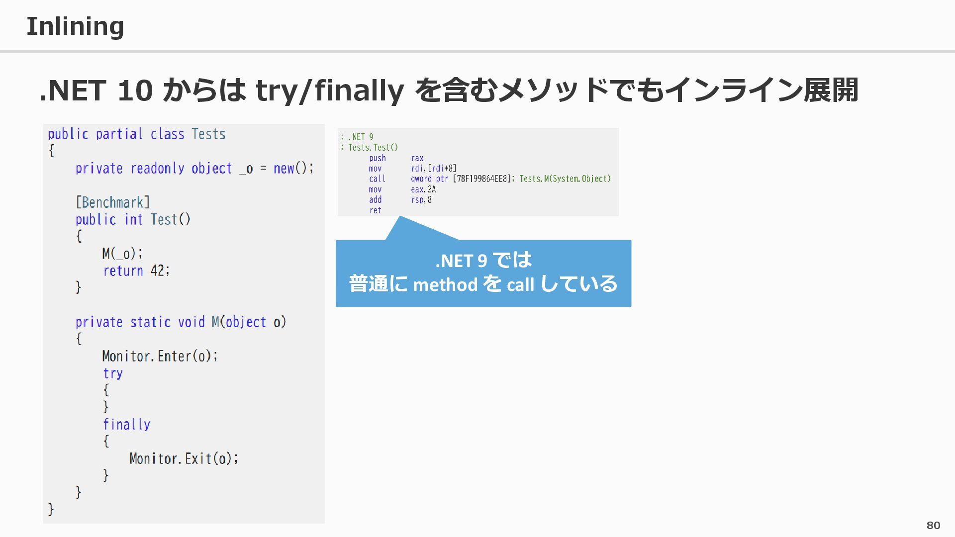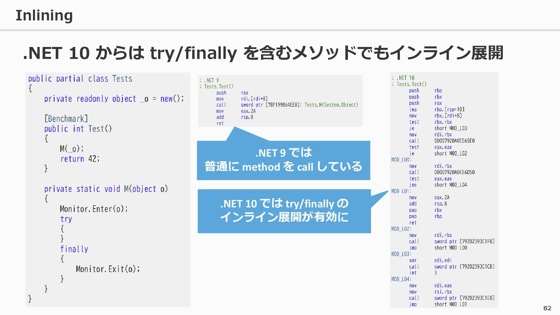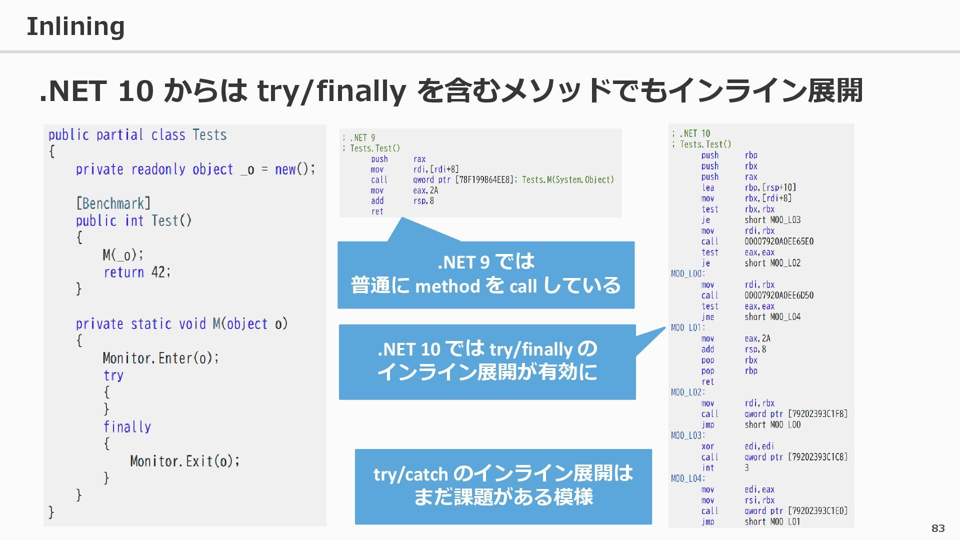 44. Inlining 82 .NET 10 からは try/finally を含むメソッドでもインライン展開 .NET 9 では