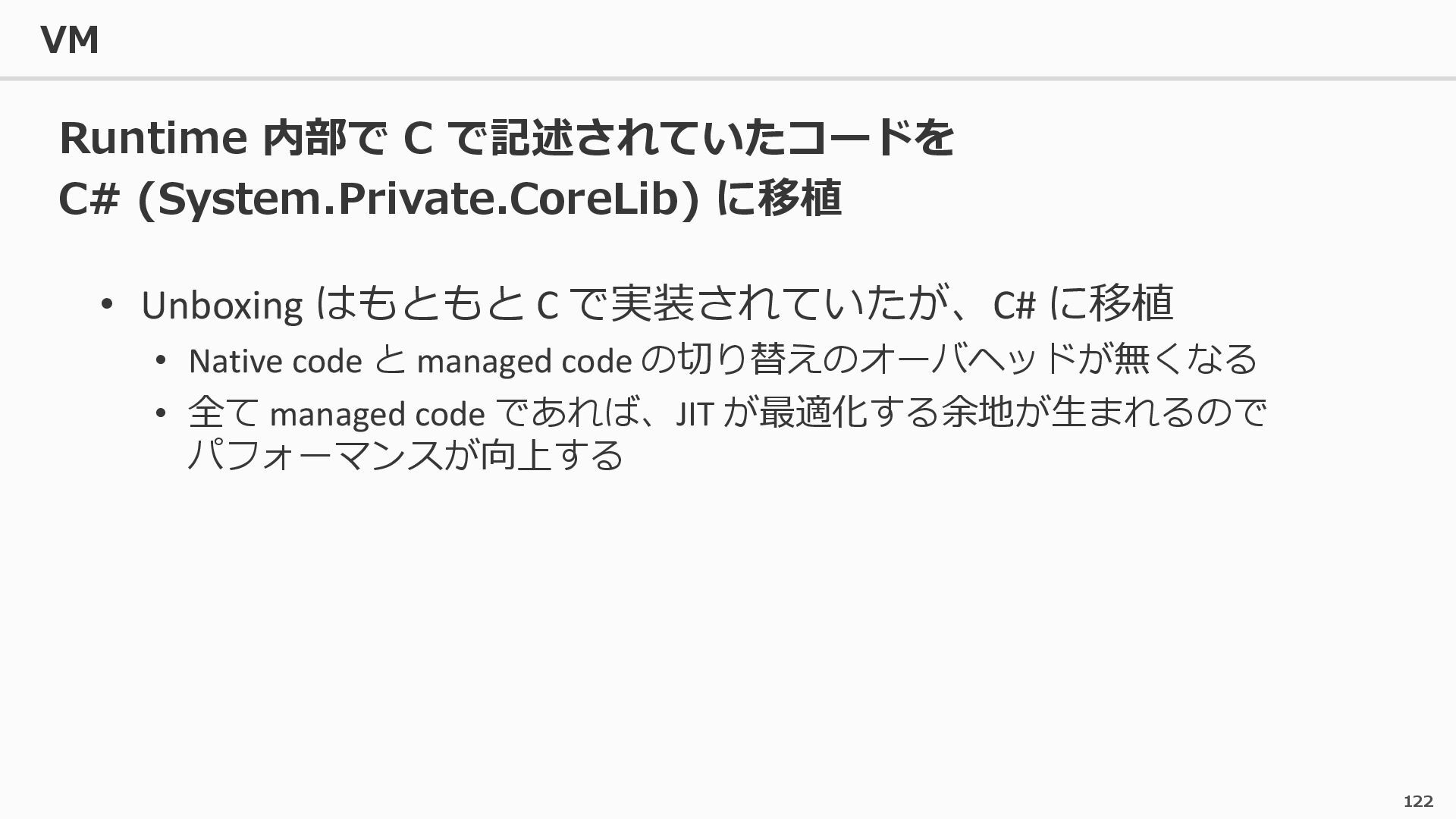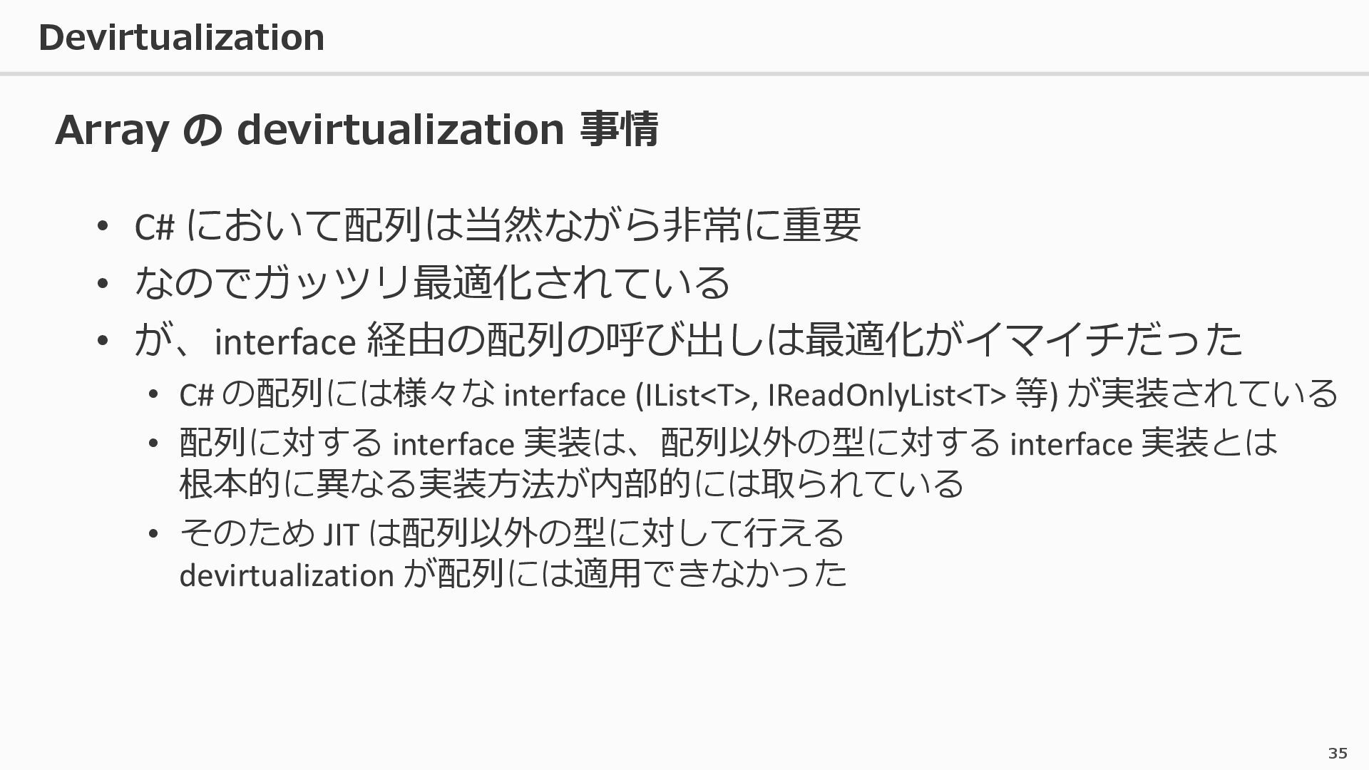 経由の配列に対するメソッド呼び出しが ガッツリ最適化…! • C# において配列は当然ながら非常に重要 • なのでガッツリ最適化されている • が、interface 経由の配列の呼び出しは最適化がイマイチだった • C# の配列には様々な interface (IList<T>, IReadOnlyList<T> 等) が実装されている • 配列に対する interface 実装は、配列以外の型に対する interface 実装とは 根本的に異なる実装方法が内部的には取られている • そのため JIT は配列以外の型に対して行える devirtualization が配列には適用できなかった