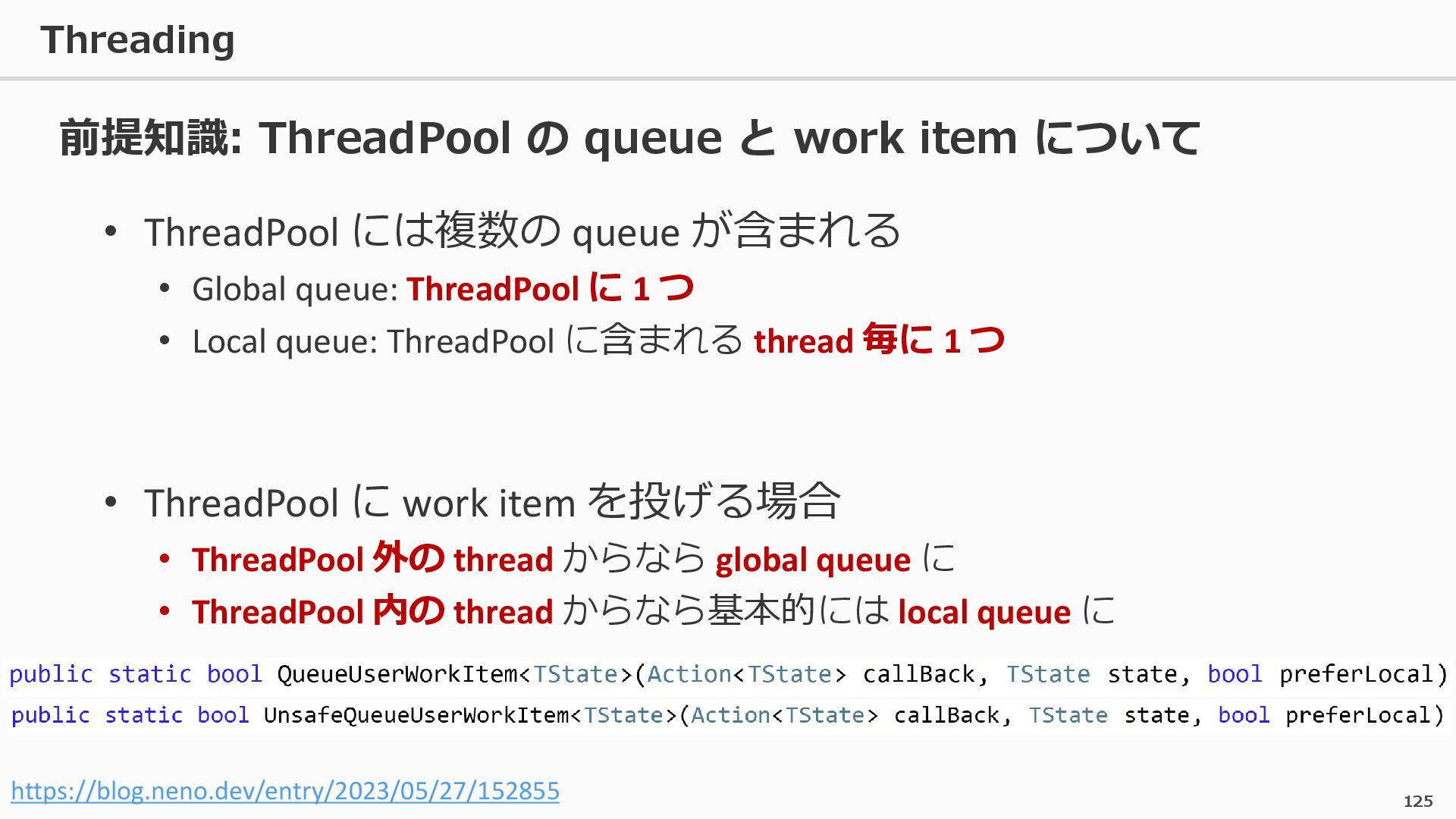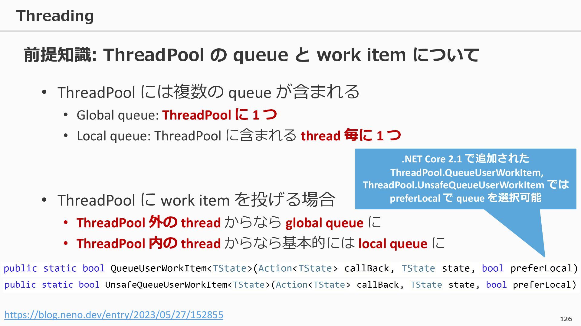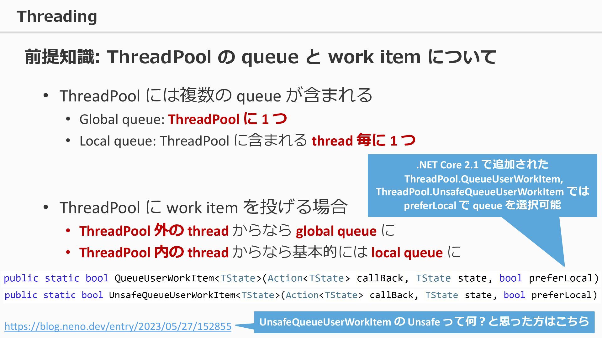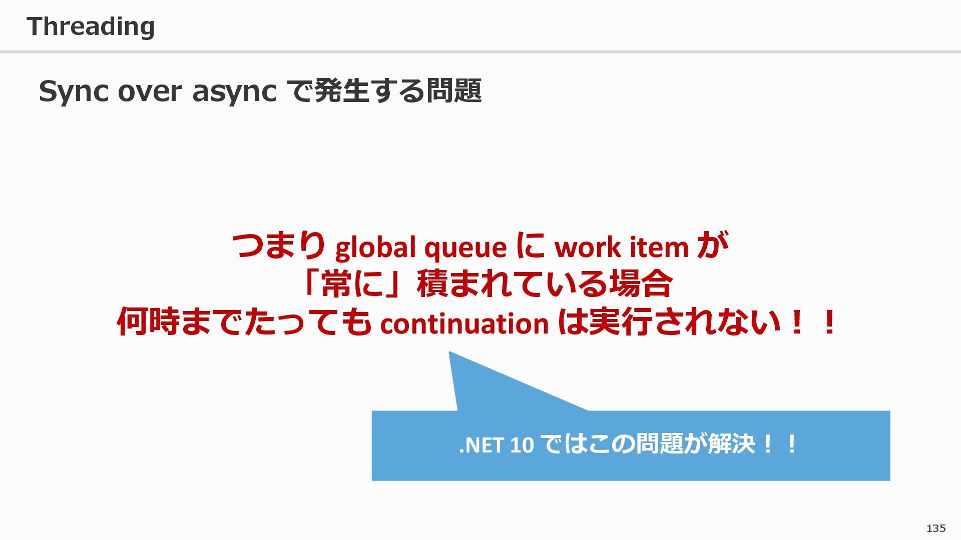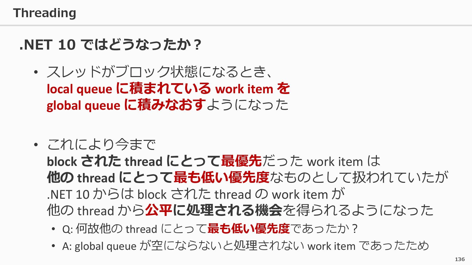 work item を global queue に積みなおすようになった • これにより今まで block された thread にとって最優先だった work item は 他の thread にとって最も低い優先度なものとして扱われていたが .NET 10 からは block された thread の work item が 他の thread から公平に処理される機会を得られるようになった • Q: 何故他の thread にとって最も低い優先度であったか? • A: global queue が空にならないと処理されない work item であったため
