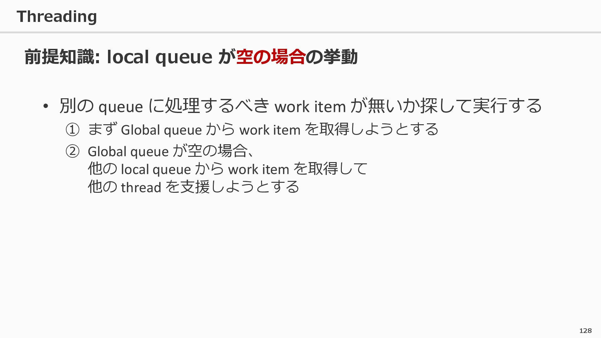 work item が無いか探して実行する ① まず Global queue から work item を取得しようとする ② Global queue が空の場合、 他の local queue から work item を取得して 他の thread を支援しようとする work stealing と呼ばれる