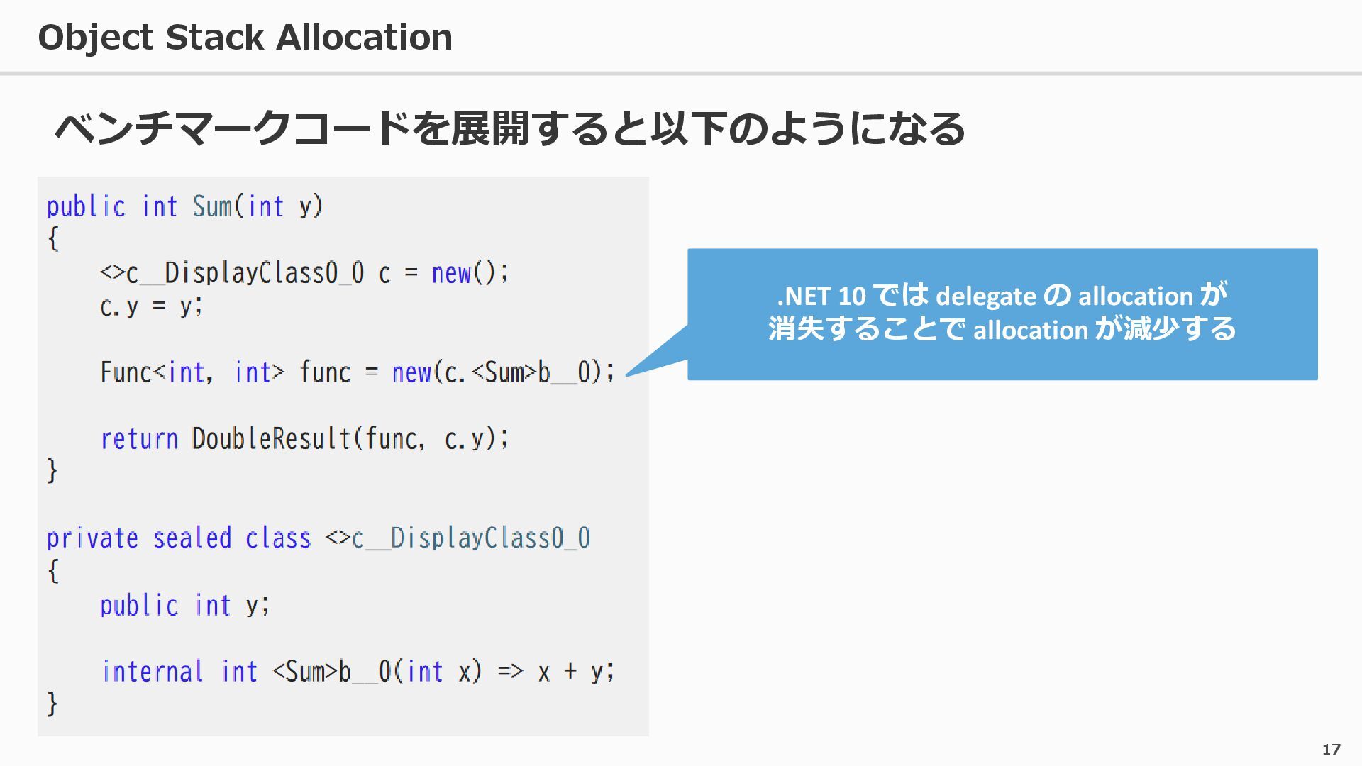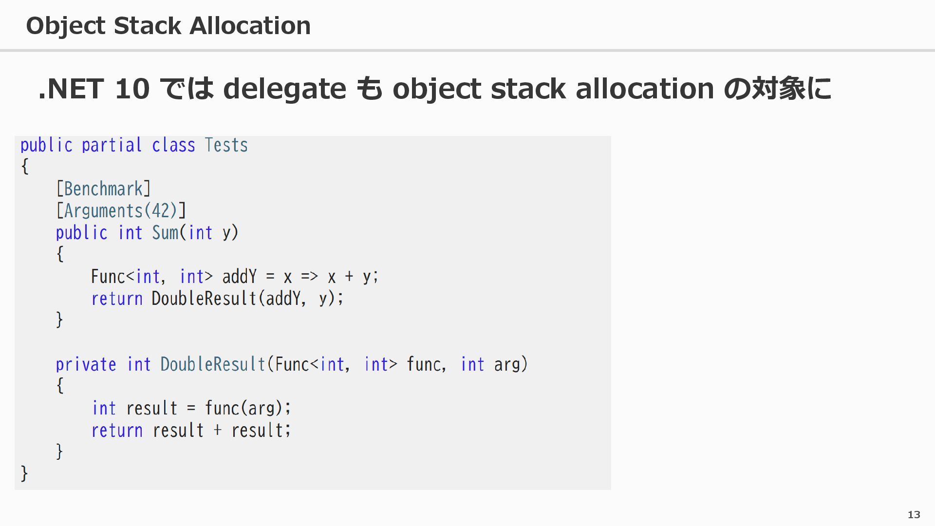 9. Object Stack Allocation 15 .NET 10 では delegate も object