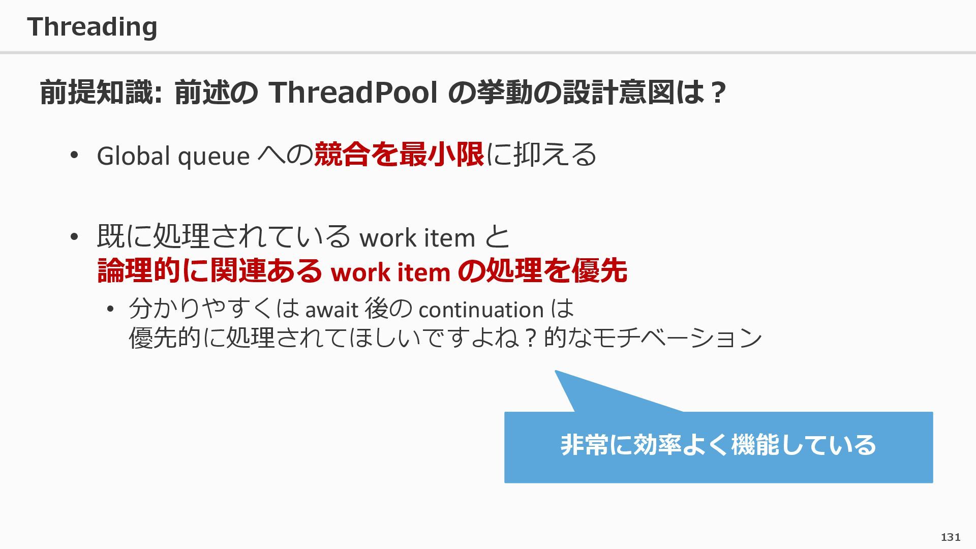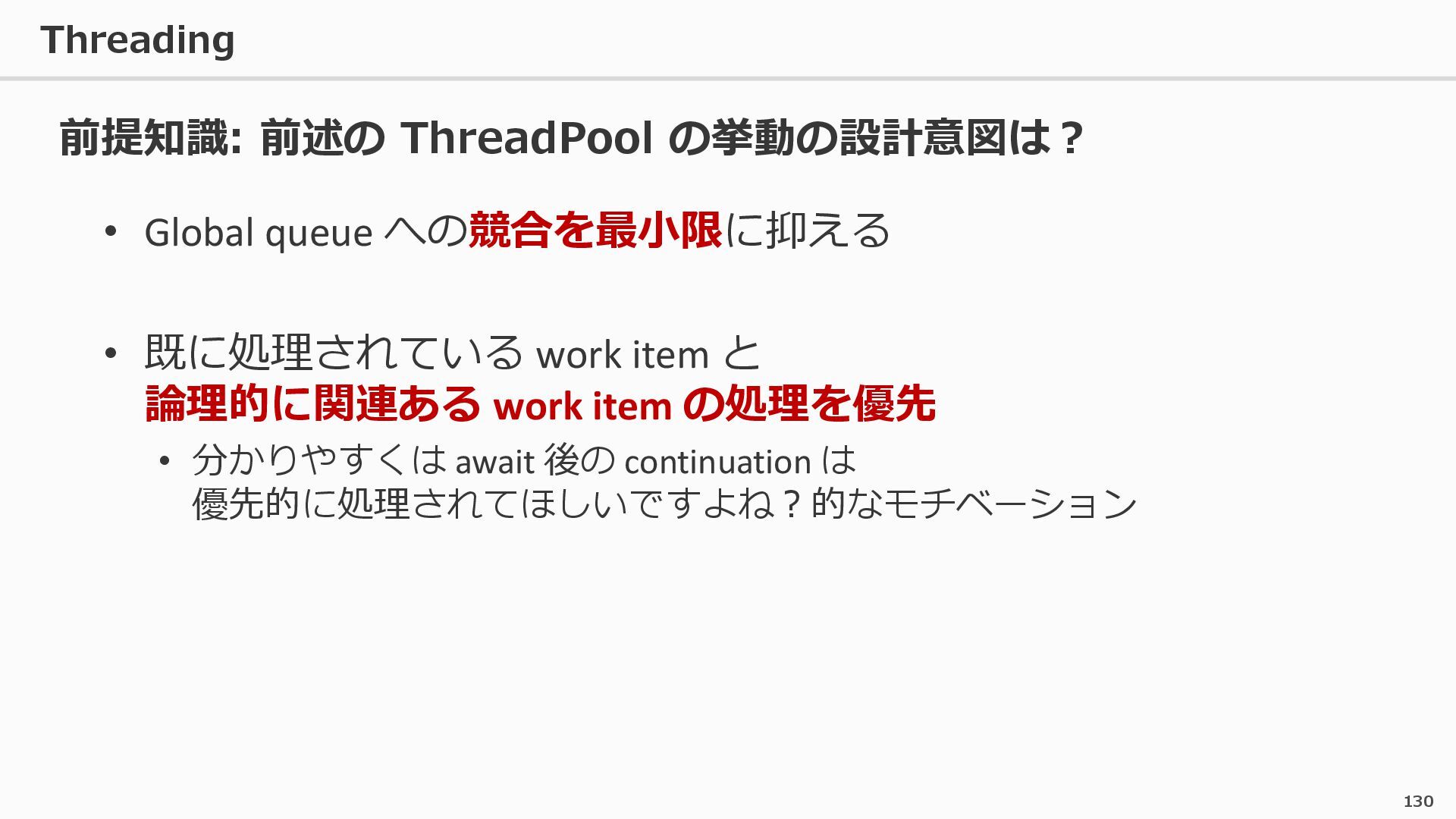 75. Threading 130 前提知識: 前述の ThreadPool の挙動の設計意図は? • Global queue への競合を最小限に抑える