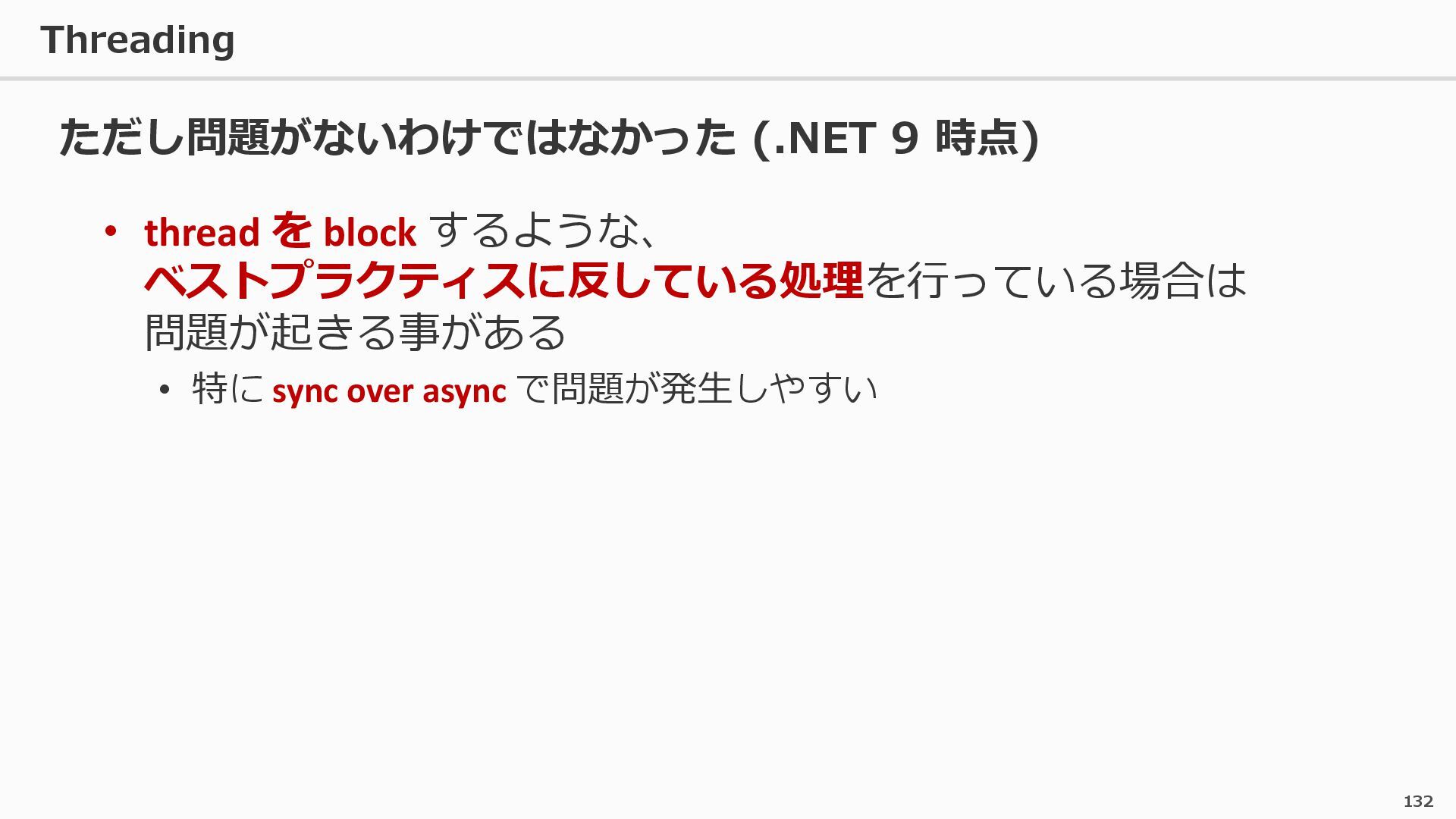 77. Threading 132 ただし問題がないわけではなかった (.NET 9 時点) • thread を block