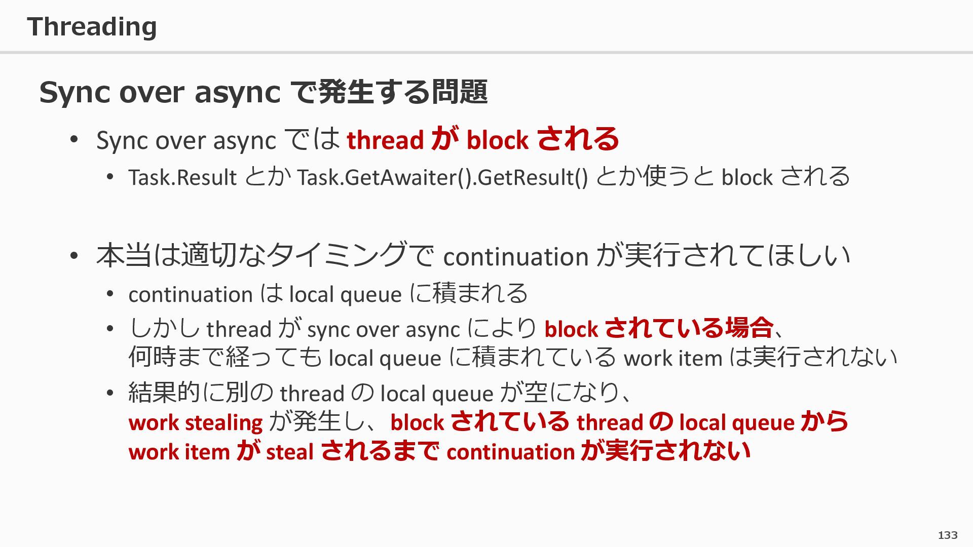 では thread が block される • Task.Result とか Task.GetAwaiter().GetResult() とか使うと block される • 本当は適切なタイミングで continuation が実行されてほしい • continuation は local queue に積まれる • しかし thread が sync over async により block されている場合、 何時まで経っても local queue に積まれている work item は実行されない • 結果的に別の thread の local queue が空になり、 work stealing が発生し、block されている thread の local queue から work item が steal されるまで continuation が実行されない