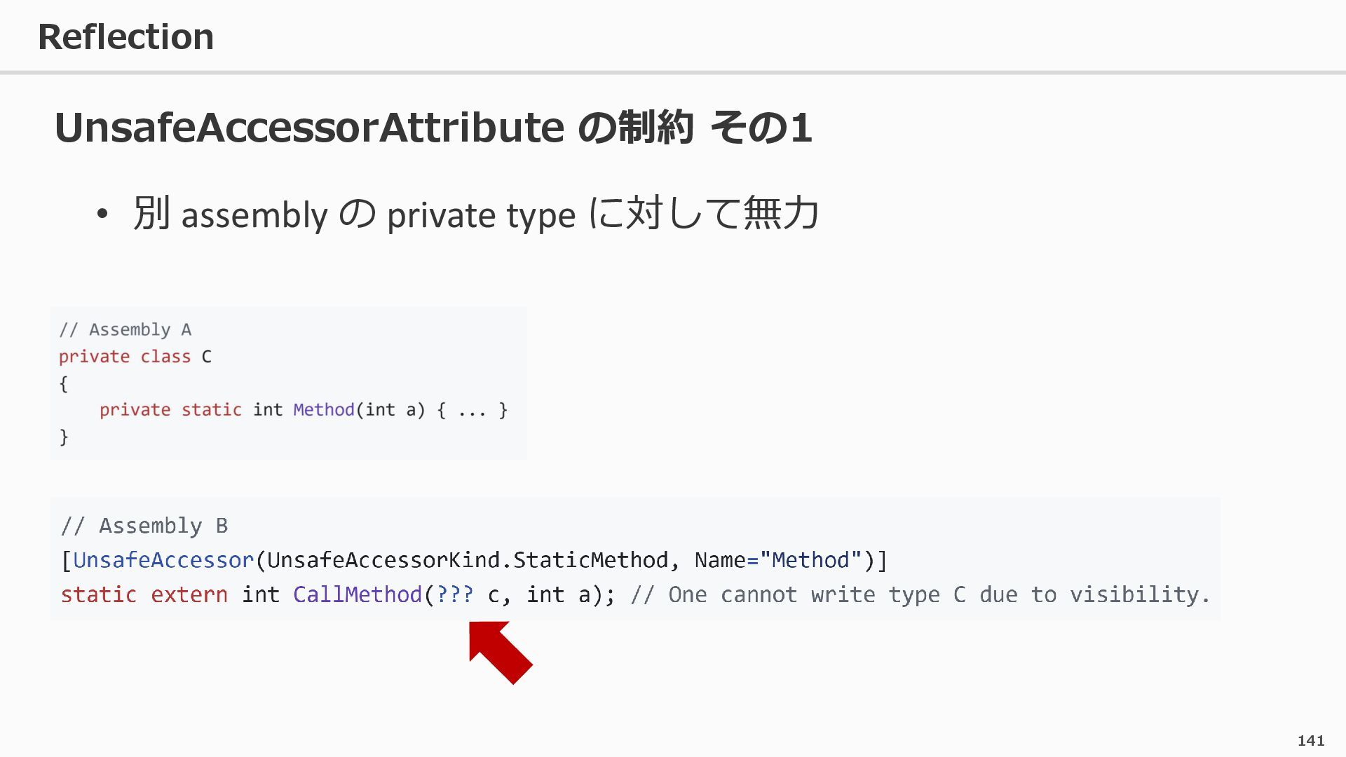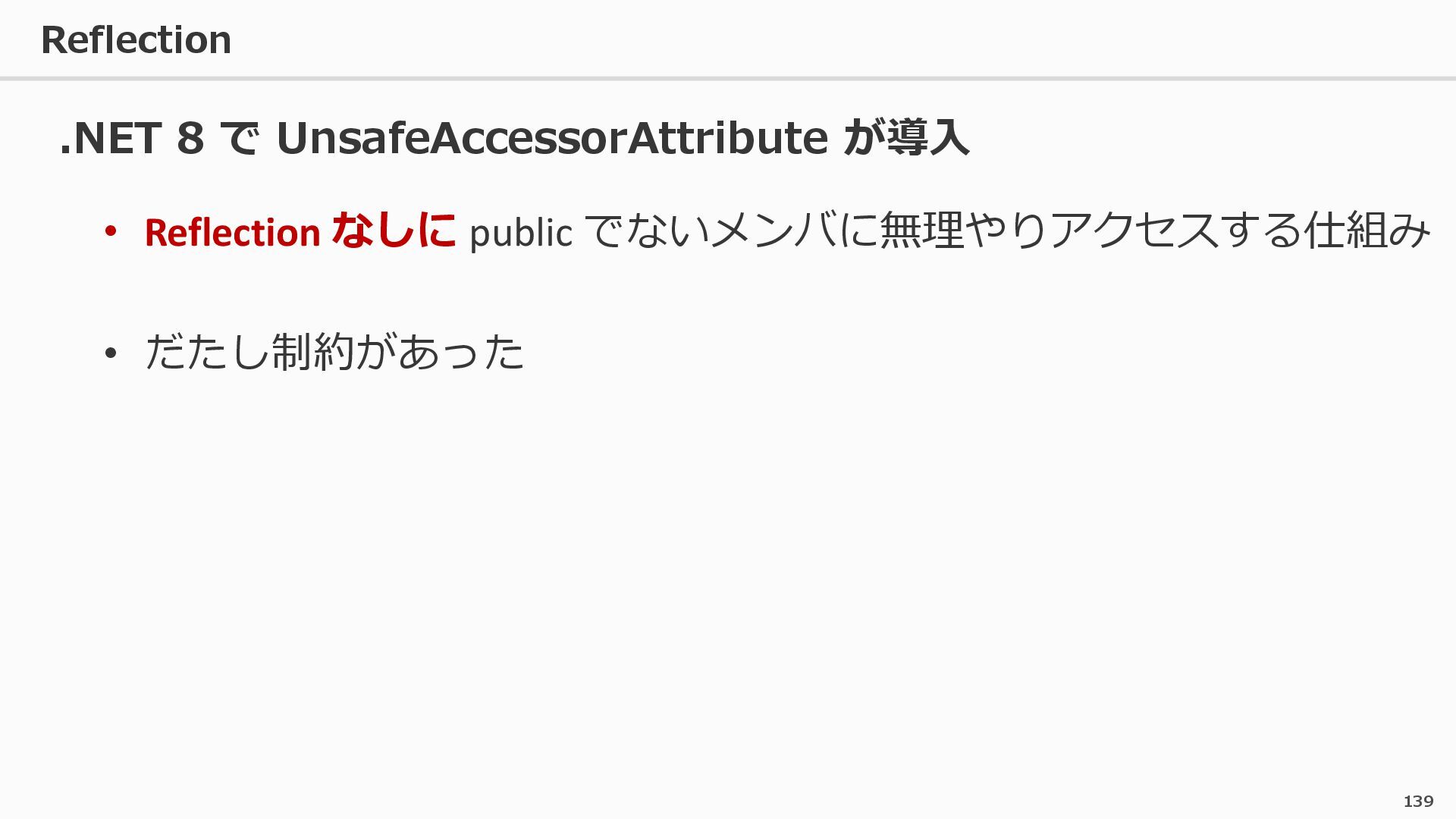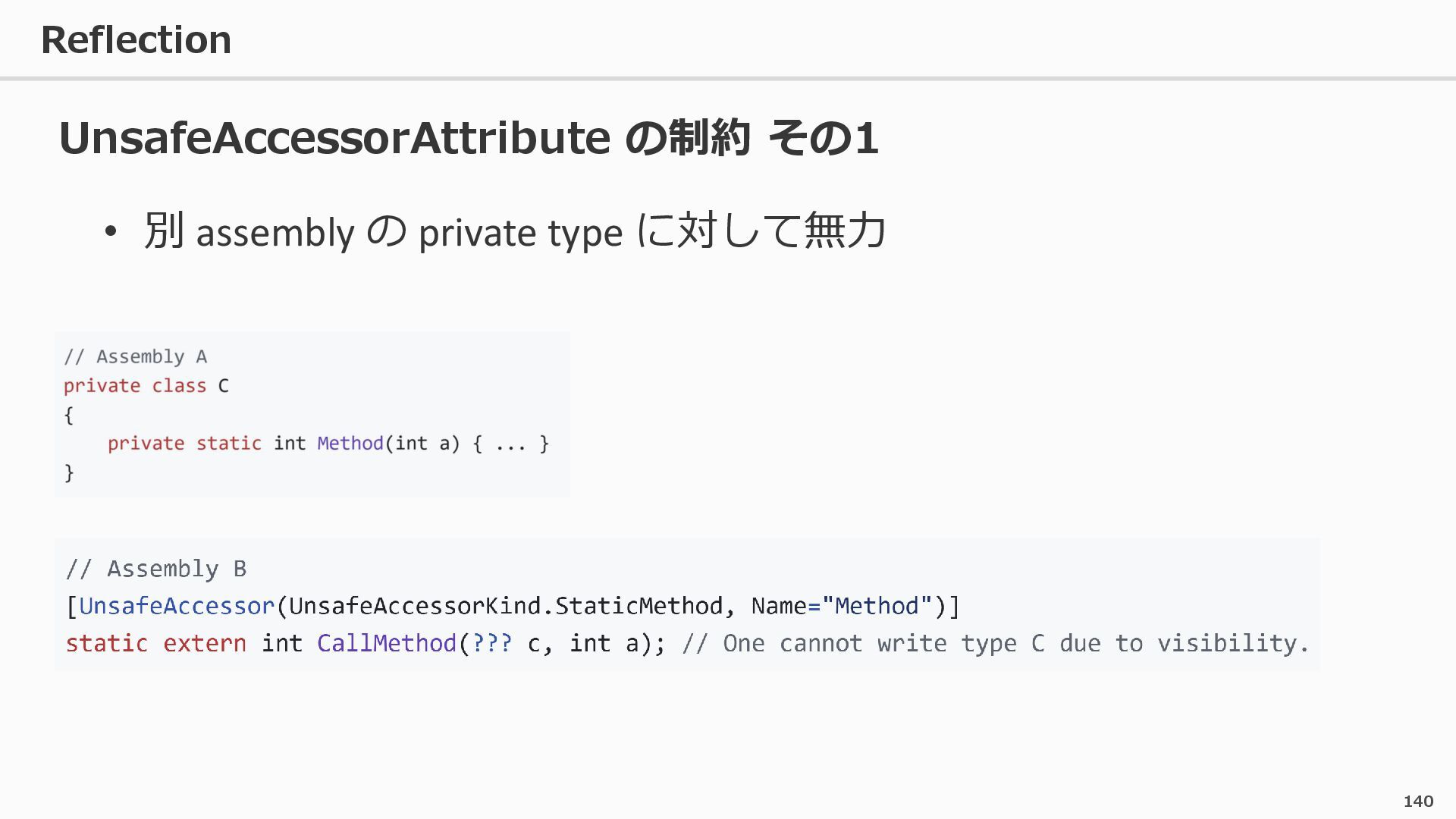 83. Reflection 139 .NET 8 で UnsafeAccessorAttribute が導入 • Reflection なしに