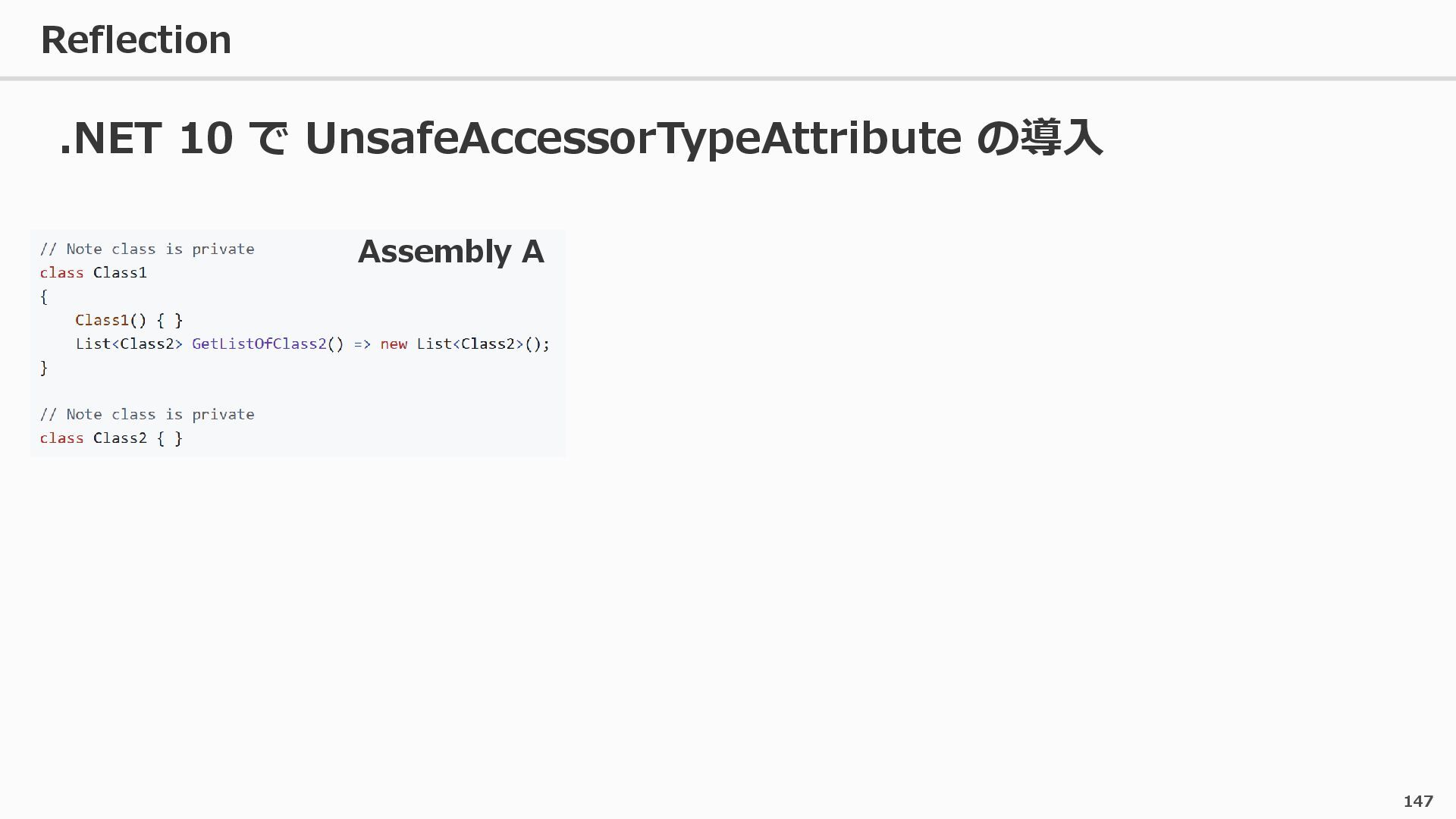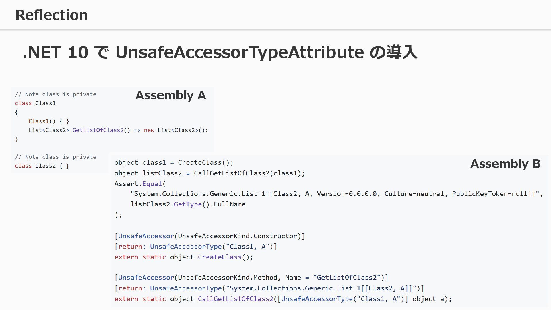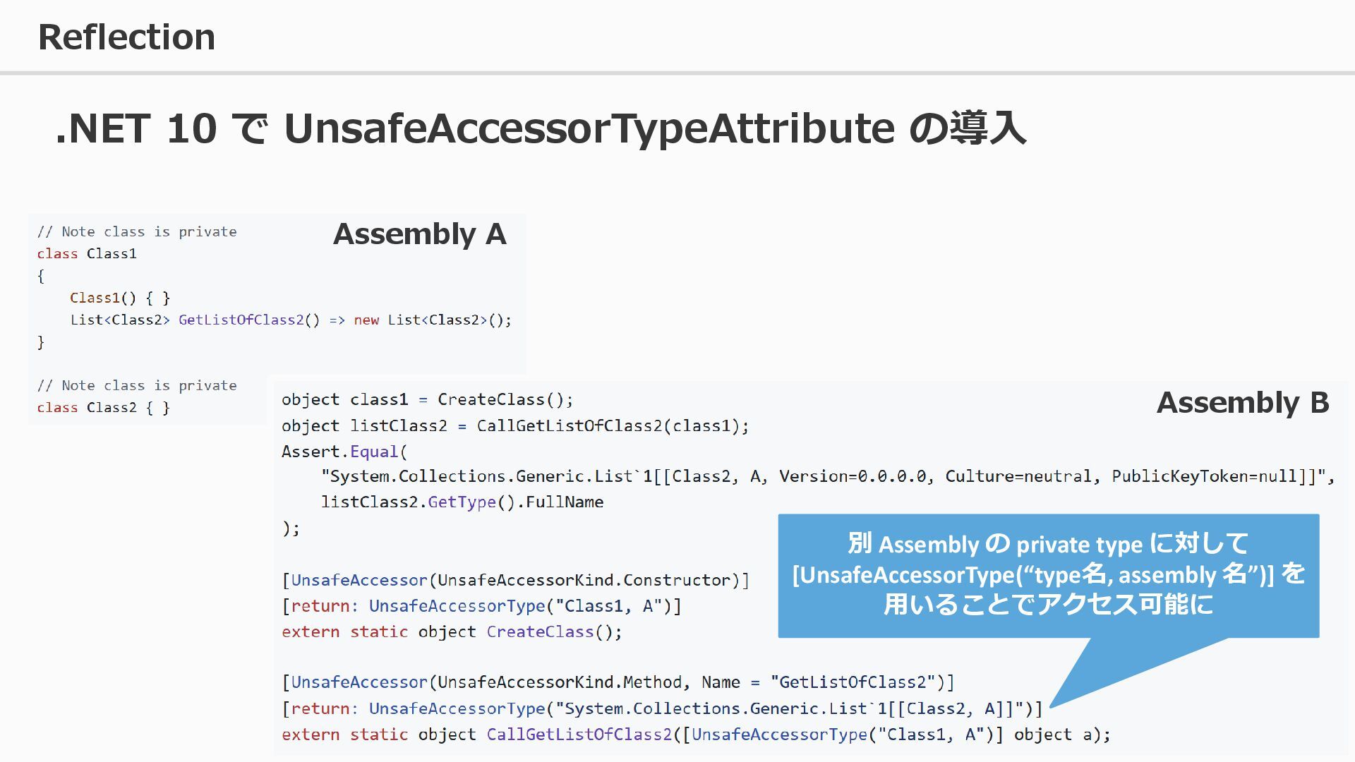 86. Reflection 149 .NET 10 で UnsafeAccessorTypeAttribute の導入 Assembly A Assembly