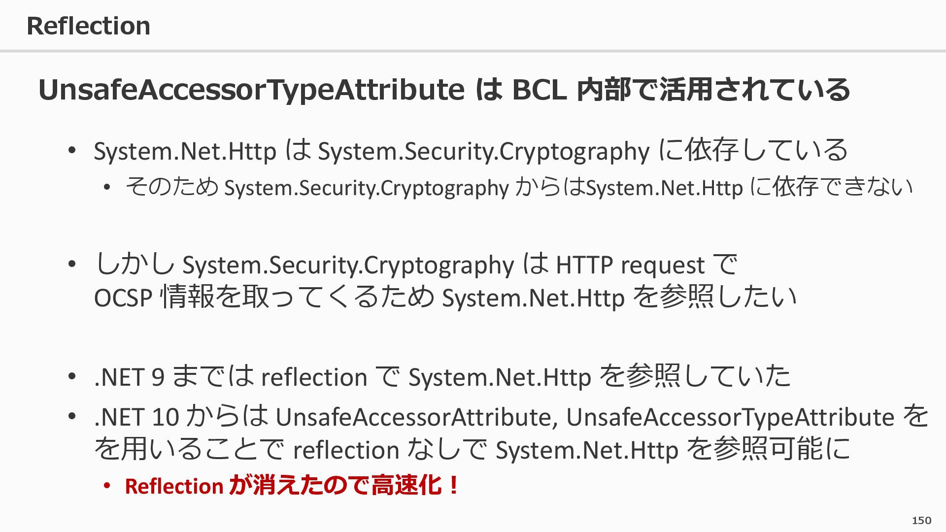 に依存している • そのため System.Security.Cryptography からはSystem.Net.Http に依存できない • しかし System.Security.Cryptography は HTTP request で OCSP 情報を取ってくるため System.Net.Http を参照したい • .NET 9 までは reflection で System.Net.Http を参照していた • .NET 10 からは UnsafeAccessorAttribute, UnsafeAccessorTypeAttribute を を用いることで reflection なしで System.Net.Http を参照可能に • Reflection が消えたので高速化!