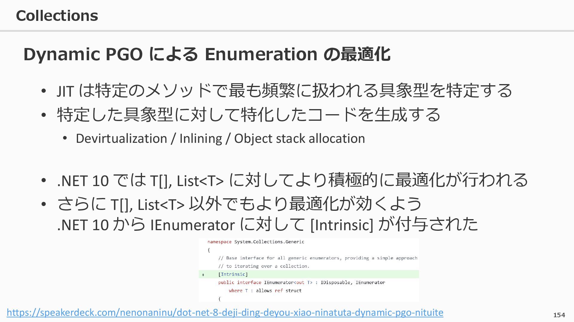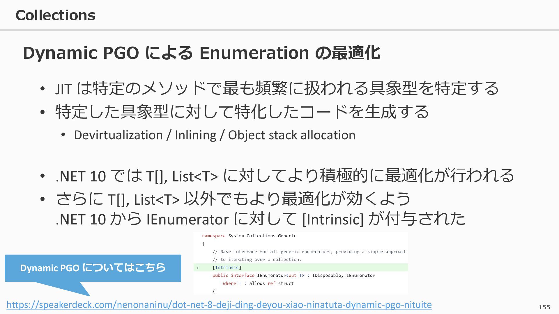 Object stack allocation • .NET 10 では T[], List<T> に対してより積極的に最適化が行われる • さらに T[], List<T> 以外でもより最適化が効くよう .NET 10 から IEnumerator に対して [Intrinsic] が付与された Collections 154 Dynamic PGO による Enumeration の最適化 https://speakerdeck.com/nenonaninu/dot-net-8-deji-ding-deyou-xiao-ninatuta-dynamic-pgo-nituite