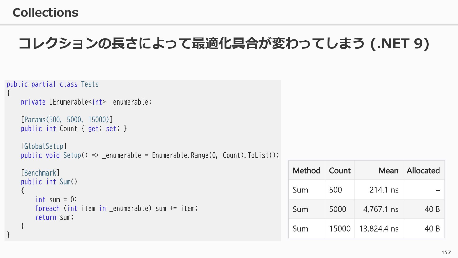 Object stack allocation • .NET 10 では T[], List<T> に対してより積極的に最適化が行われる • さらに T[], List<T> 以外でもより最適化が効くよう .NET 10 から IEnumerator に対して [Intrinsic] が付与された Collections 155 Dynamic PGO による Enumeration の最適化 Dynamic PGO についてはこちら https://speakerdeck.com/nenonaninu/dot-net-8-deji-ding-deyou-xiao-ninatuta-dynamic-pgo-nituite