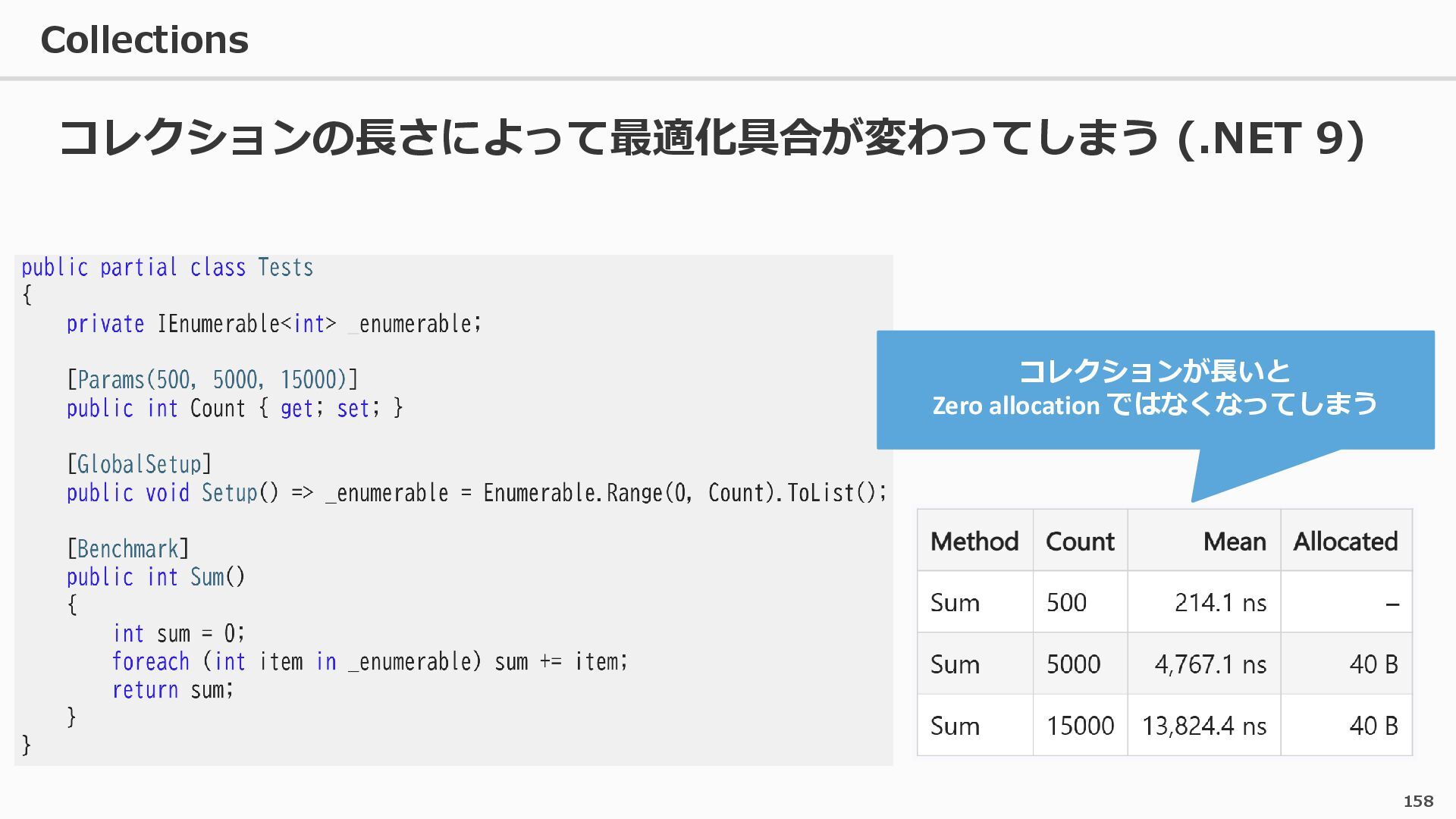 対して相対的に呼び出される回数が減り その結果インライン展開されなくなり enumerator が stack allocation されなくなる 昔は MoveNext をインライン展開するため このような実装が適切な最適化だったが 昨今の Dynamic PGO 等の最適化が進む中で 適切な最適化ではなくなってしまった