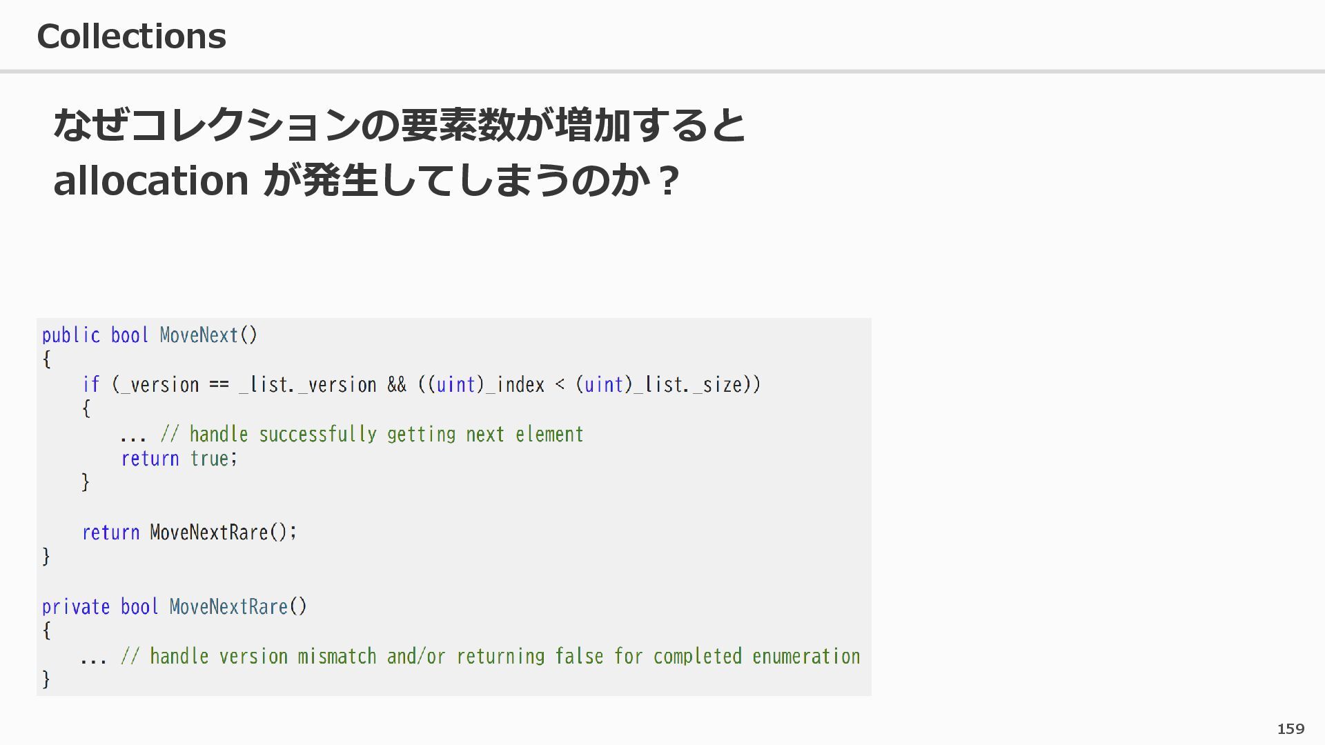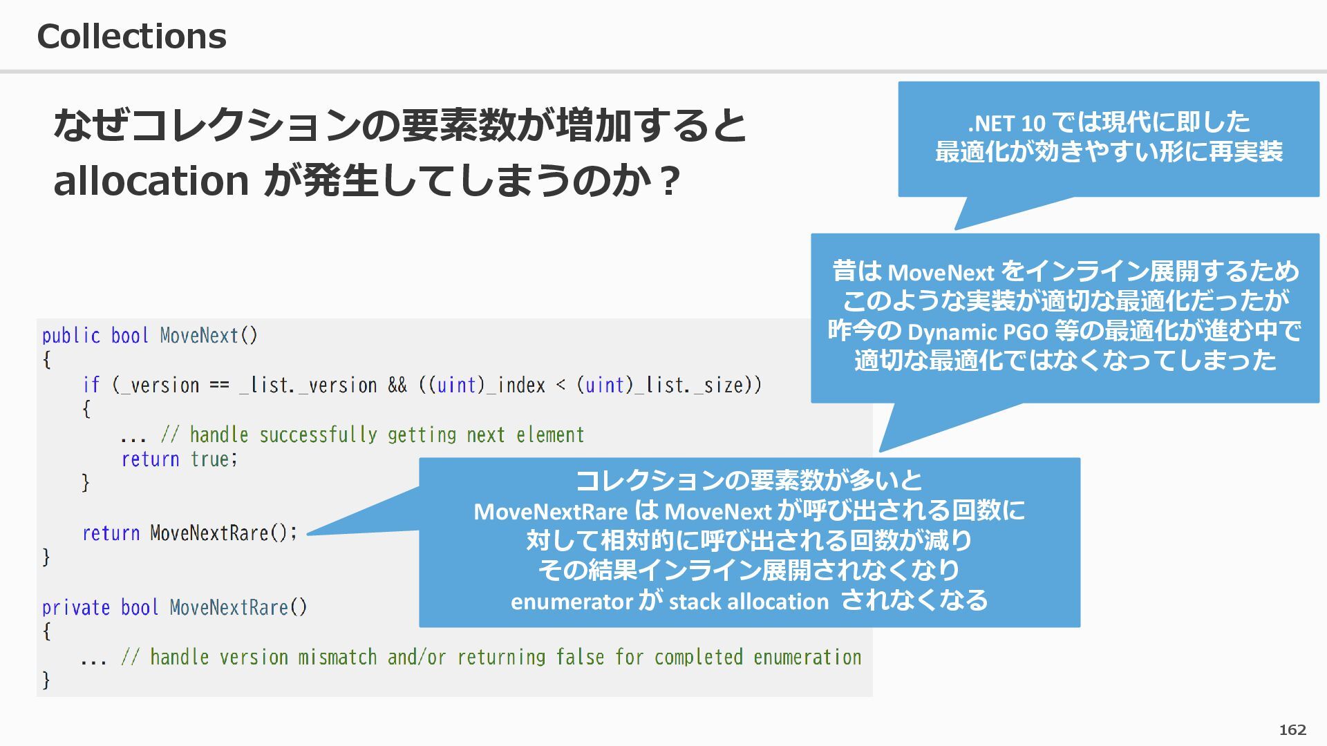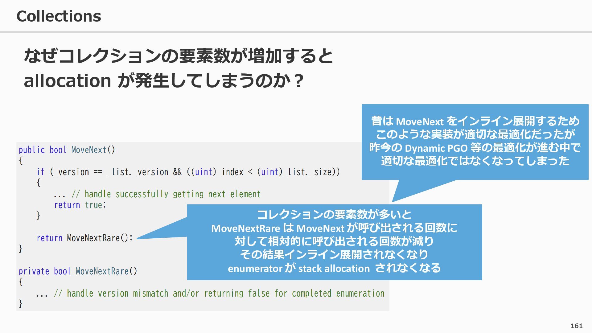 93. Collections 161 なぜコレクションの要素数が増加すると allocation が発生してしまうのか? コレクションの要素数が多いと MoveNextRare は MoveNext が呼び出される回数に