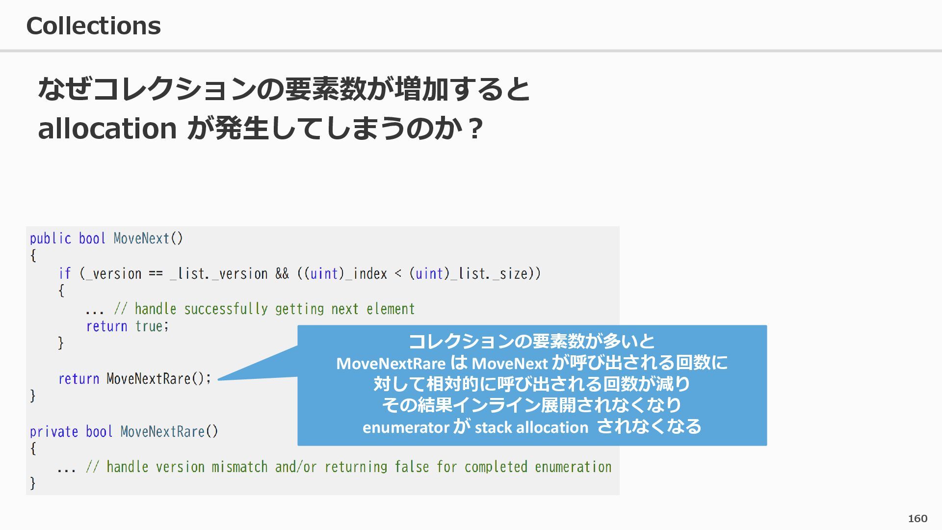 92. Collections 160 なぜコレクションの要素数が増加すると allocation が発生してしまうのか? コレクションの要素数が多いと MoveNextRare は MoveNext が呼び出される回数に