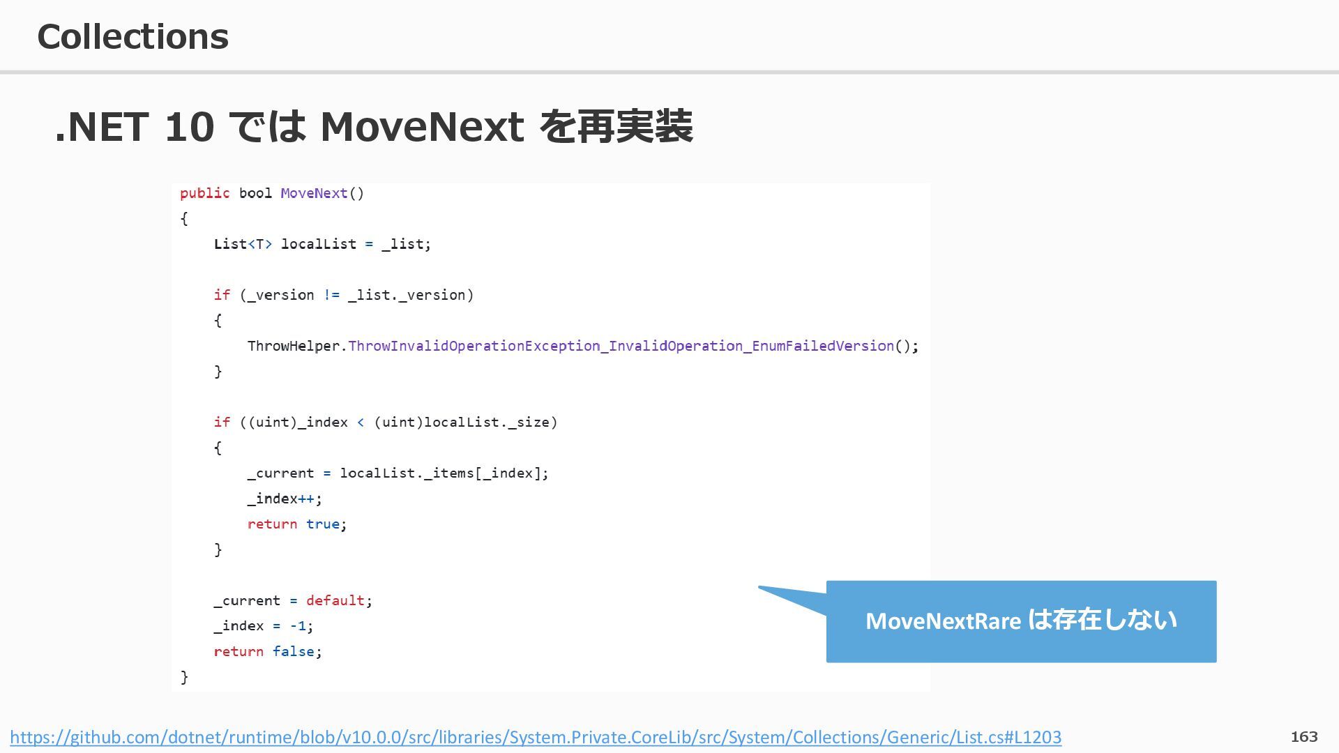 対して相対的に呼び出される回数が減り その結果インライン展開されなくなり enumerator が stack allocation されなくなる .NET 10 では現代に即した 最適化が効きやすい形に再実装 昔は MoveNext をインライン展開するため このような実装が適切な最適化だったが 昨今の Dynamic PGO 等の最適化が進む中で 適切な最適化ではなくなってしまった
