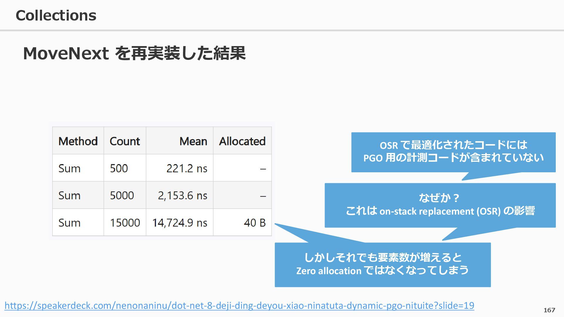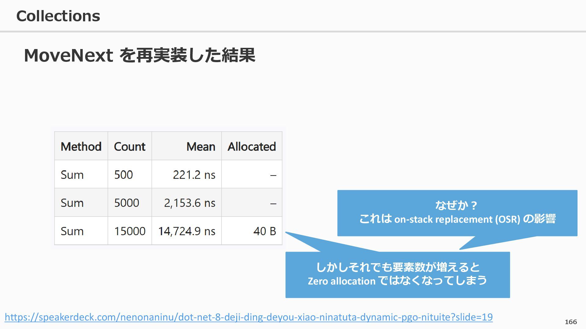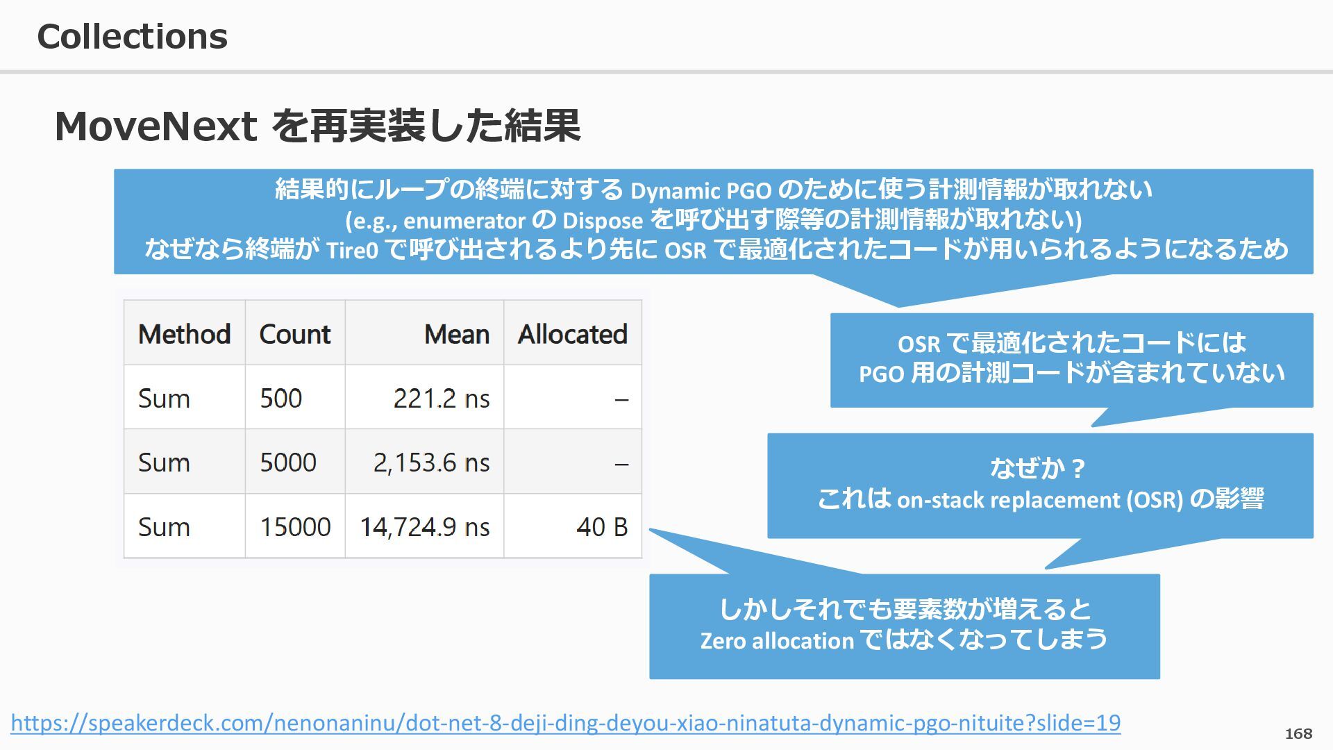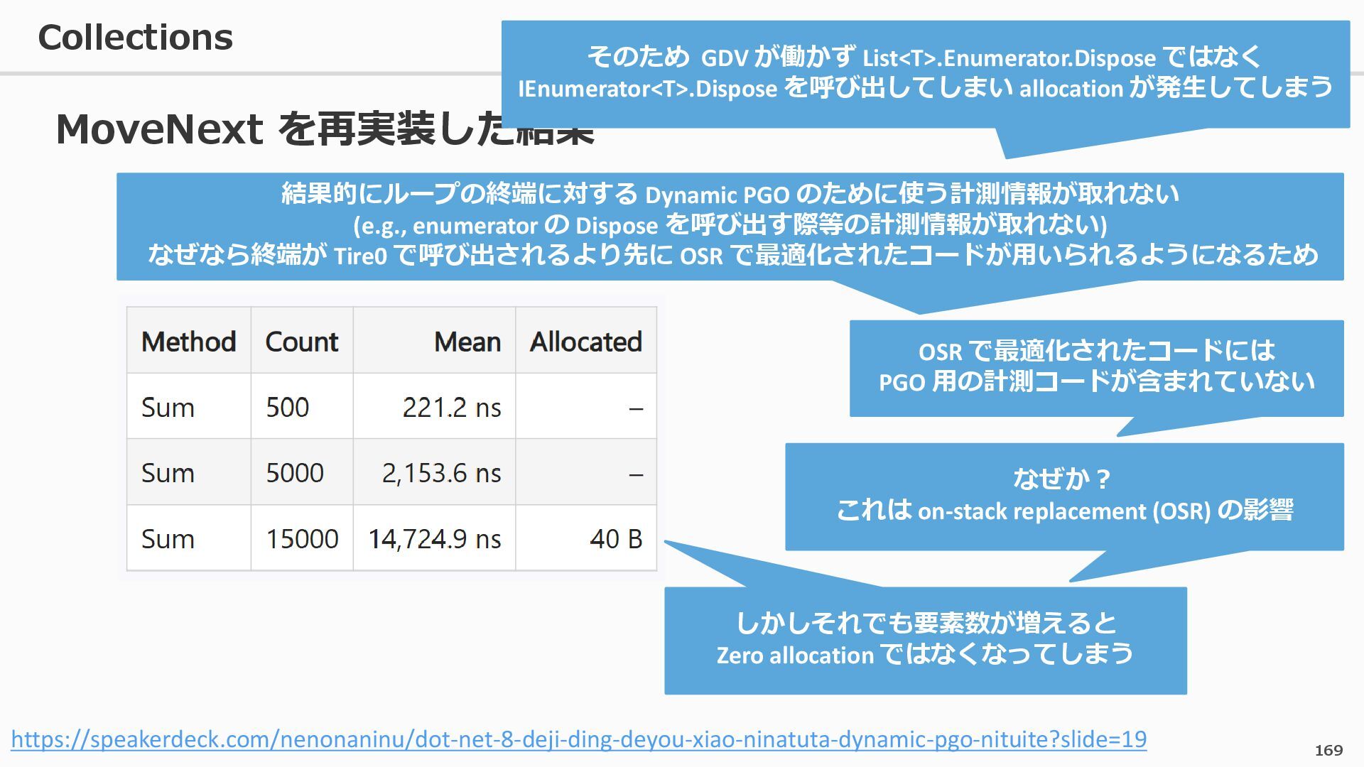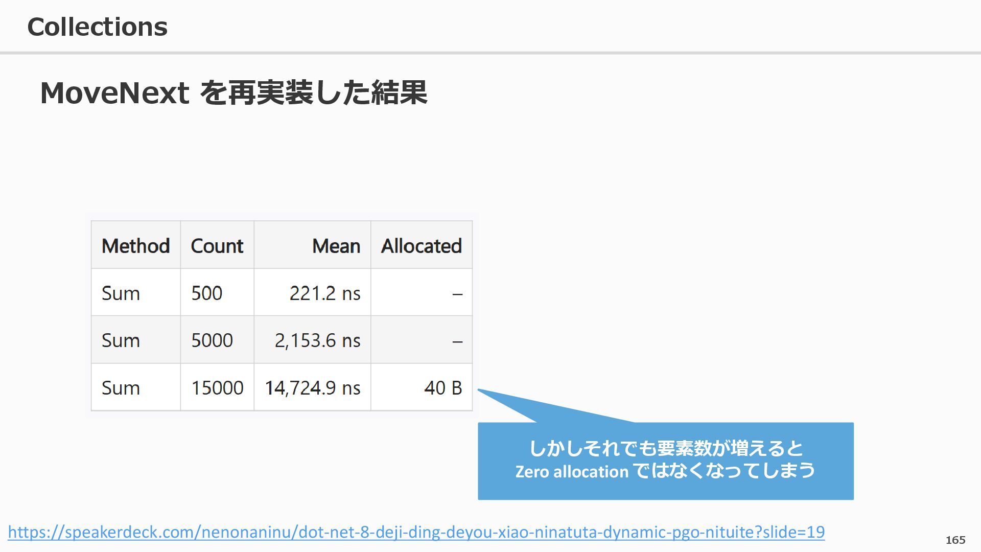 95. Collections 168 MoveNext を再実装した結果 https://speakerdeck.com/nenonaninu/dot-net-8-deji-ding-deyou-xiao-ninatuta-dynamic-pgo-nituite?slide=19 しかしそれでも要素数が増えると Zero allocation ではなくなってしまう なぜか?