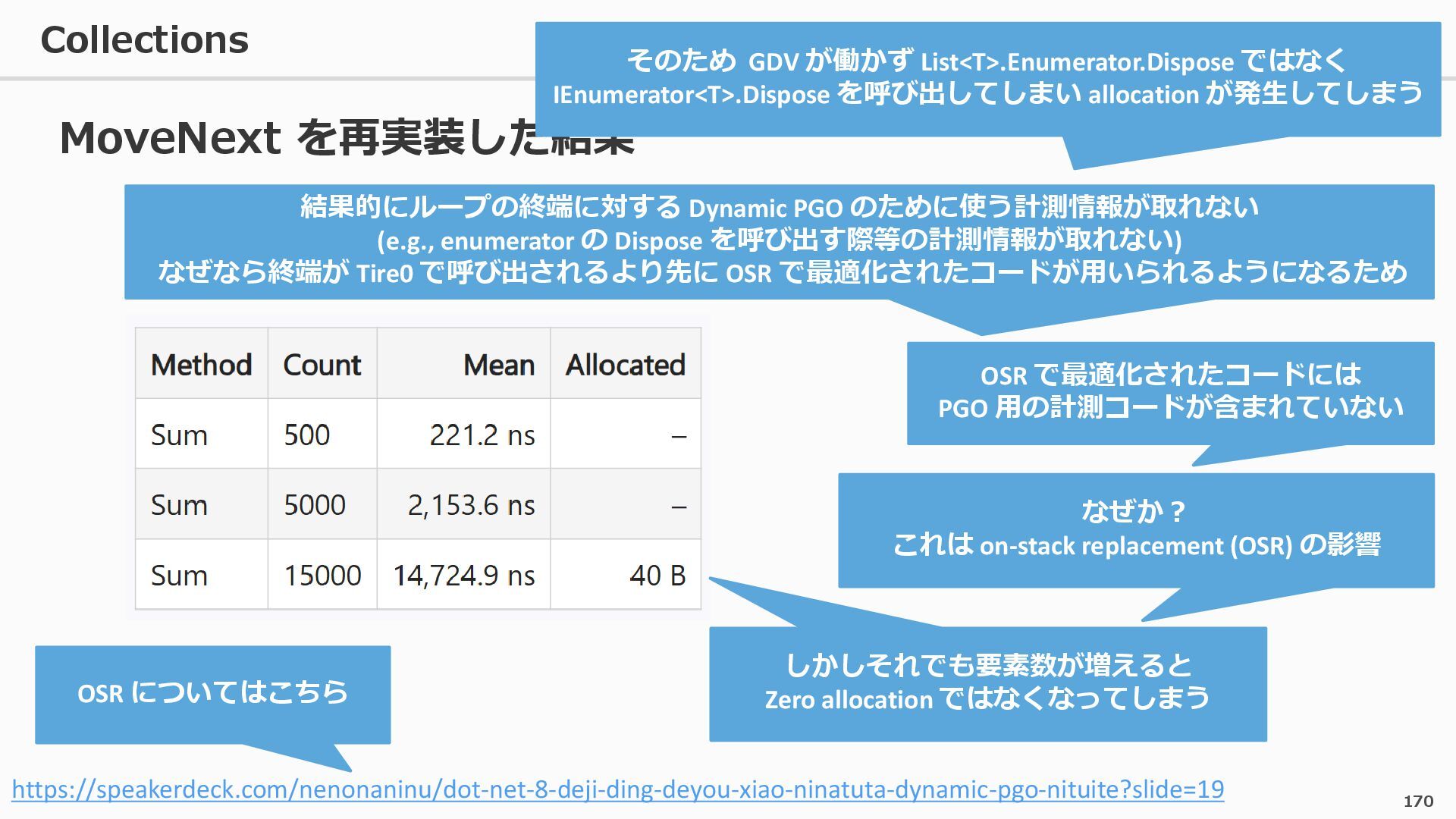 これは on-stack replacement (OSR) の影響 OSR で最適化されたコードには PGO 用の計測コードが含まれていない 結果的にループの終端に対する Dynamic PGO のために使う計測情報が取れない (e.g., enumerator の Dispose を呼び出す際等の計測情報が取れない) なぜなら終端が Tire0 で呼び出されるより先に OSR で最適化されたコードが用いられるようになるため そのため GDV が働かず List<T>.Enumerator.Dispose ではなく IEnumerator<T>.Dispose を呼び出してしまい allocation が発生してしまう OSR についてはこちら