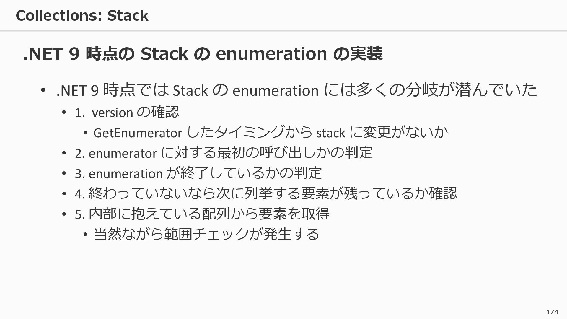 99. Collections: Stack 174 .NET 9 時点の Stack の enumeration の実装