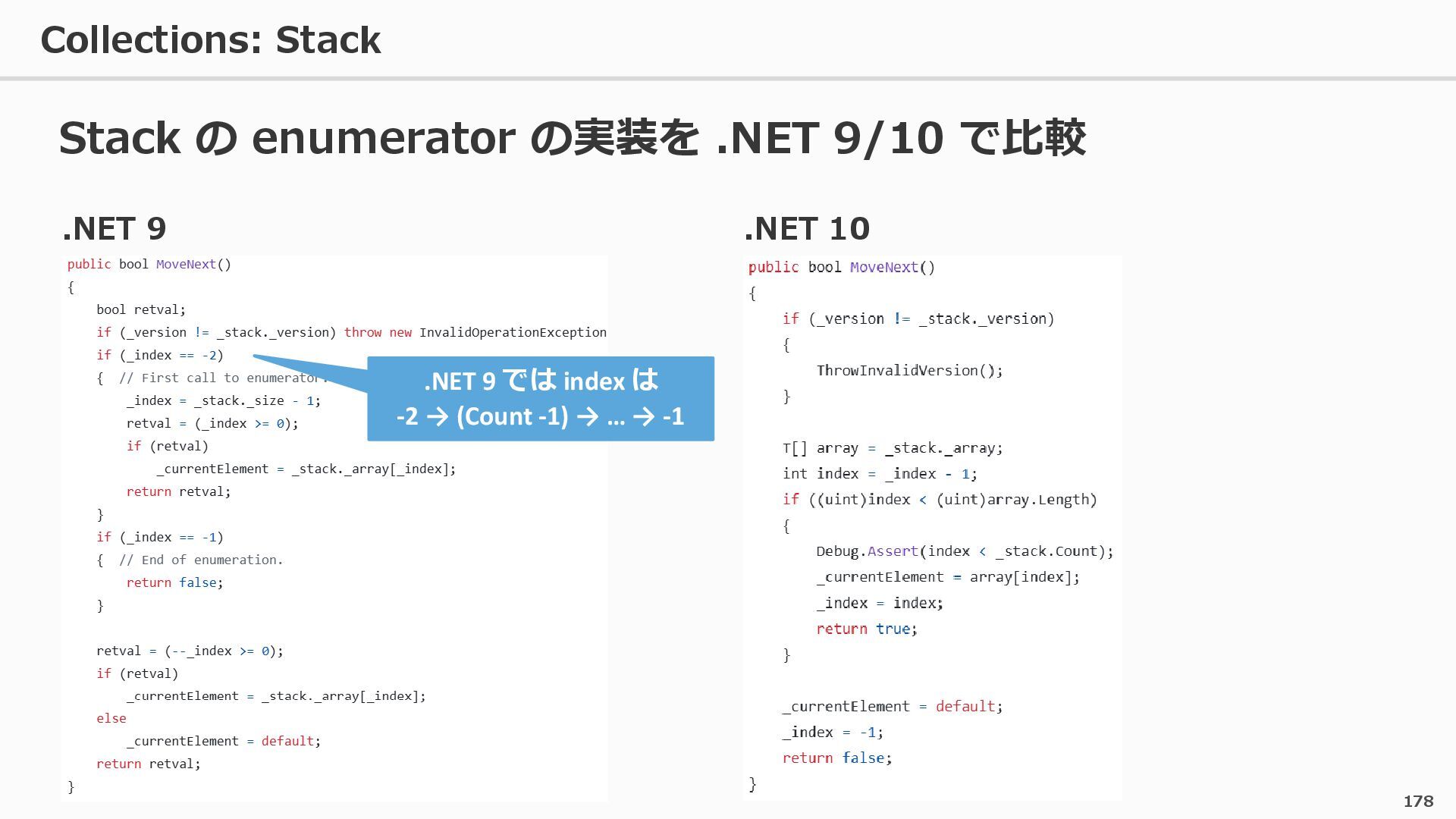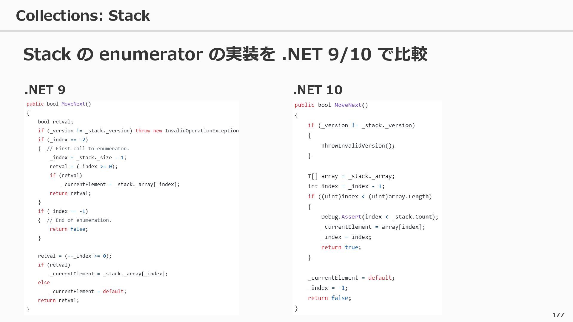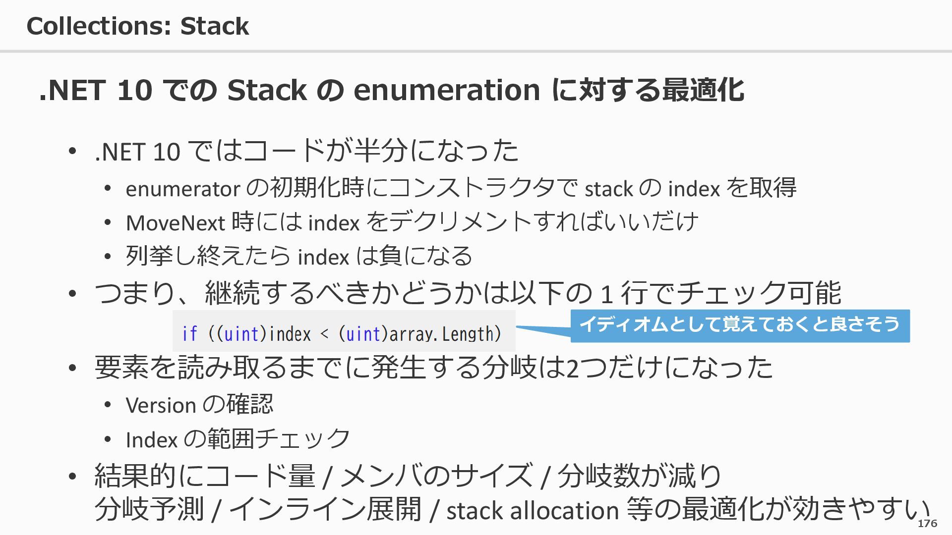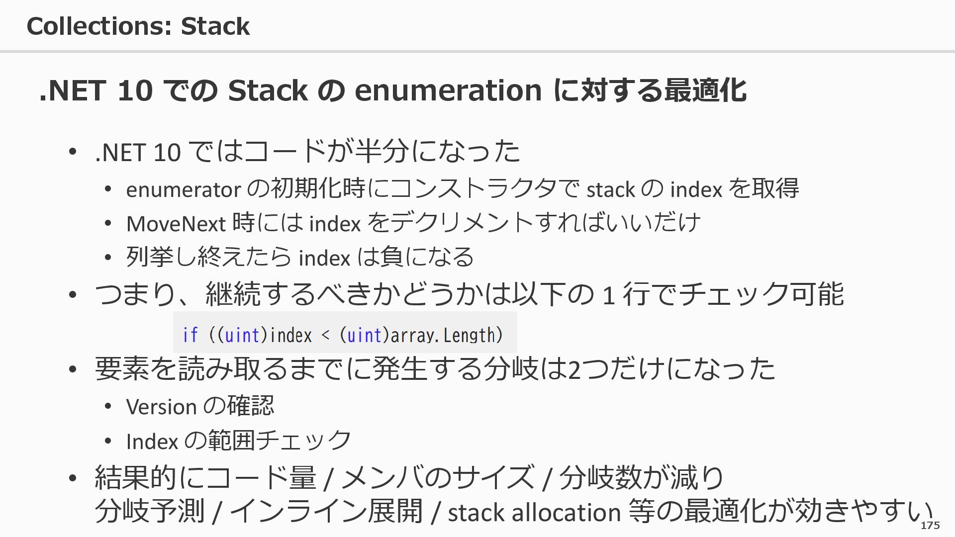 • .NET 10 ではコードが半分になった • enumerator の初期化時にコンストラクタで stack の index を取得 • MoveNext 時には index をデクリメントすればいいだけ • 列挙し終えたら index は負になる • つまり、継続するべきかどうかは以下の 1 行でチェック可能 • 要素を読み取るまでに発生する分岐は2つだけになった • Version の確認 • Index の範囲チェック • 結果的にコード量 / メンバのサイズ / 分岐数が減り 分岐予測 / インライン展開 / stack allocation 等の最適化が効きやすい