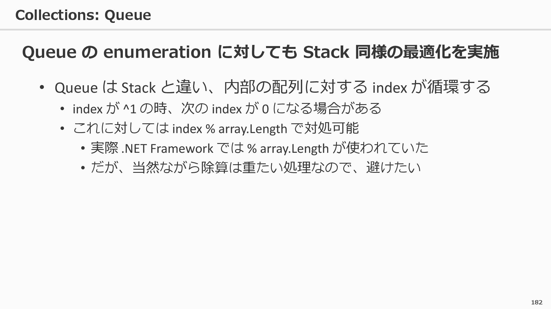 105. Collections: Queue 182 Queue の enumeration に対しても Stack 同様の最適化を実施 •
