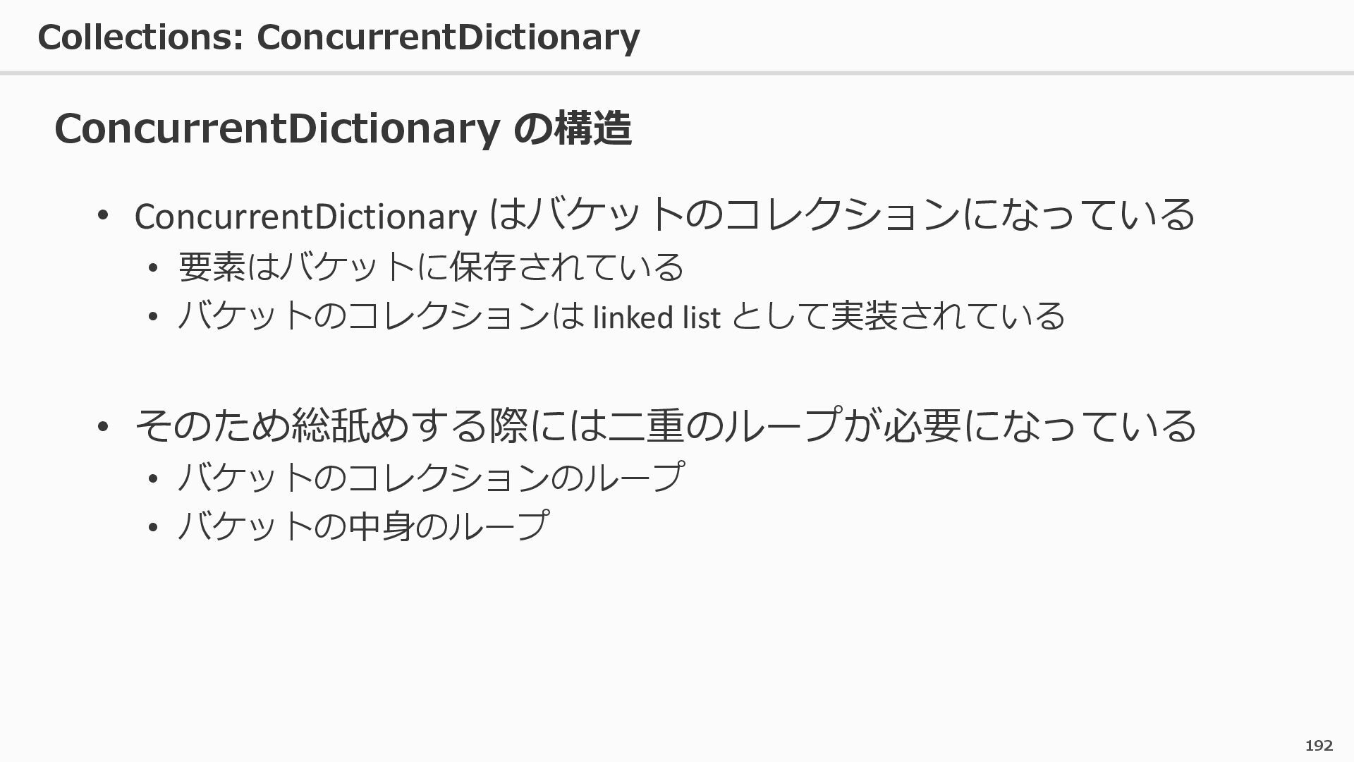 112. Collections: ConcurrentDictionary 192 ConcurrentDictionary の構造 • ConcurrentDictionary はバケットのコレクションになっている • 要素はバケットに保存されている