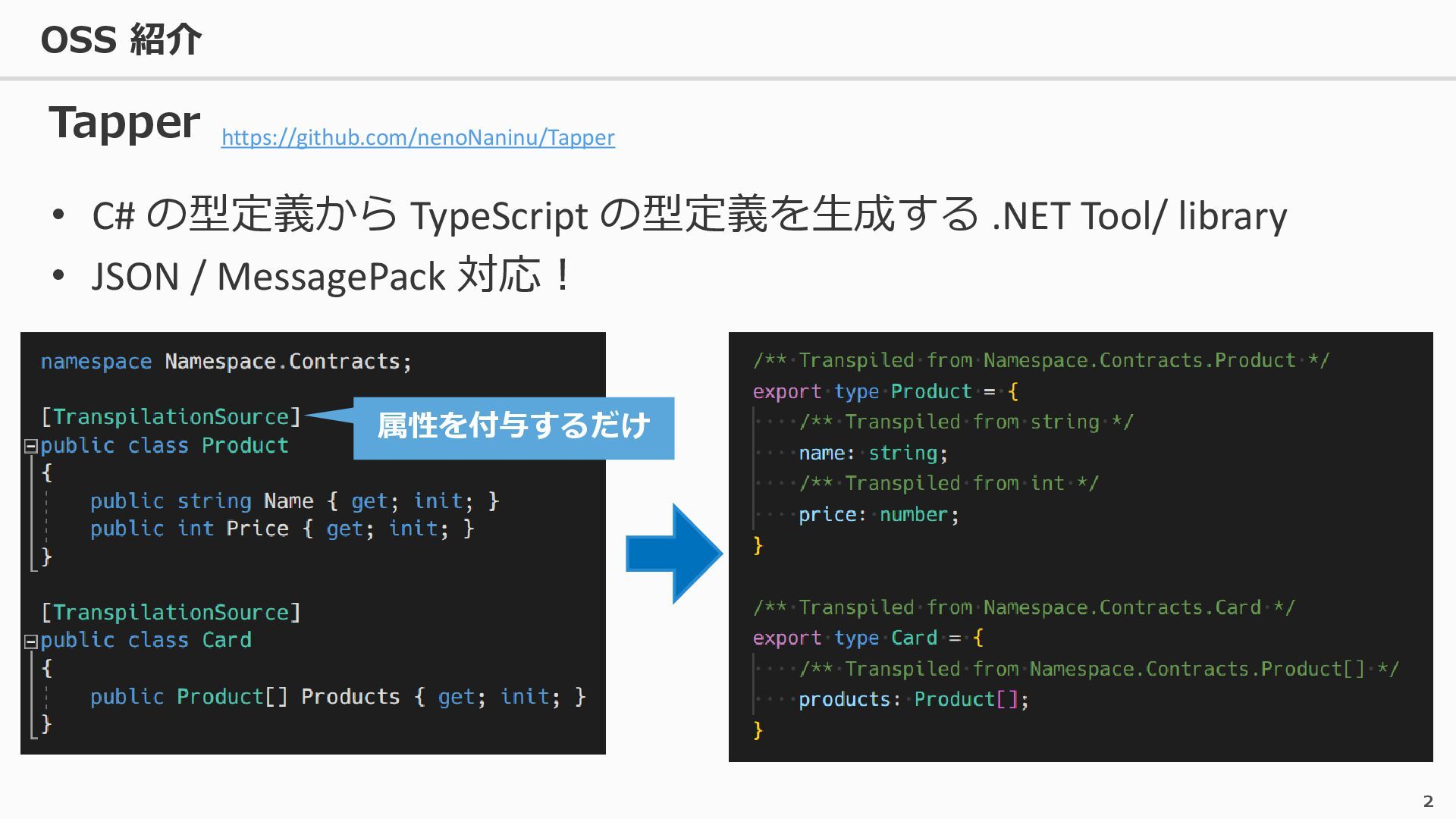 2. OSS 紹介 2 属性を付与するだけ Tapper • C# の型定義から TypeScript の型定義を生成する