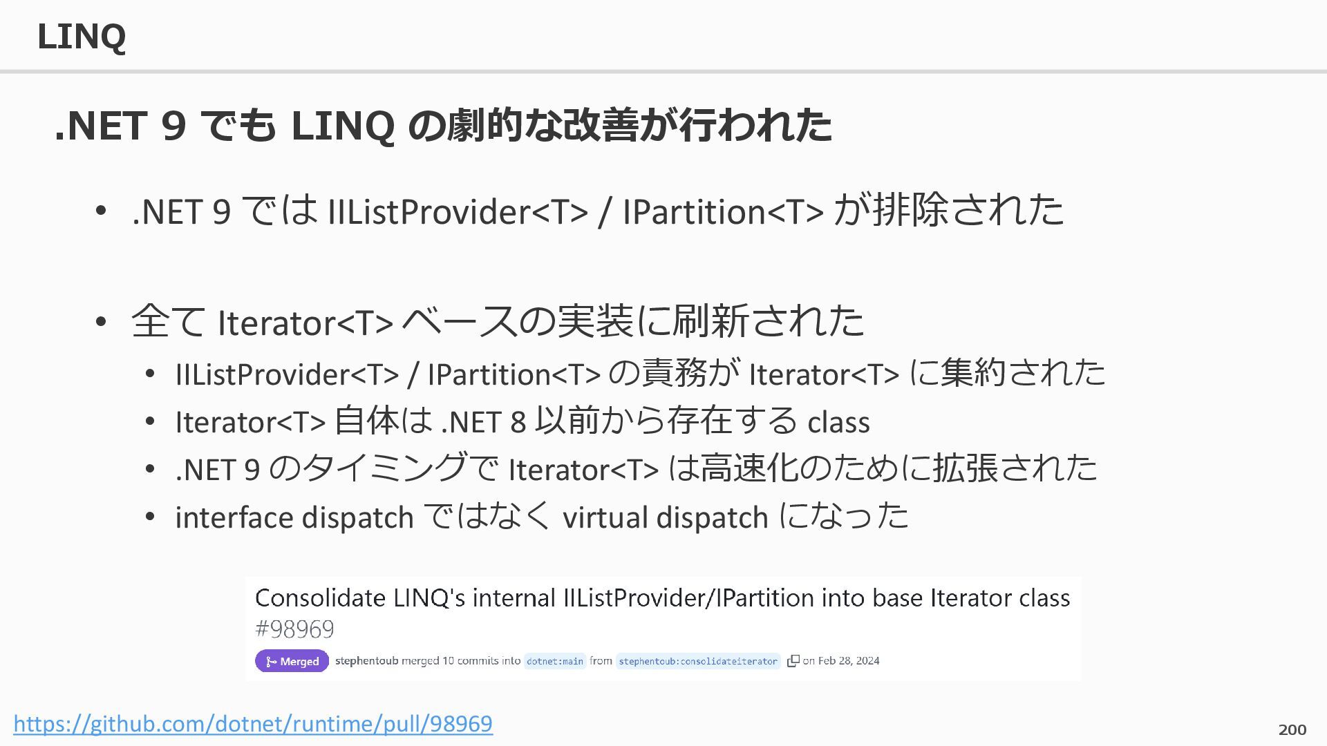 では IIListProvider<T> / IPartition<T> が排除された • 全て Iterator<T> ベースの実装に刷新された • IIListProvider<T> / IPartition<T> の責務が Iterator<T> に集約された • Iterator<T> 自体は .NET 8 以前から存在する class • .NET 9 のタイミングで Iterator<T> は高速化のために拡張された • interface dispatch ではなく virtual dispatch になった https://github.com/dotnet/runtime/pull/98969