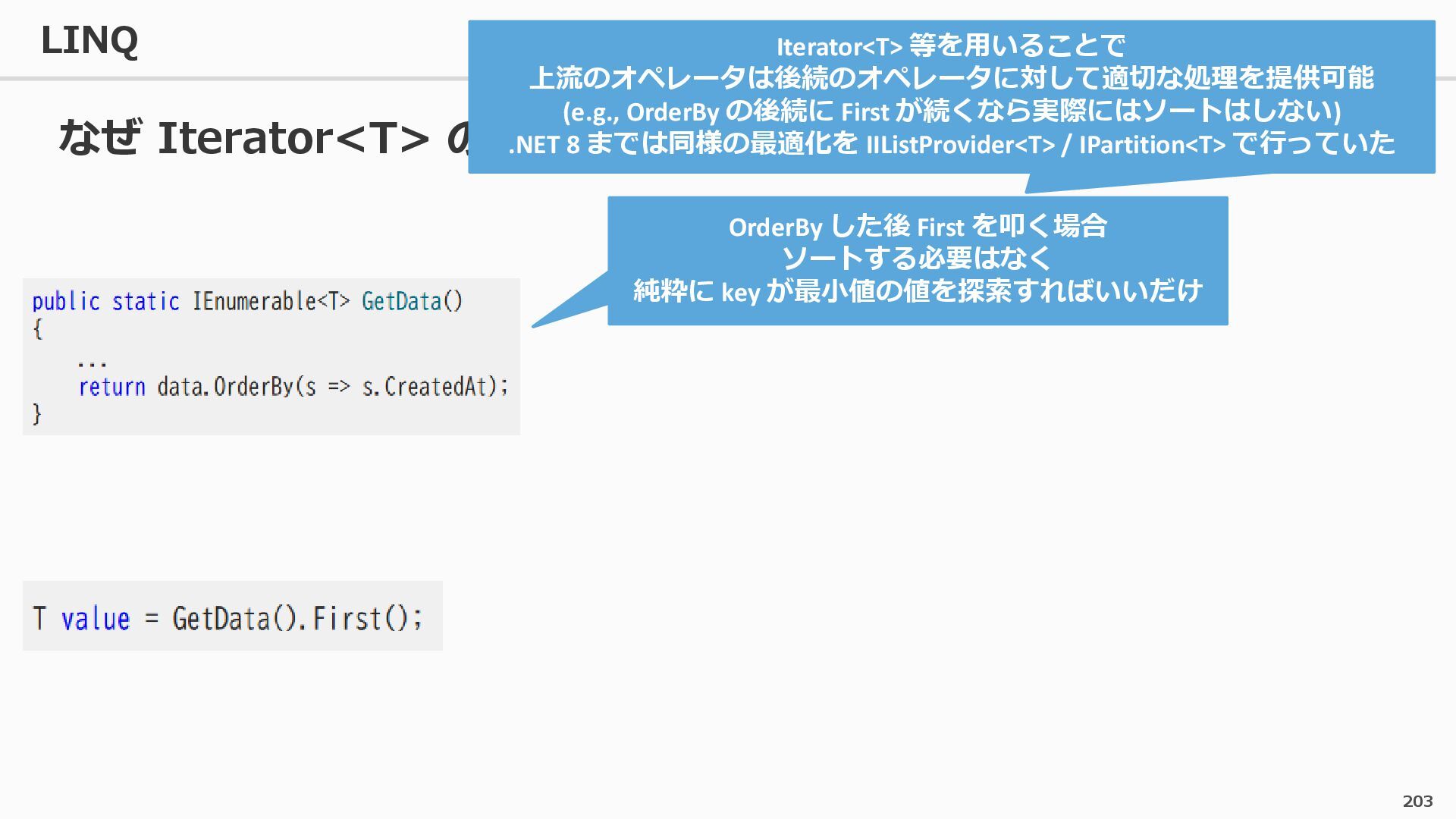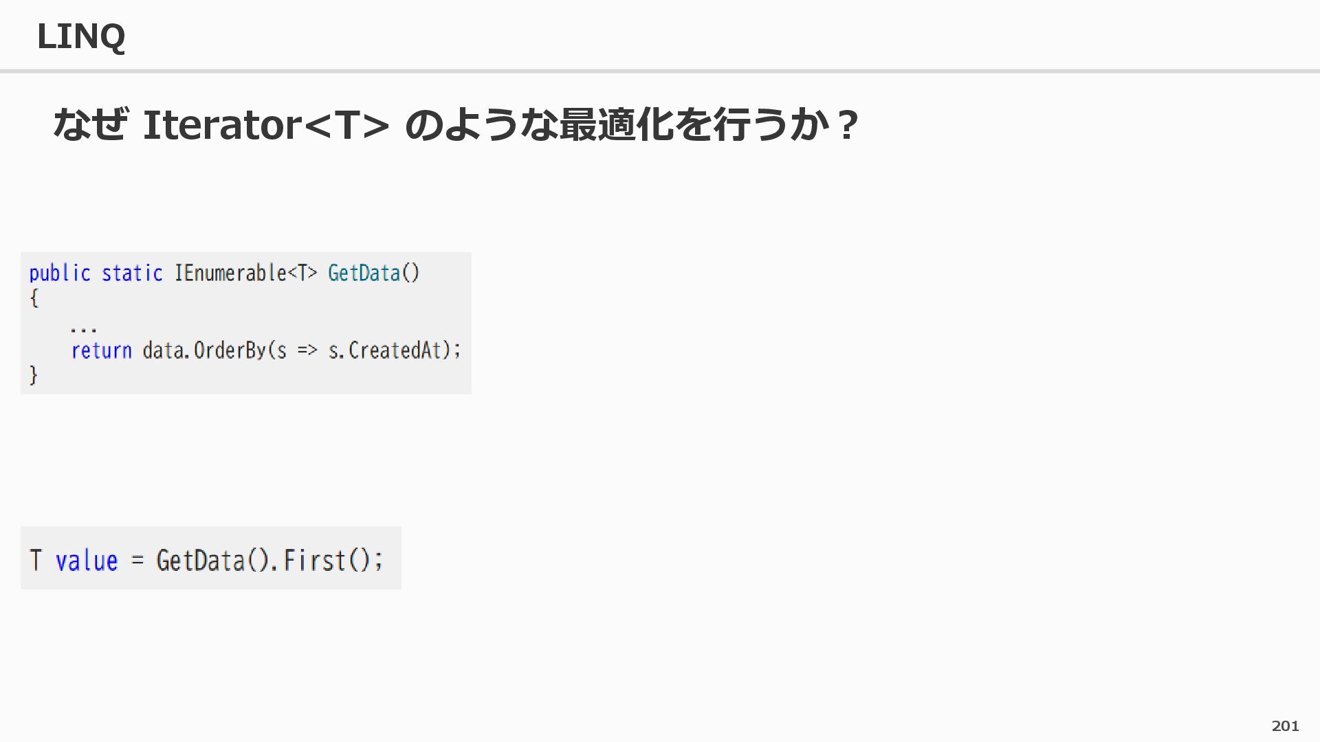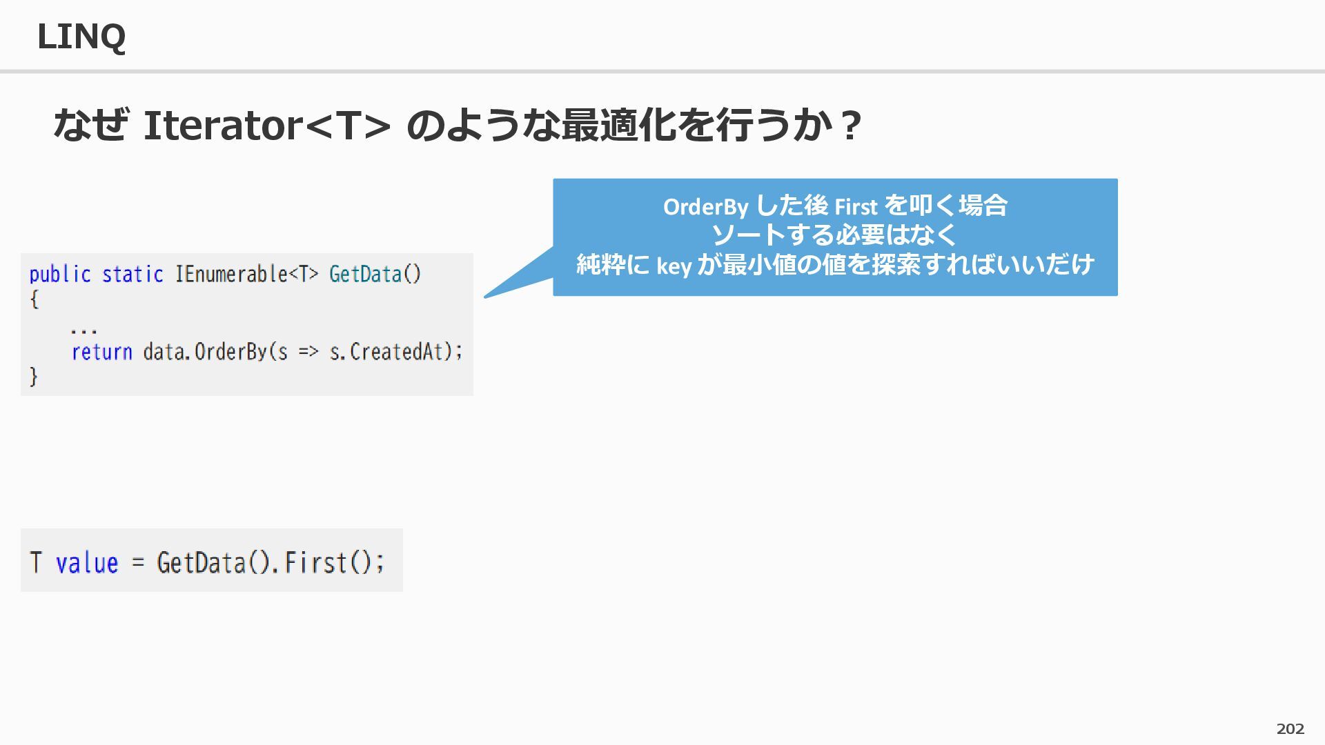 118. LINQ 205 なぜ Iterator<T> のような最適化を行うか? OrderBy した後 First を叩く場合 ソートする必要はなく