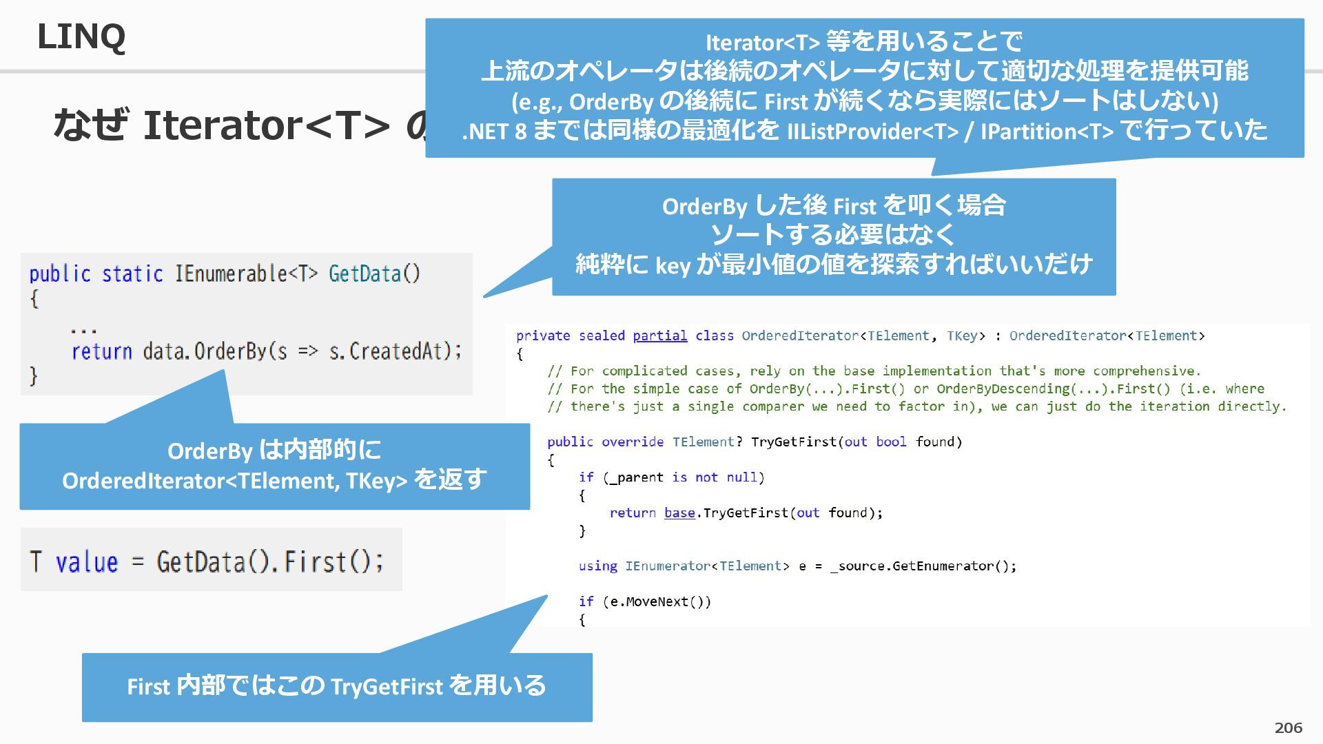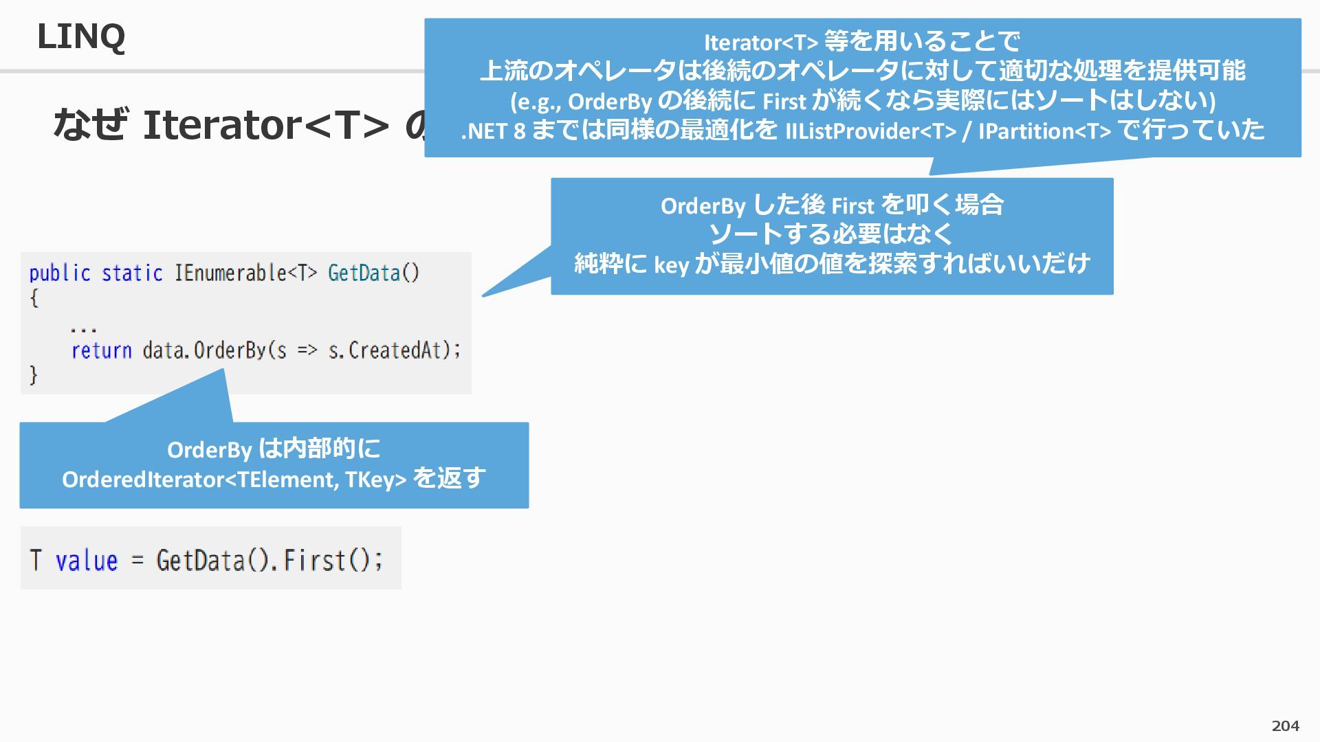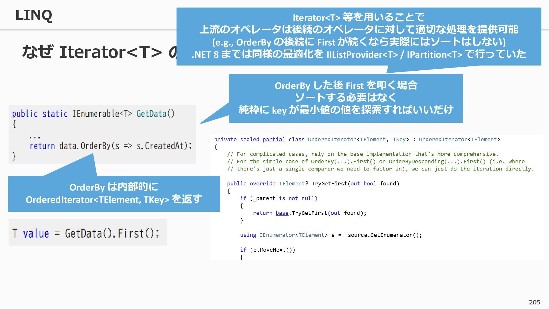 118. LINQ 205 なぜ Iterator<T> のような最適化を行うか? OrderBy した後 First を叩く場合 ソートする必要はなく