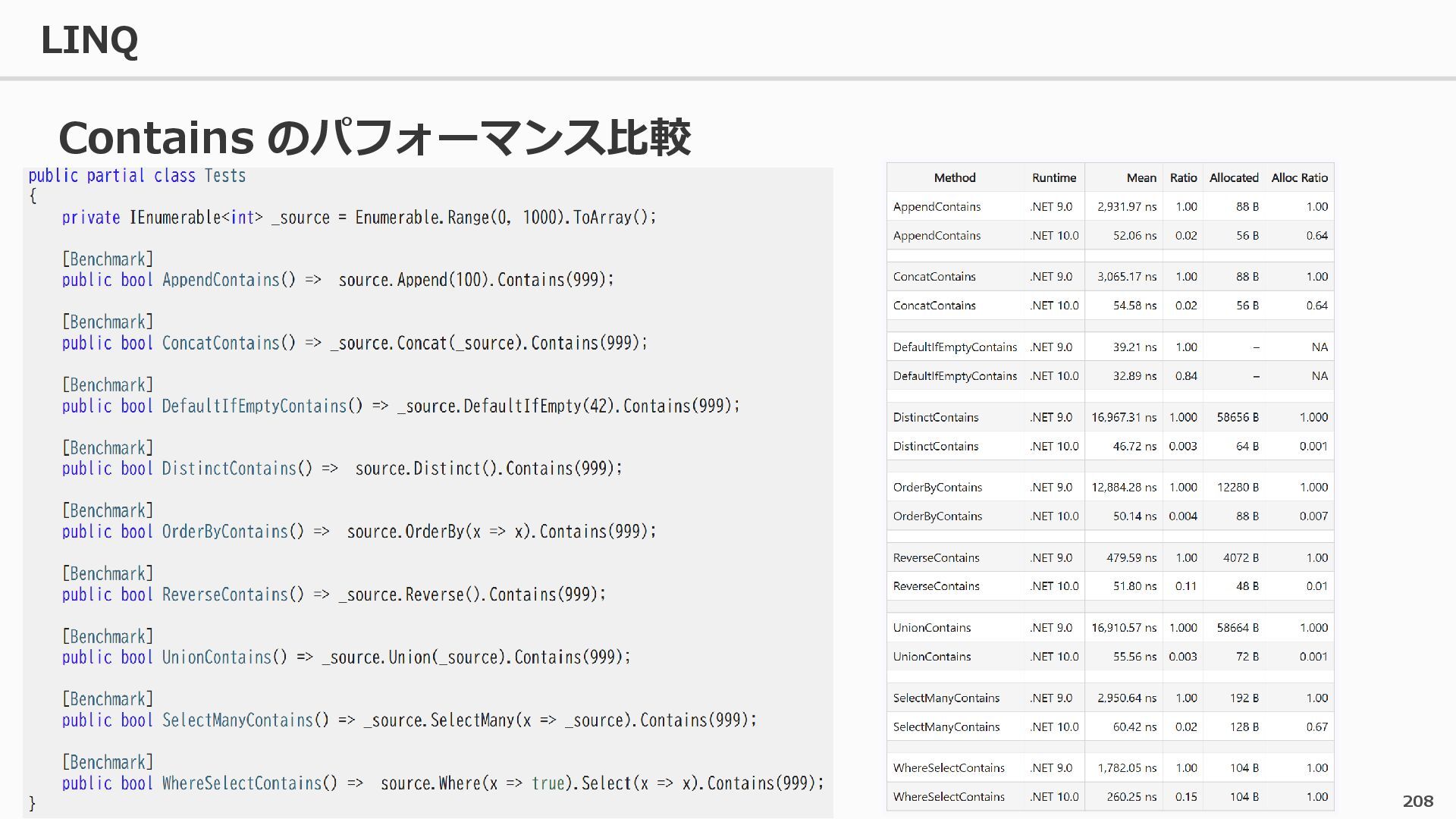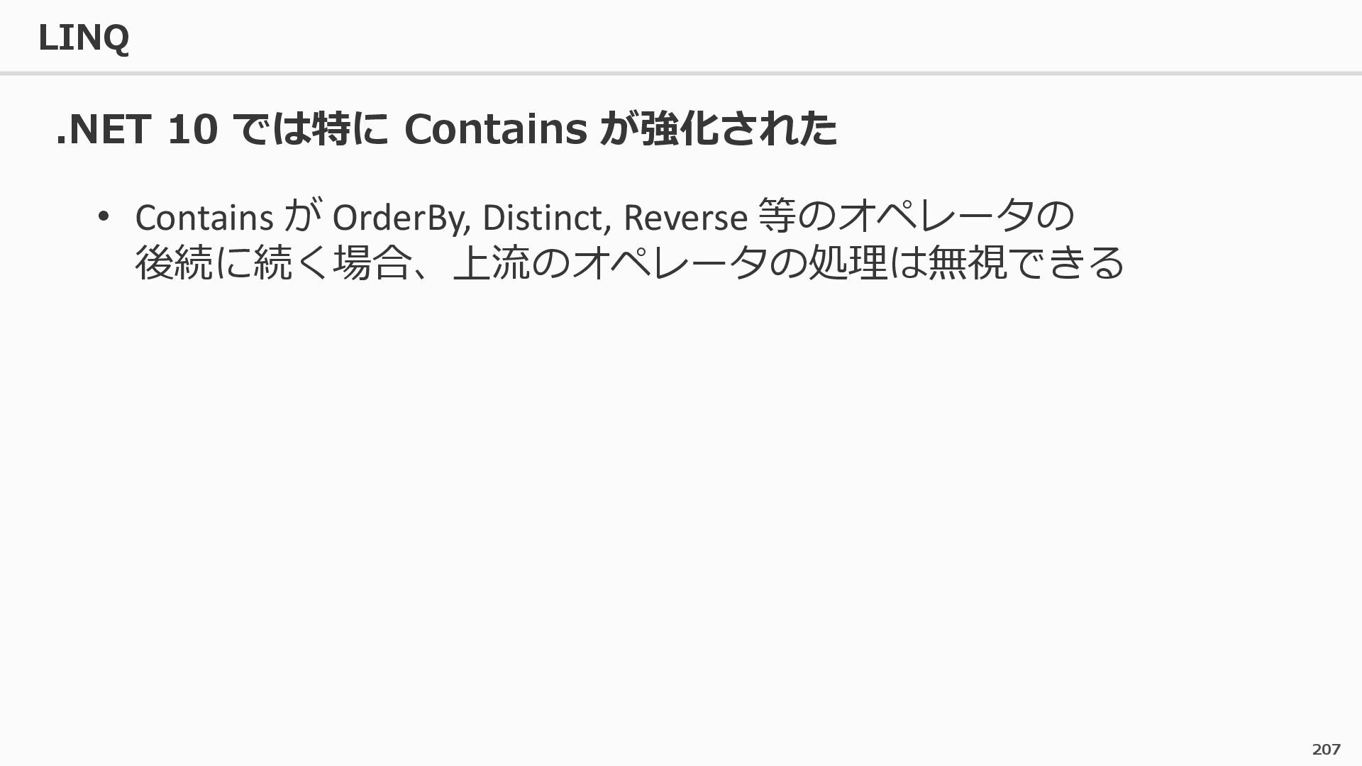120. LINQ 207 .NET 10 では特に Contains が強化された • Contains が