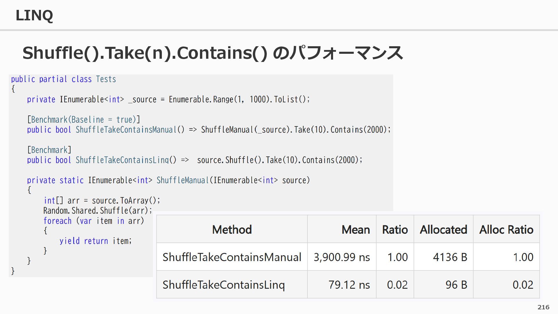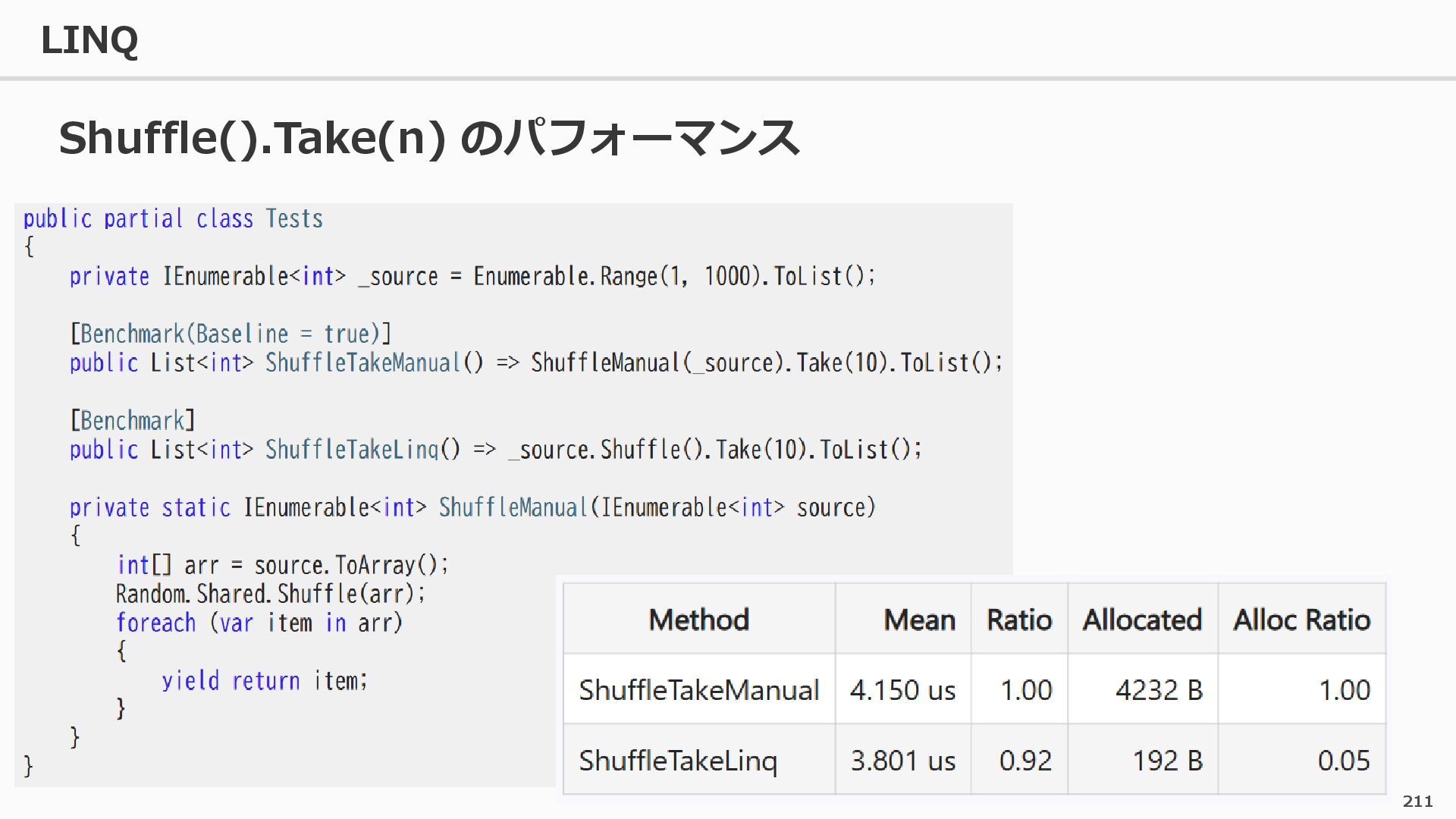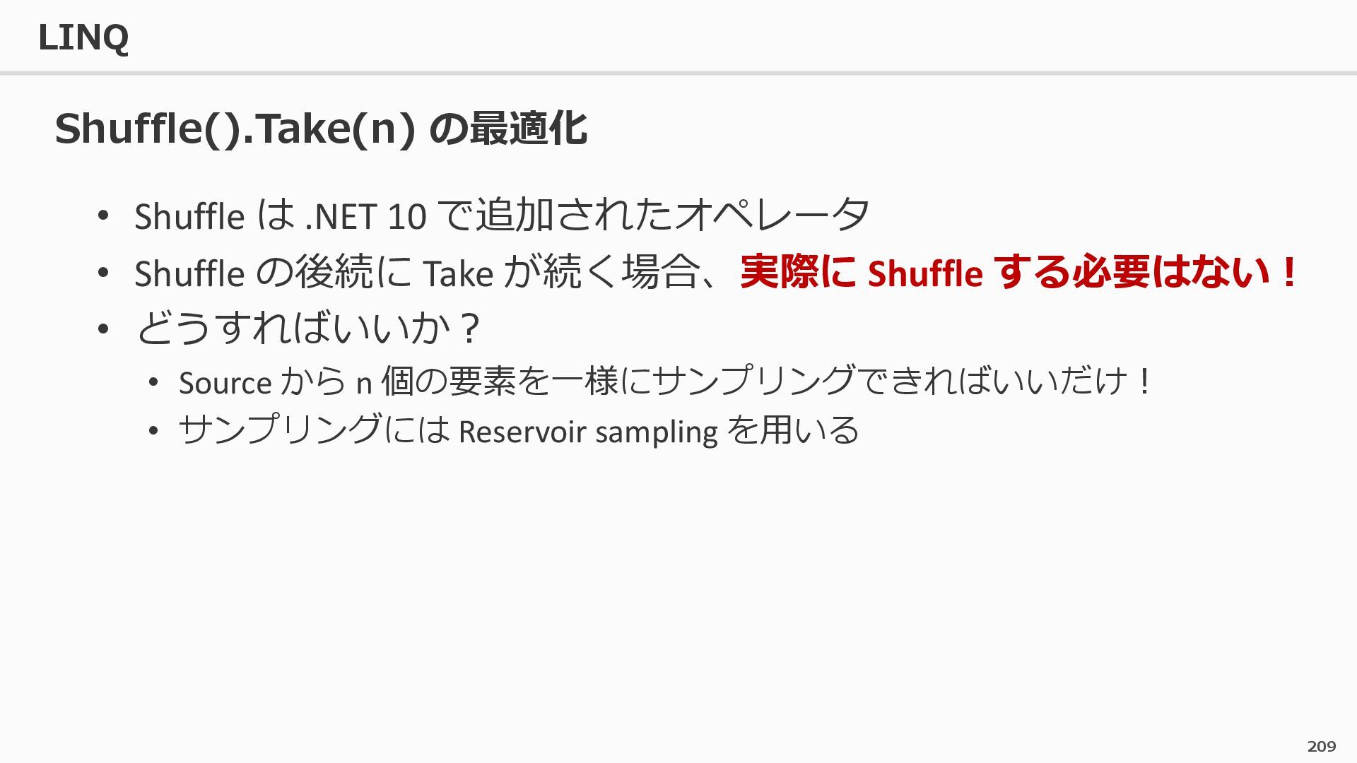 121. LINQ 209 Shuffle().Take(n) の最適化 • Shuffle は .NET 10 で追加されたオペレータ