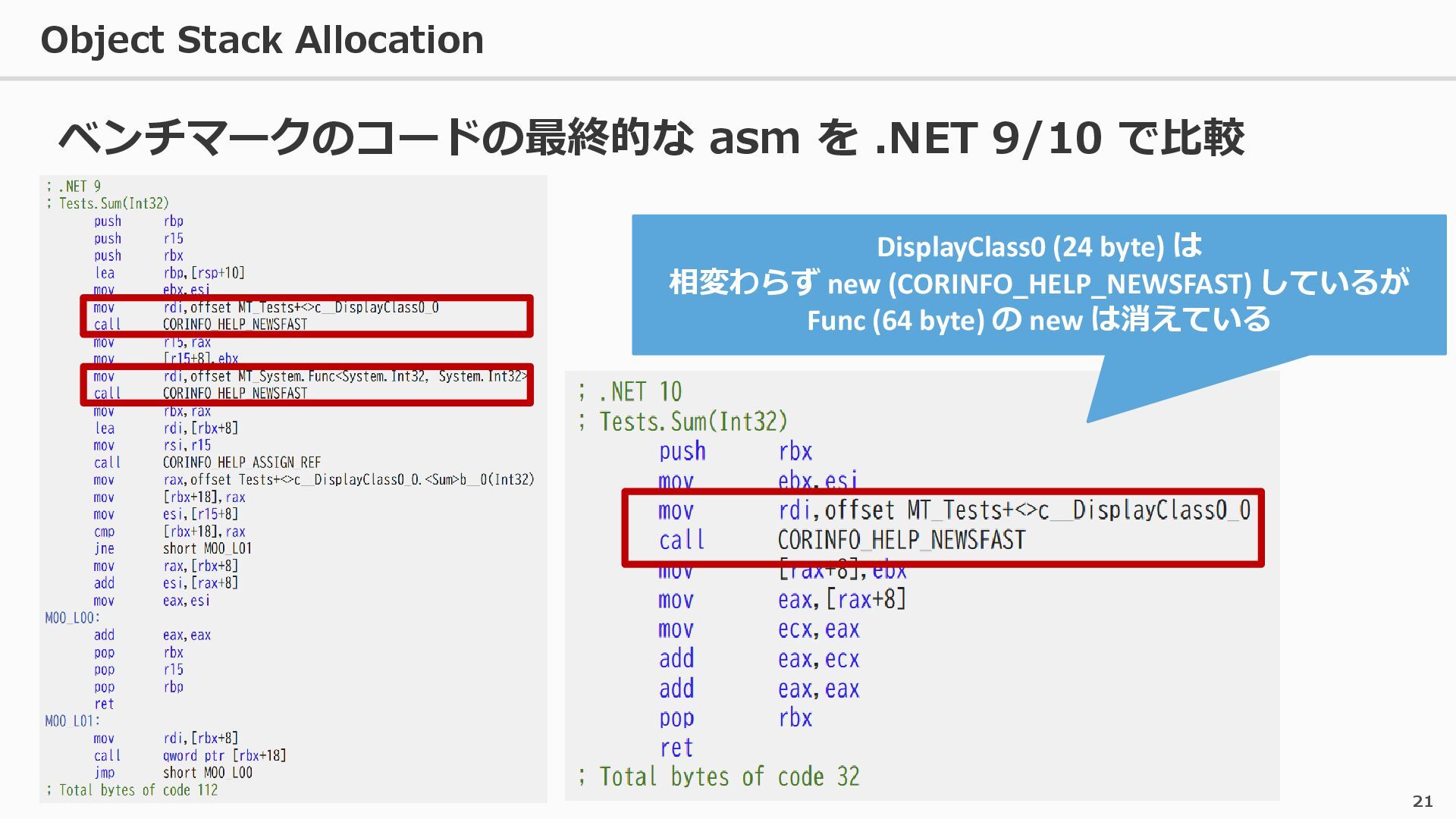 10. Object Stack Allocation 21 ベンチマークのコードの最終的な asm を .NET 9/10 で比較