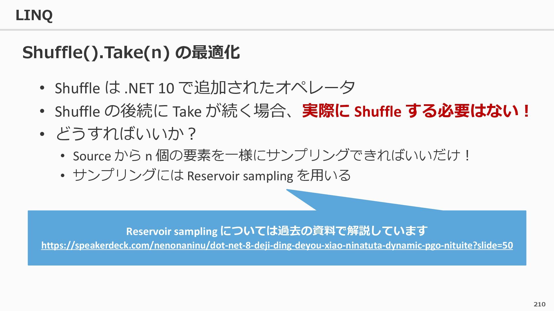 • Shuffle の後続に Take が続く場合、実際に Shuffle する必要はない! • どうすればいいか? • Source から n 個の要素を一様にサンプリングできればいいだけ! • サンプリングには Reservoir sampling を用いる Reservoir sampling については過去の資料で解説しています https://speakerdeck.com/nenonaninu/dot-net-8-deji-ding-deyou-xiao-ninatuta-dynamic-pgo-nituite?slide=50