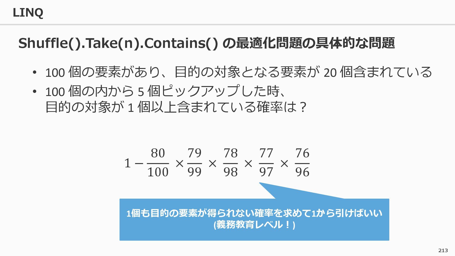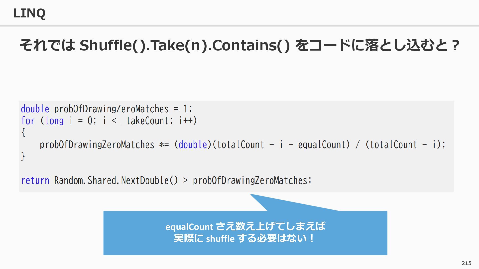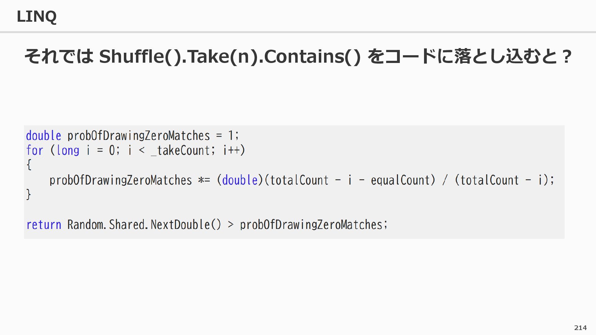 123. LINQ 212 Shuffle().Take(n).Contains() の最適化 • Shuffle().Take(n).Contains() をこの LINQ は totalCount