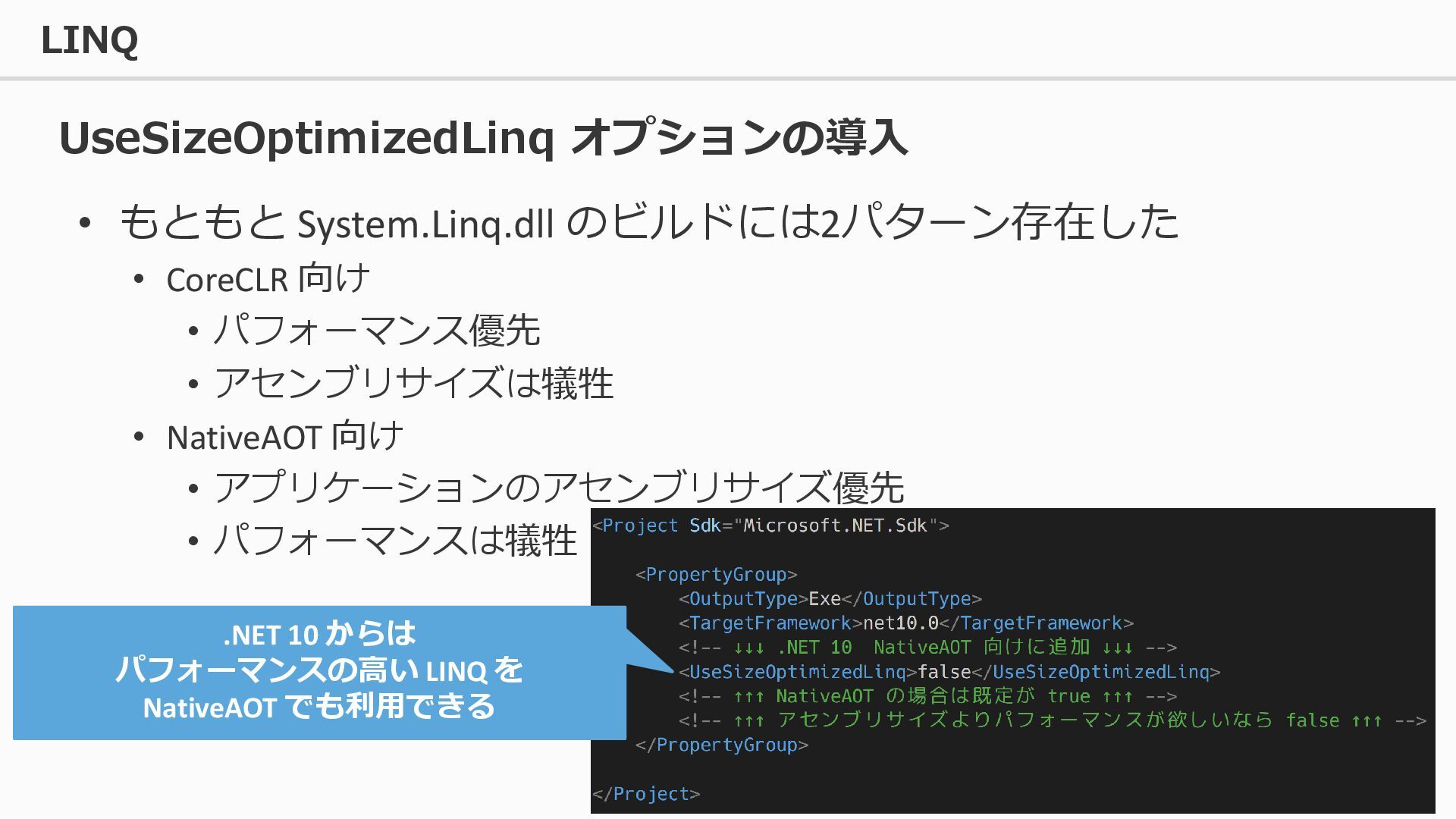 向け • パフォーマンス優先 • アセンブリサイズは犠牲 • NativeAOT 向け • アプリケーションのアセンブリサイズ優先 • パフォーマンスは犠牲 .NET 10 からは パフォーマンスの高い LINQ を NativeAOT でも利用できる