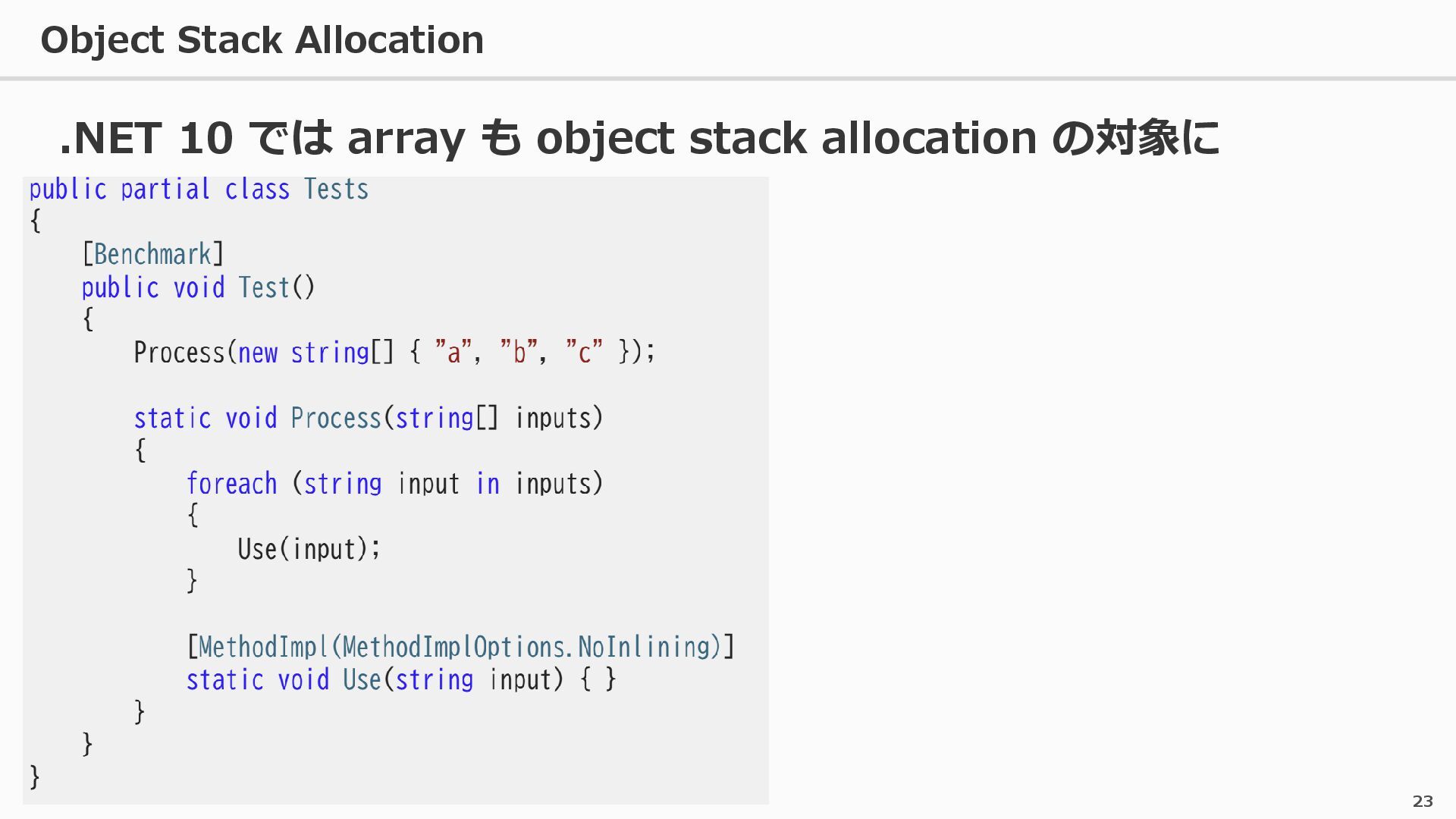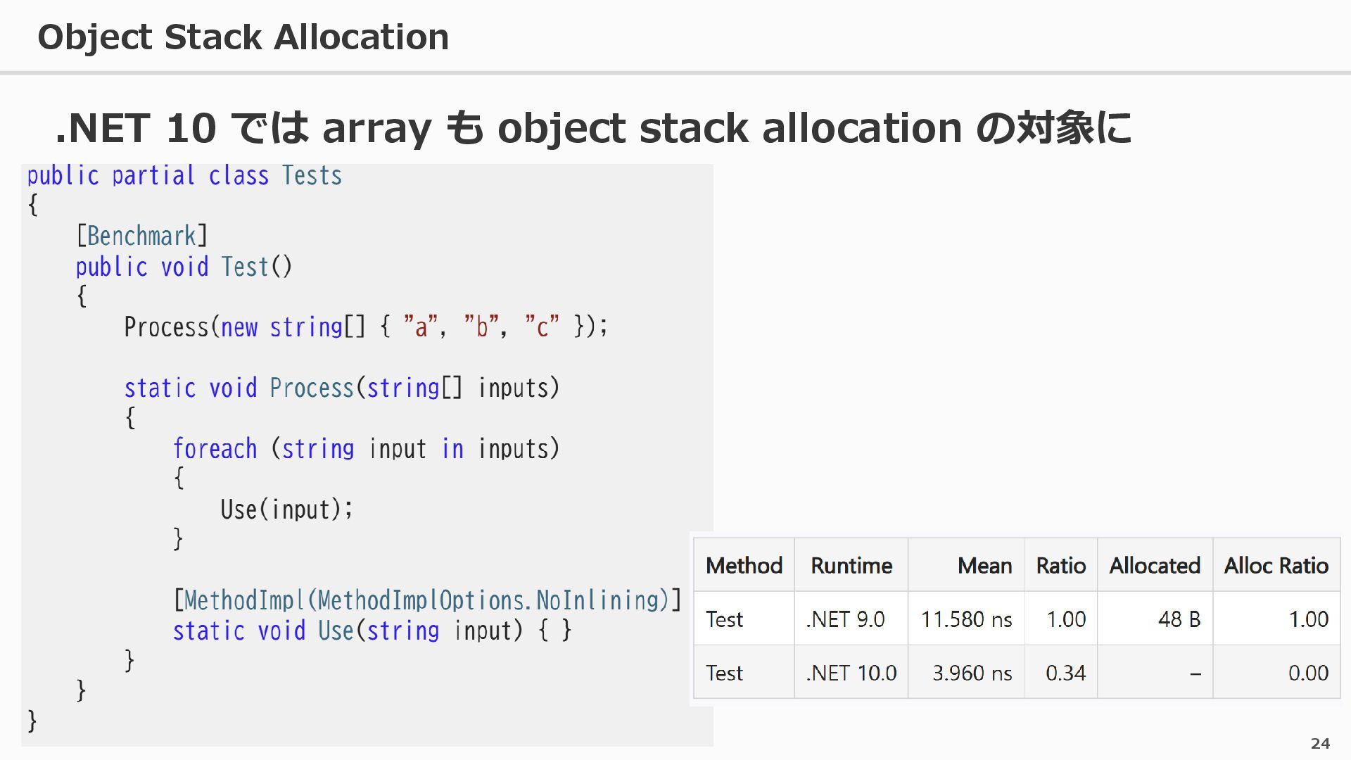 14. Object Stack Allocation 27 .NET 10 では array も object