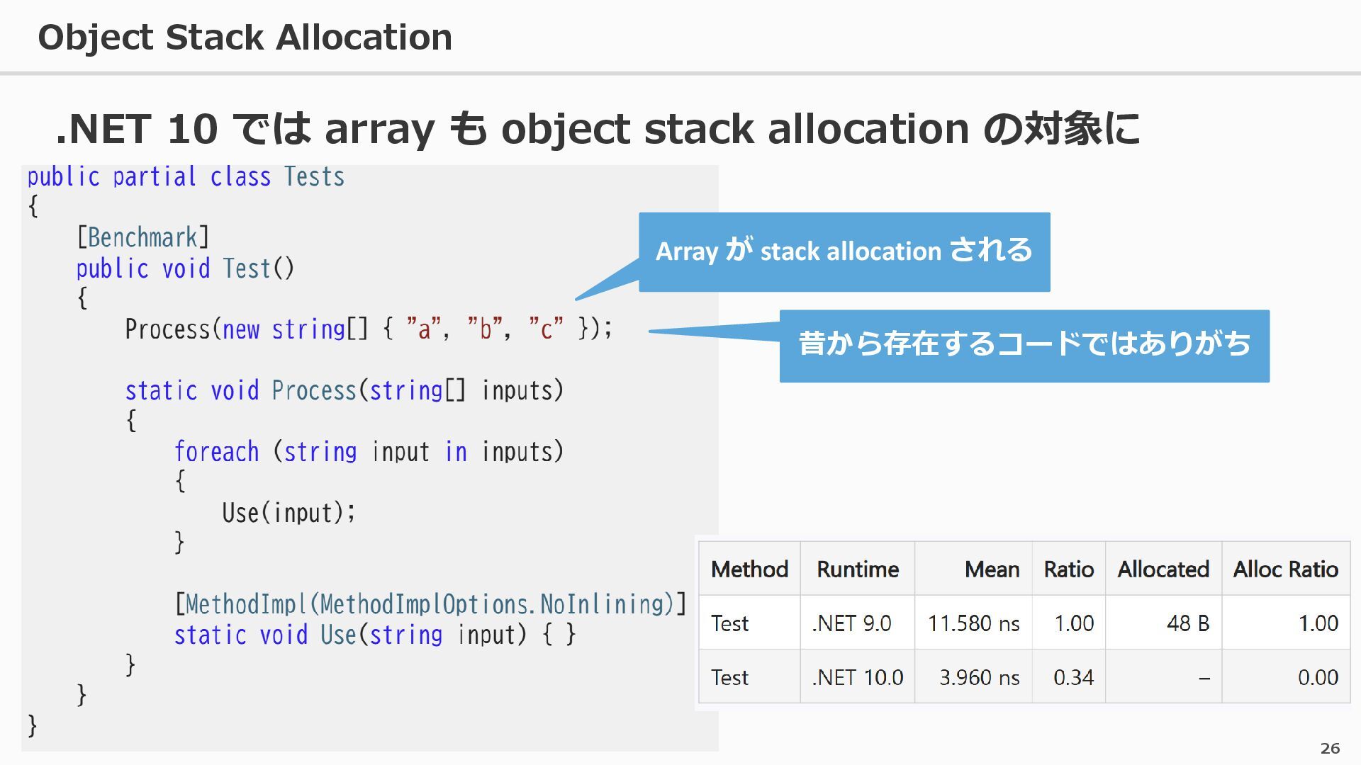 13. Object Stack Allocation 26 .NET 10 では array も object