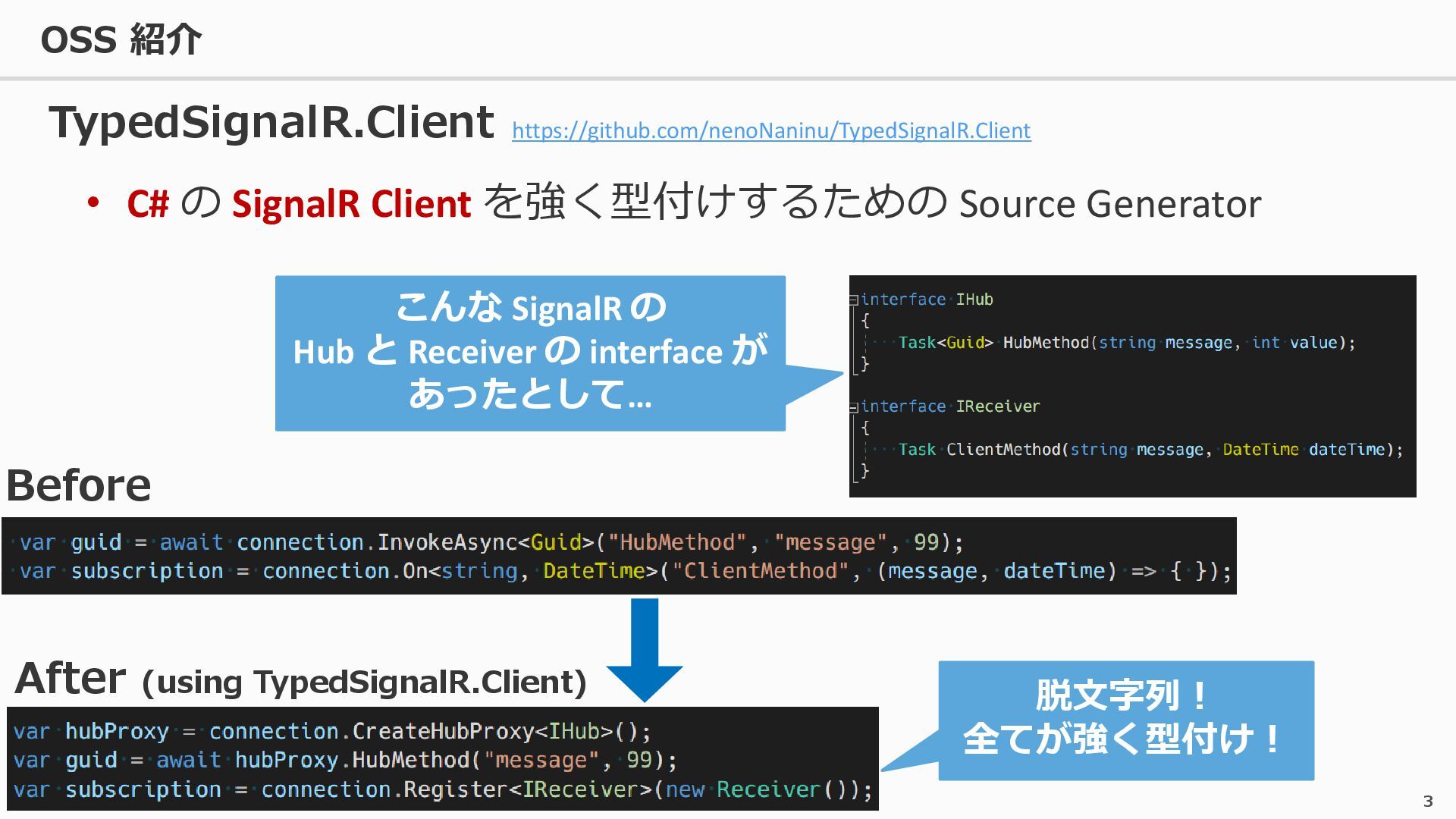 3. OSS 紹介 3 • C# の SignalR Client を強く型付けするための Source