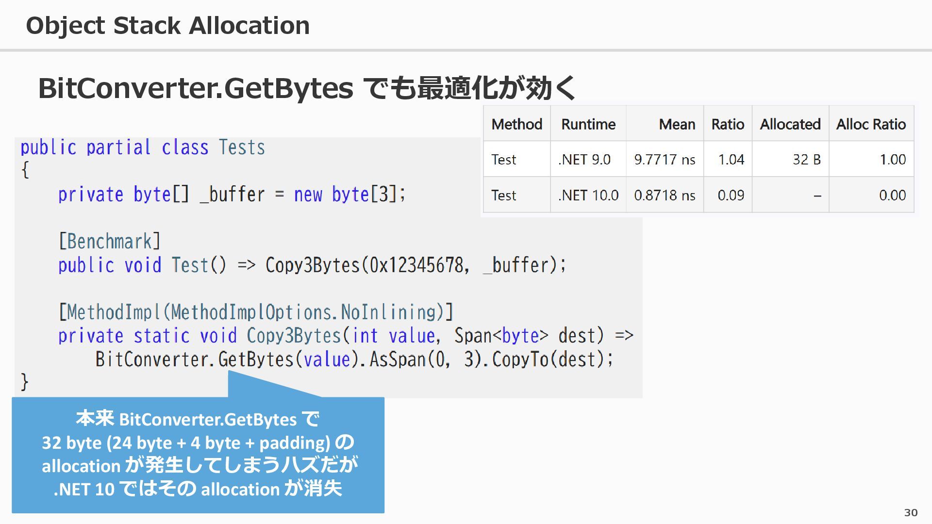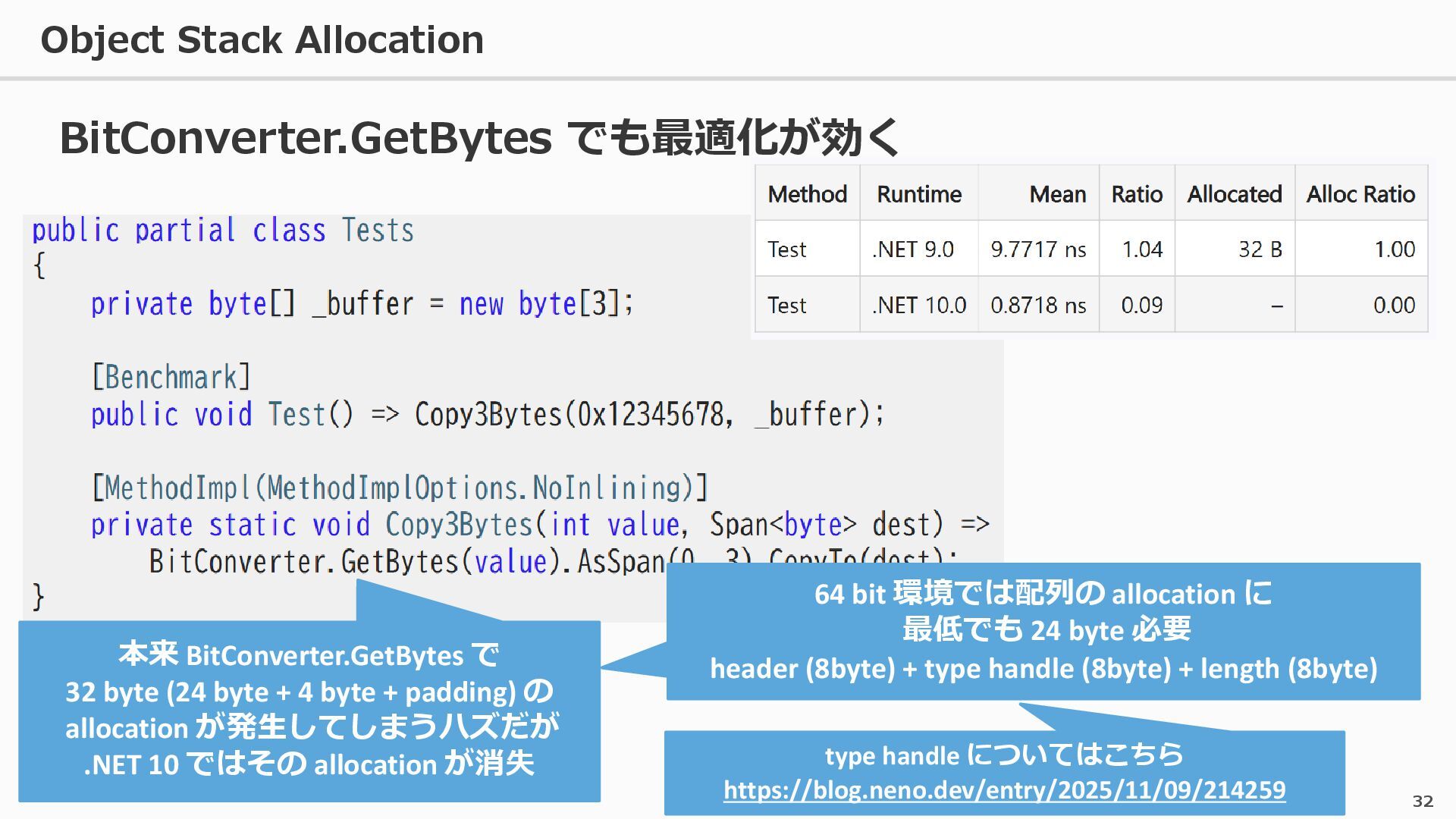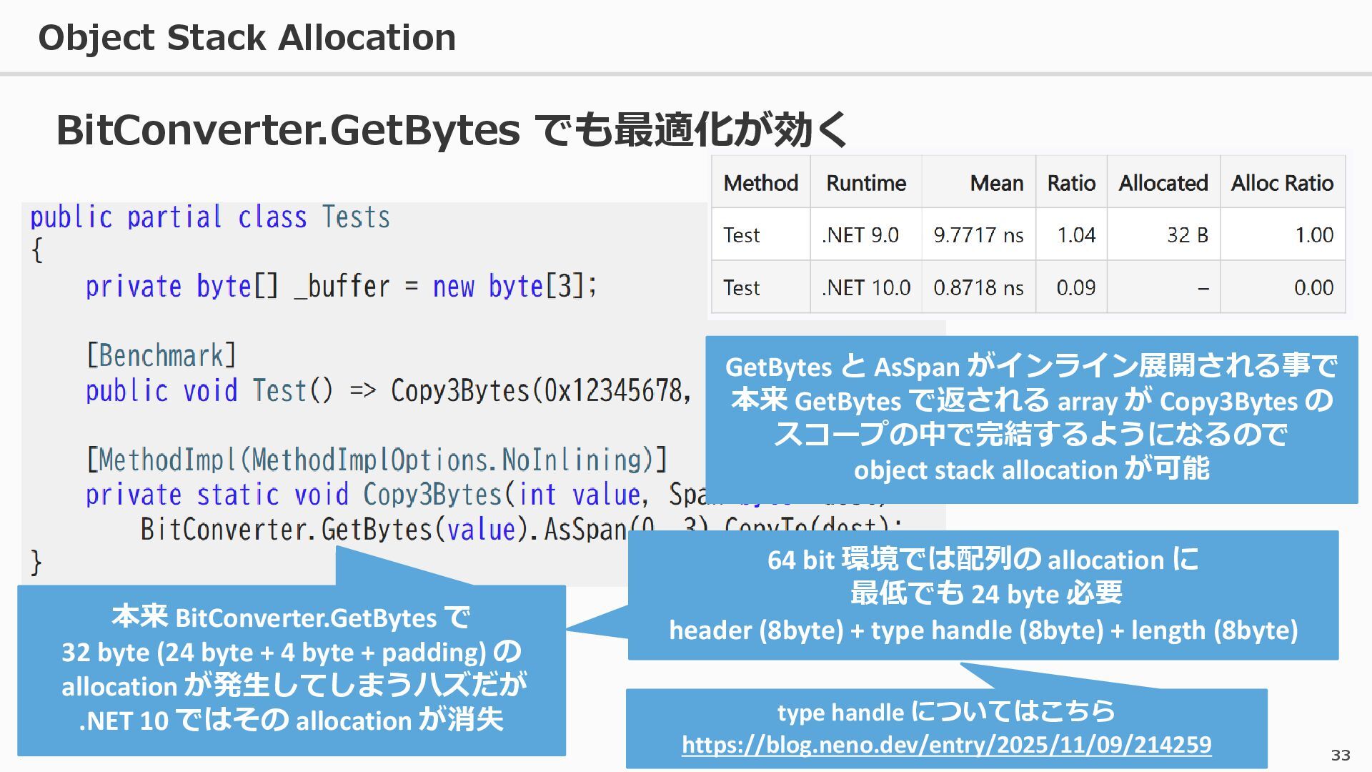 byte (24 byte + 4 byte + padding) の allocation が発生してしまうハズだが .NET 10 ではその allocation が消失 GetBytes と AsSpan がインライン展開される事で 本来 GetBytes で返される array が Copy3Bytes の スコープの中で完結するようになるので object stack allocation が可能 64 bit 環境では配列の allocation に 最低でも 24 byte 必要 header (8byte) + type handle (8byte) + length (8byte) type handle についてはこちら https://blog.neno.dev/entry/2025/11/09/214259