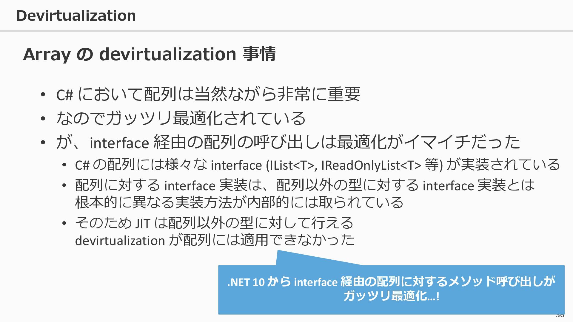 の配列には様々な interface (IList<T>, IReadOnlyList<T> 等) が実装されている • 配列に対する interface 実装は、配列以外の型に対する interface 実装とは 根本的に異なる実装方法が内部的には取られている • そのため JIT は配列以外の型に対して行える devirtualization が配列には適用できなかった Devirtualization 35 Array の devirtualization 事情