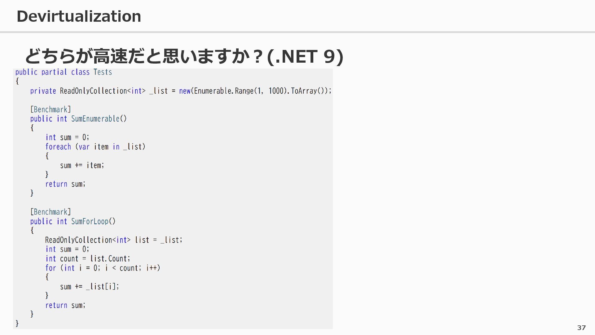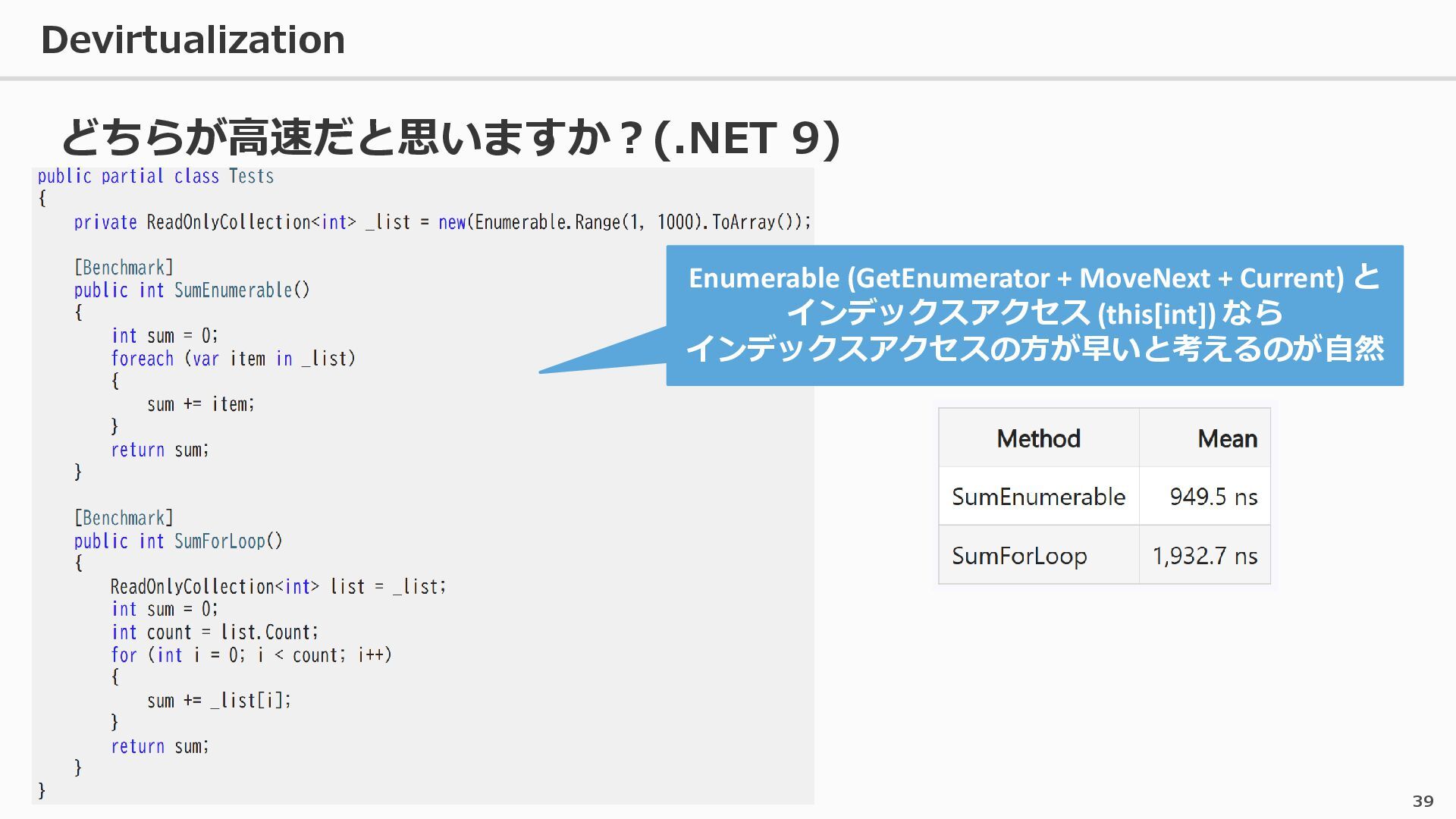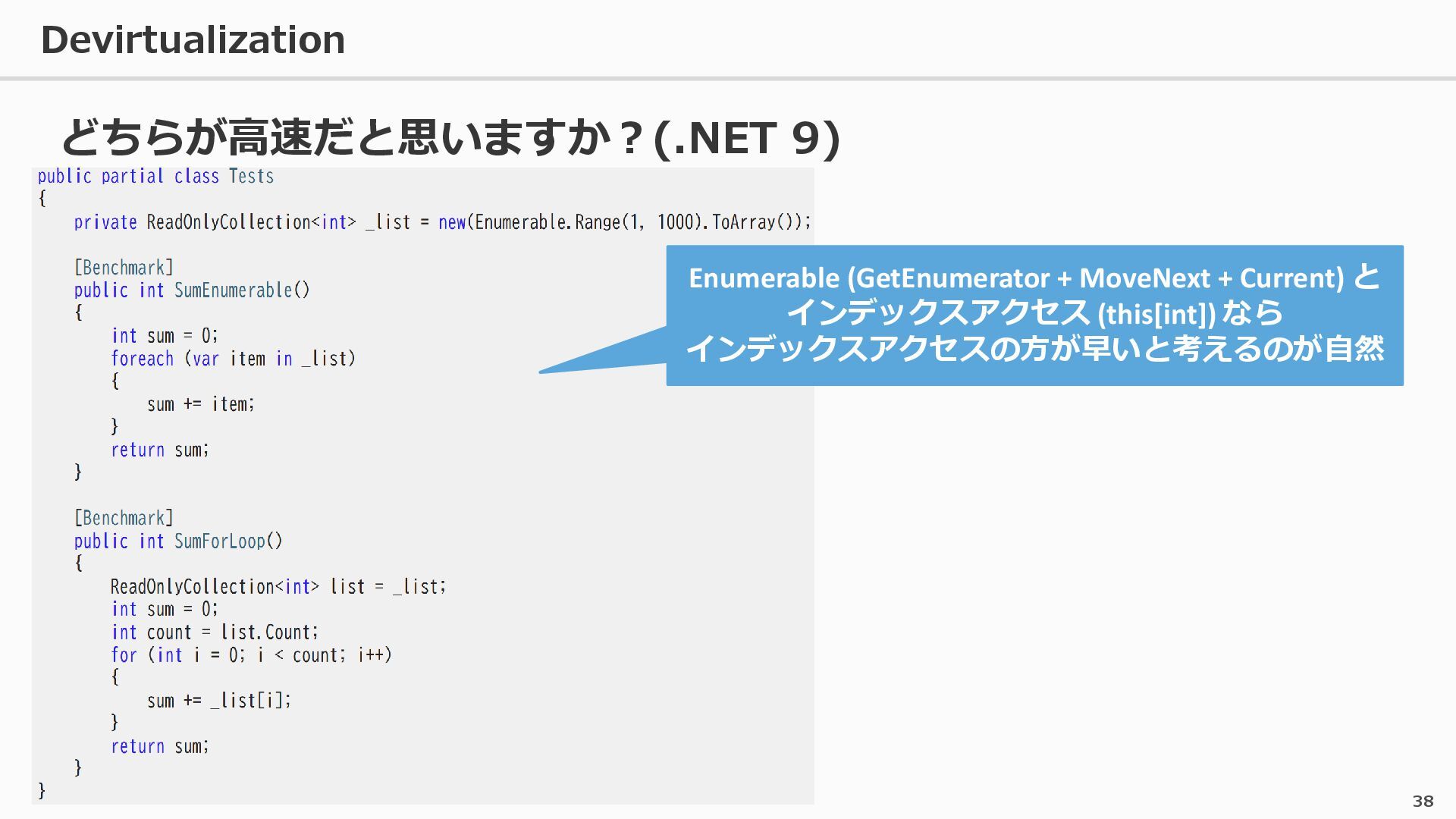 21. Devirtualization 38 どちらが高速だと思いますか?(.NET 9) Enumerable (GetEnumerator + MoveNext + Current)