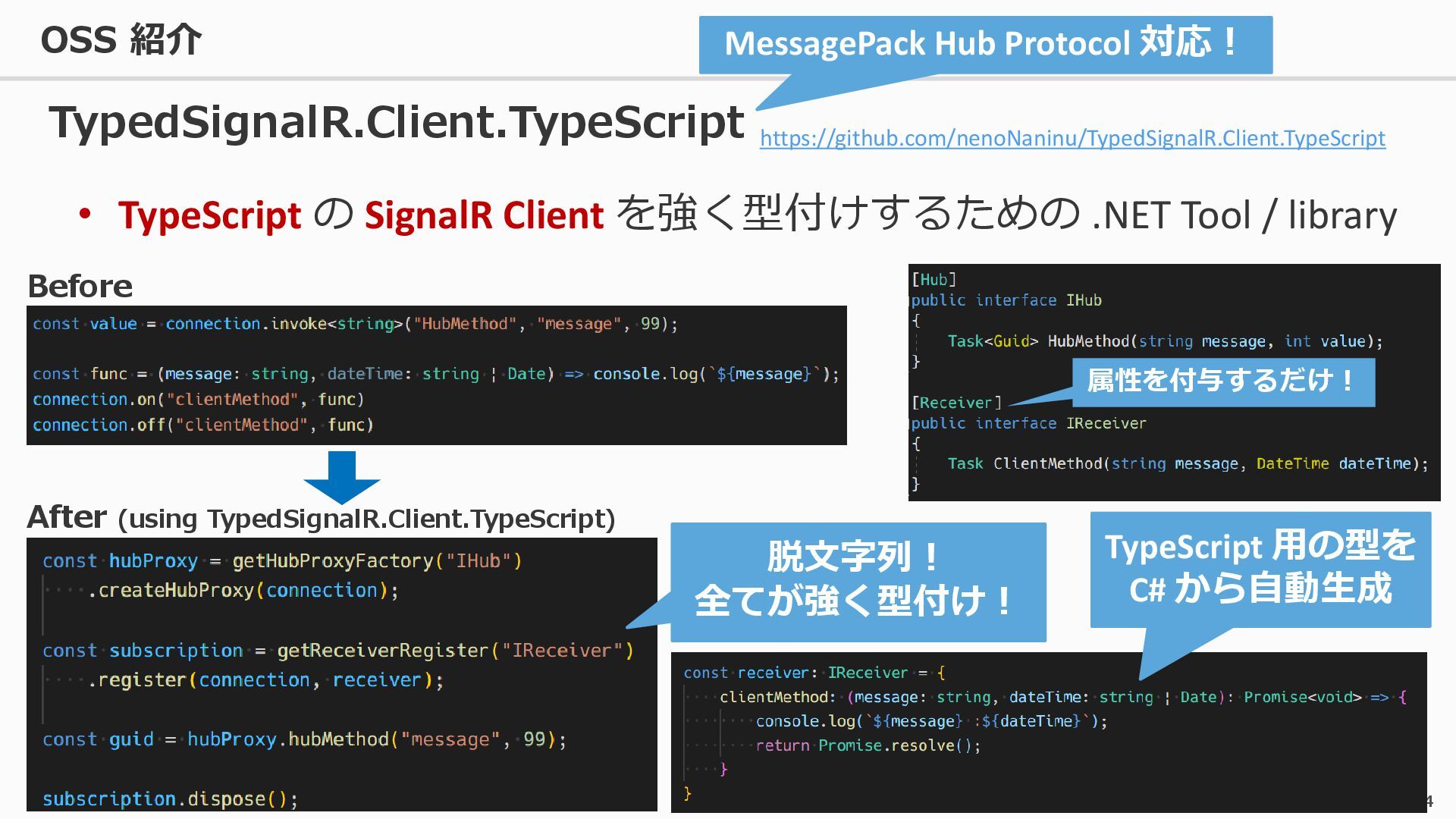 library TypedSignalR.Client.TypeScript Before After (using TypedSignalR.Client.TypeScript) 脱文字列! 全てが強く型付け! TypeScript 用の型を C# から自動生成 MessagePack Hub Protocol 対応! https://github.com/nenoNaninu/TypedSignalR.Client.TypeScript 属性を付与するだけ! OSS 紹介