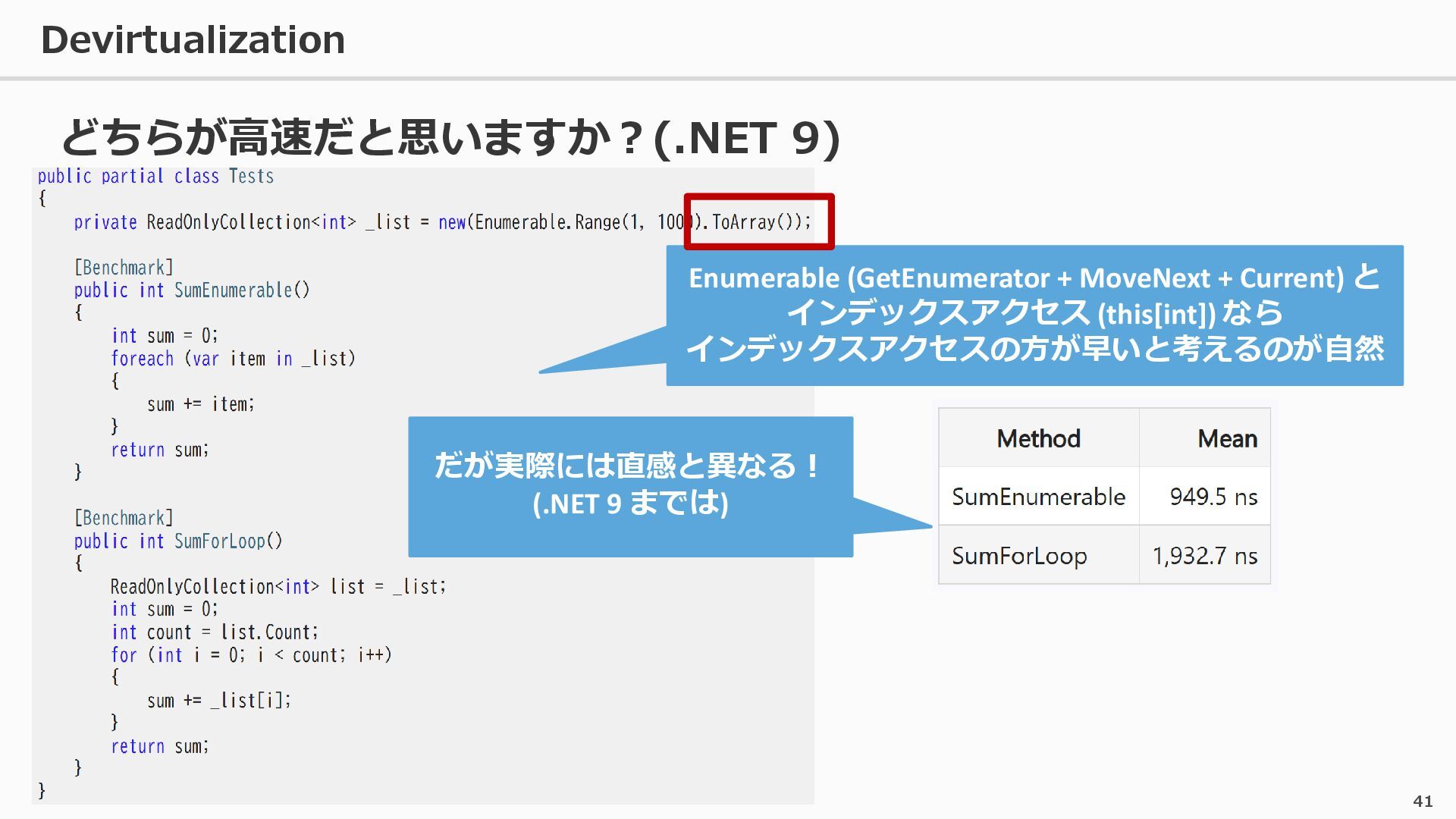 23. Devirtualization 40 どちらが高速だと思いますか?(.NET 9) だが実際には直感と異なる! (.NET 9 までは) Enumerable (GetEnumerator