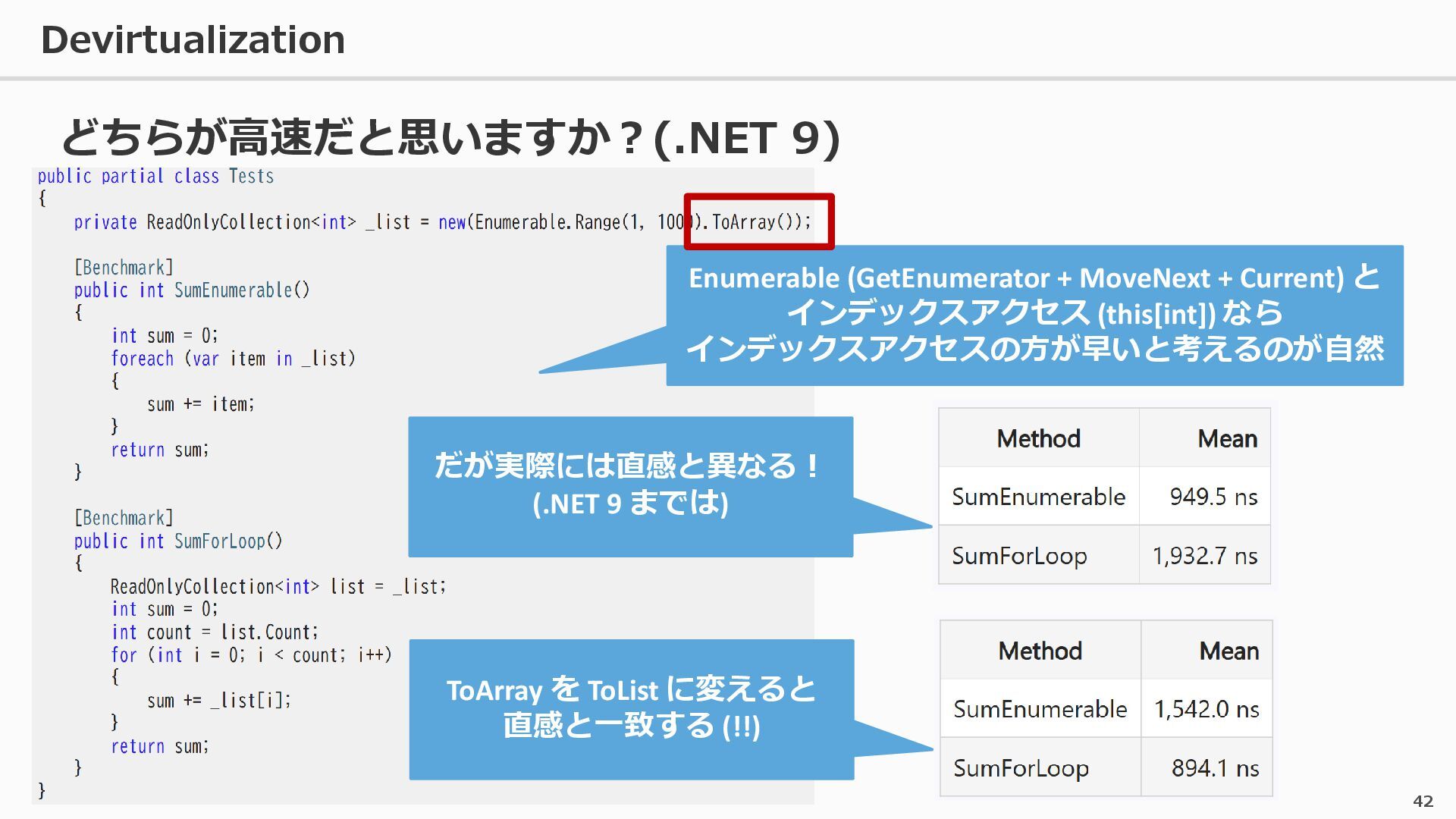 25. Devirtualization 42 どちらが高速だと思いますか?(.NET 9) ToArray を ToList に変えると 直感と一致する (!!)