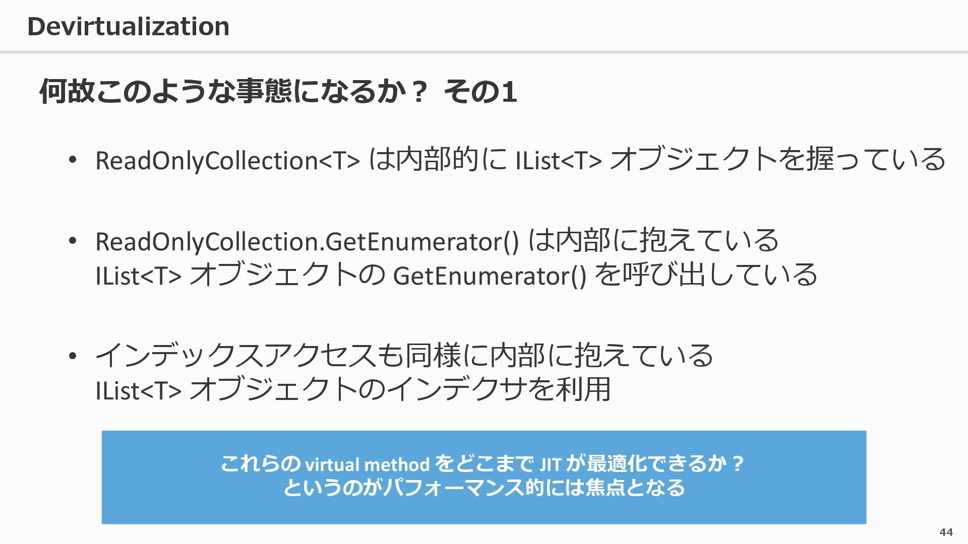 ReadOnlyCollection.GetEnumerator() は内部に抱えている IList<T> オブジェクトの GetEnumerator() を呼び出している • インデックスアクセスも同様に内部に抱えている IList<T> オブジェクトのインデクサを利用 これらの virtual method をどこまで JIT が最適化できるか? というのがパフォーマンス的には焦点となる