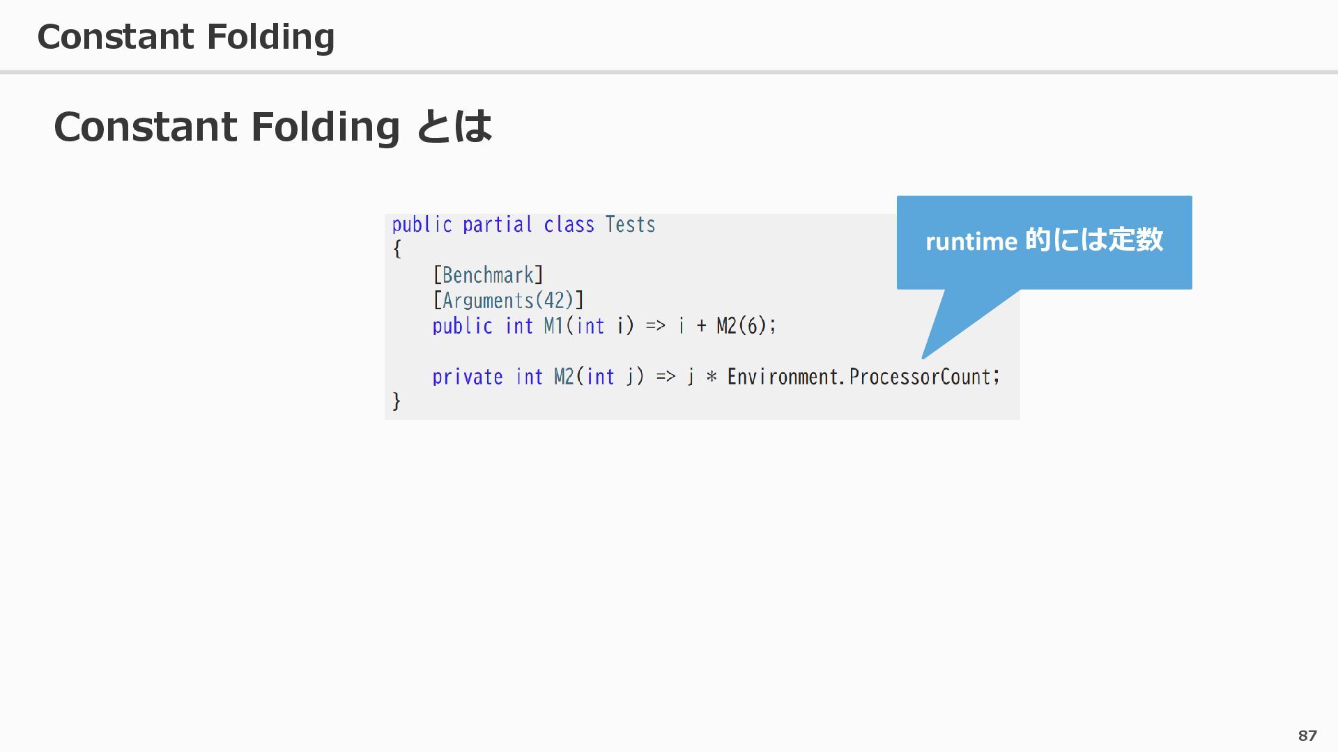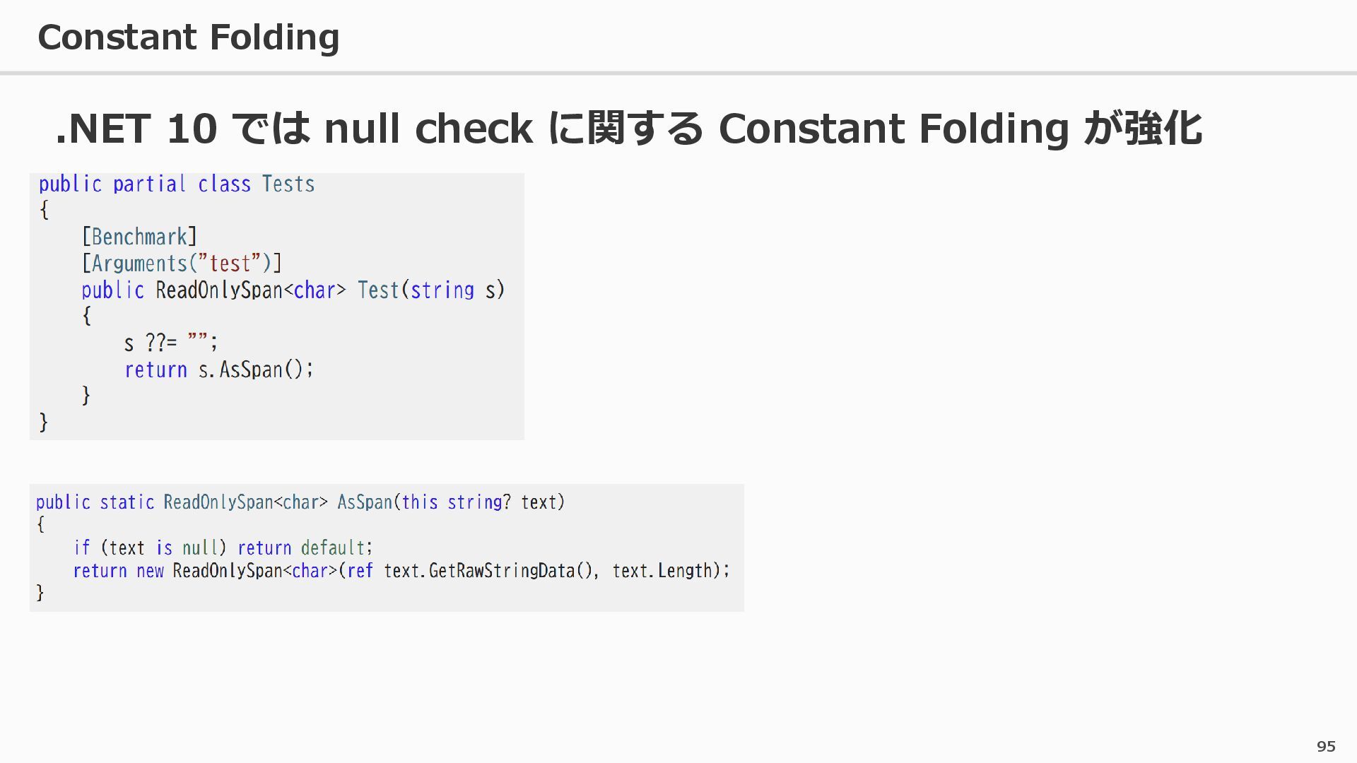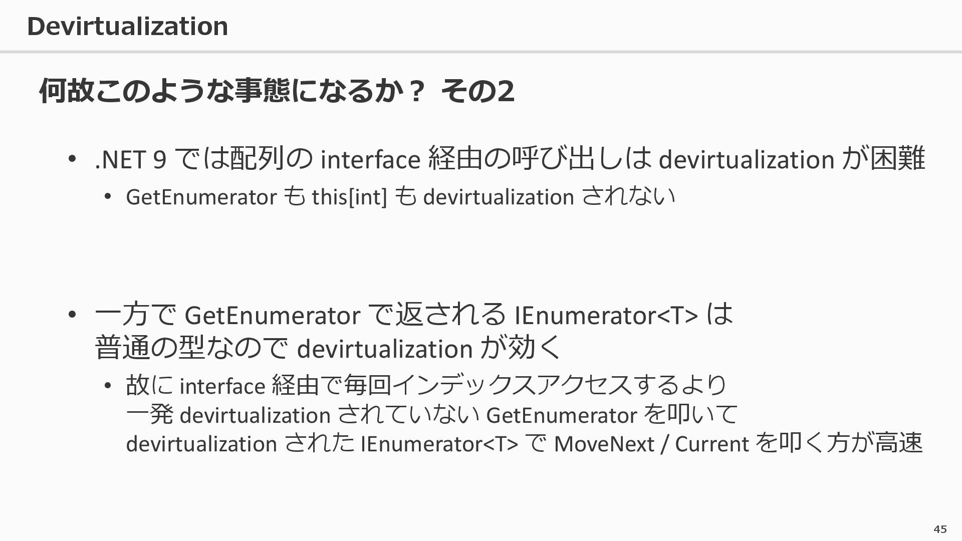 devirtualization が困難 • GetEnumerator も this[int] も devirtualization されない • 一方で GetEnumerator で返される IEnumerator<T> は 普通の型なので devirtualization が効く • 故に interface 経由で毎回インデックスアクセスするより 一発 devirtualization されていない GetEnumerator を叩いて devirtualization された IEnumerator<T> で MoveNext / Current を叩く方が高速