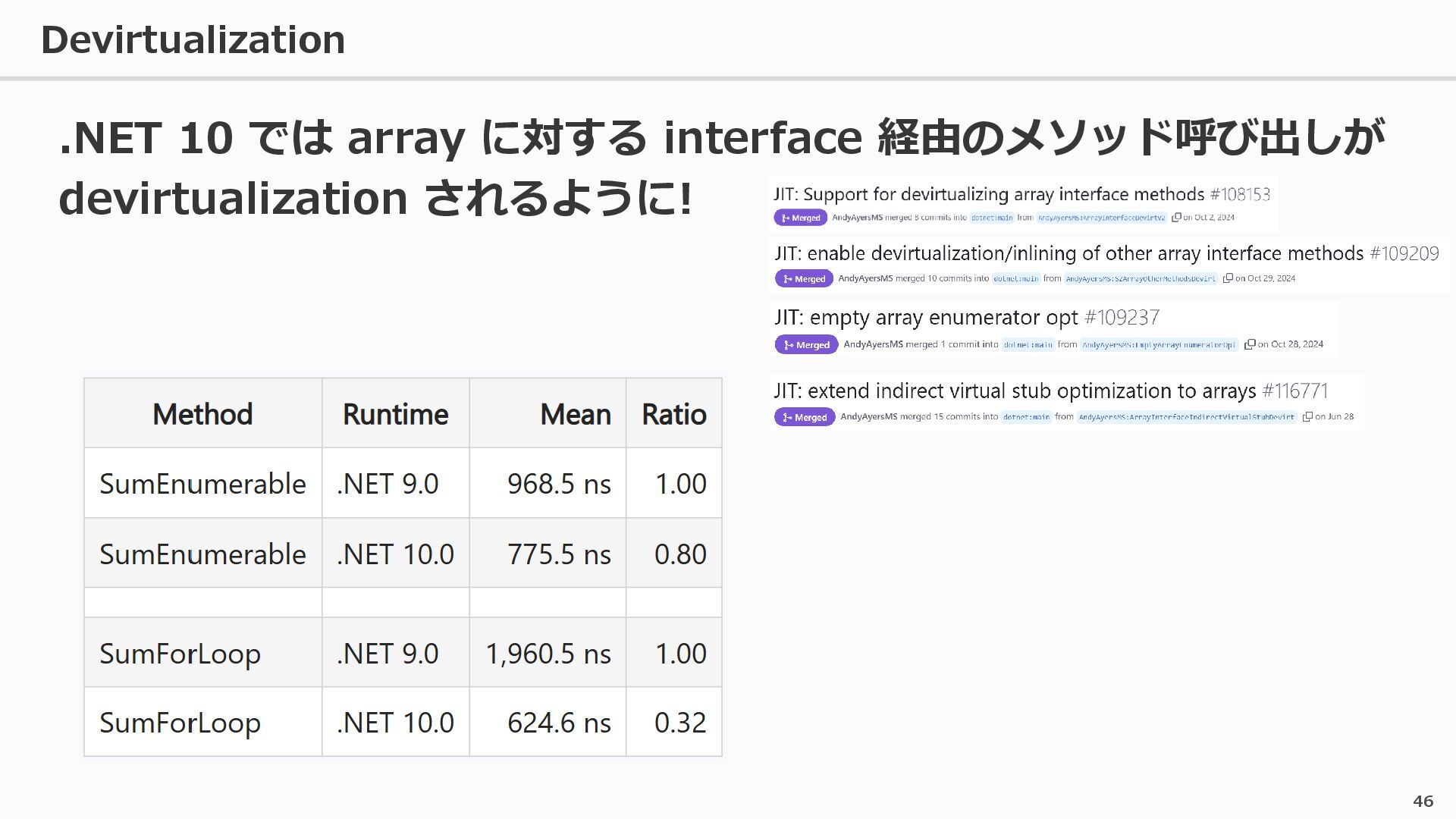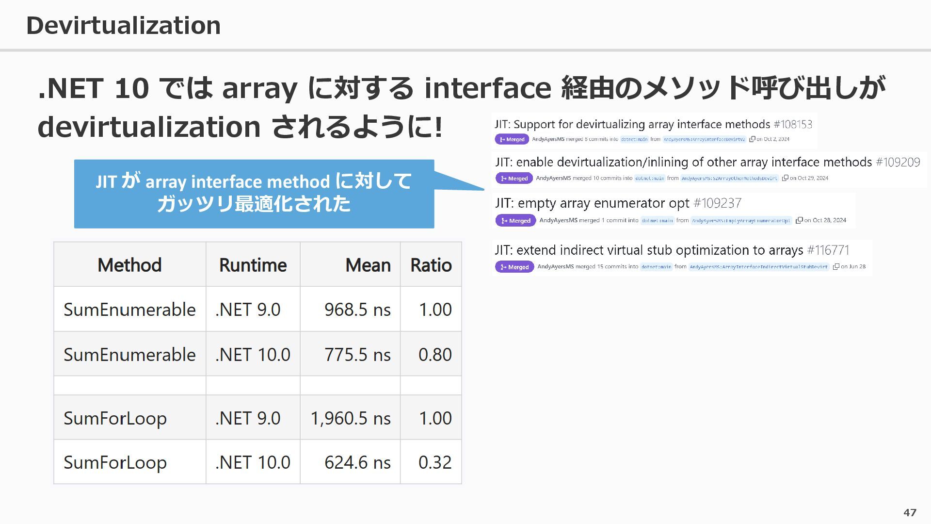 29. Devirtualization 47 .NET 10 では array に対する interface 経由のメソッド呼び出しが devirtualization