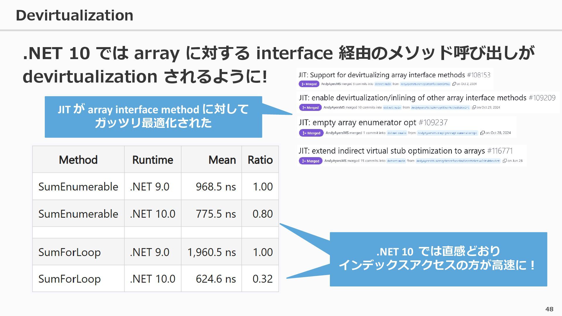 30. Devirtualization 48 .NET 10 では array に対する interface 経由のメソッド呼び出しが devirtualization